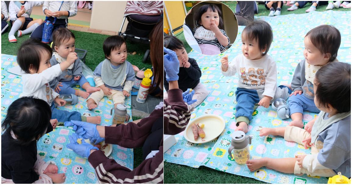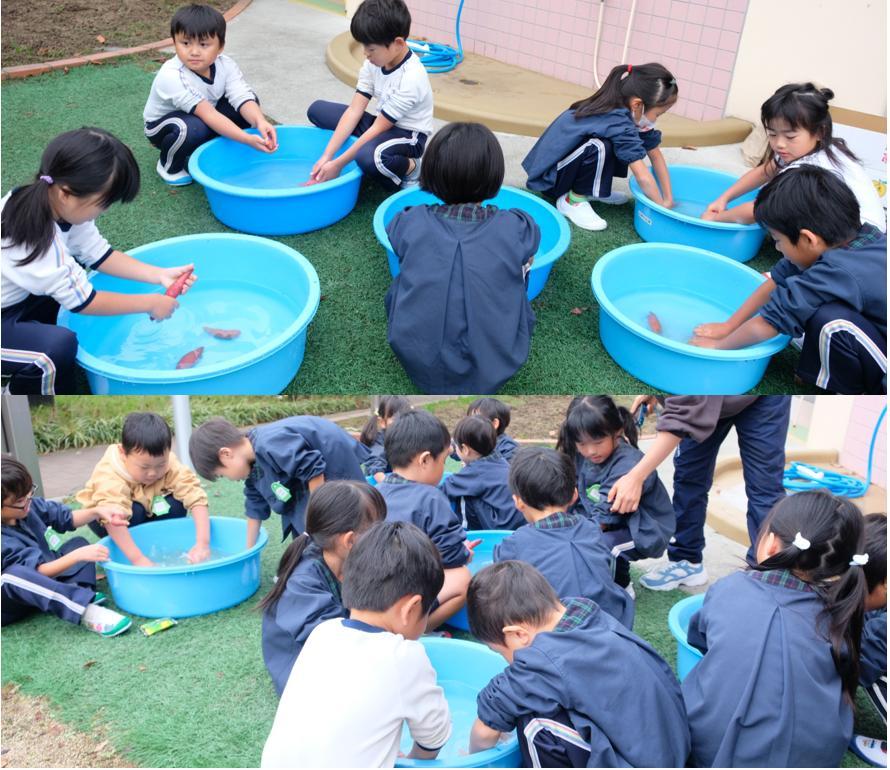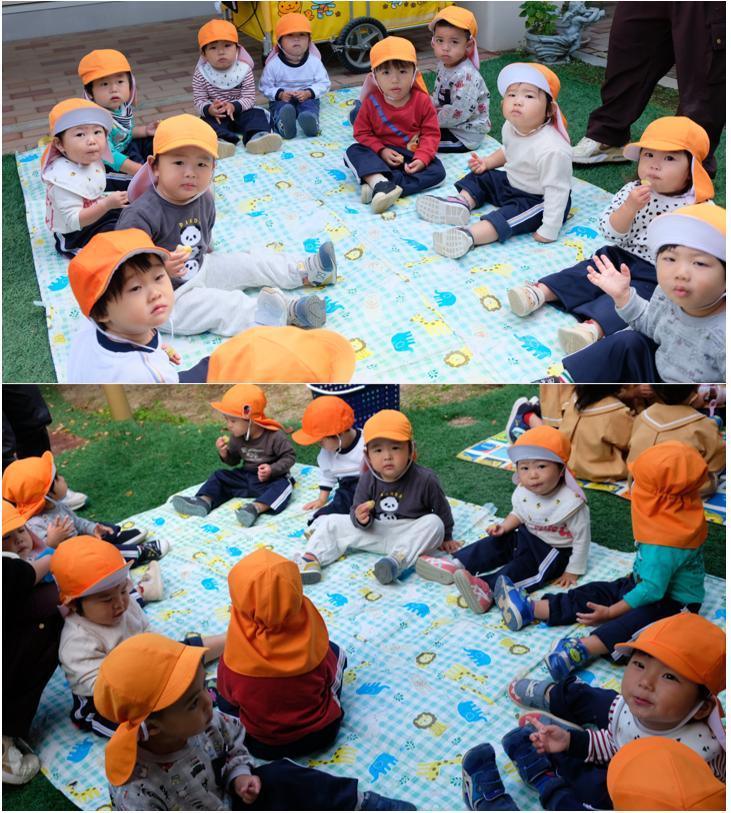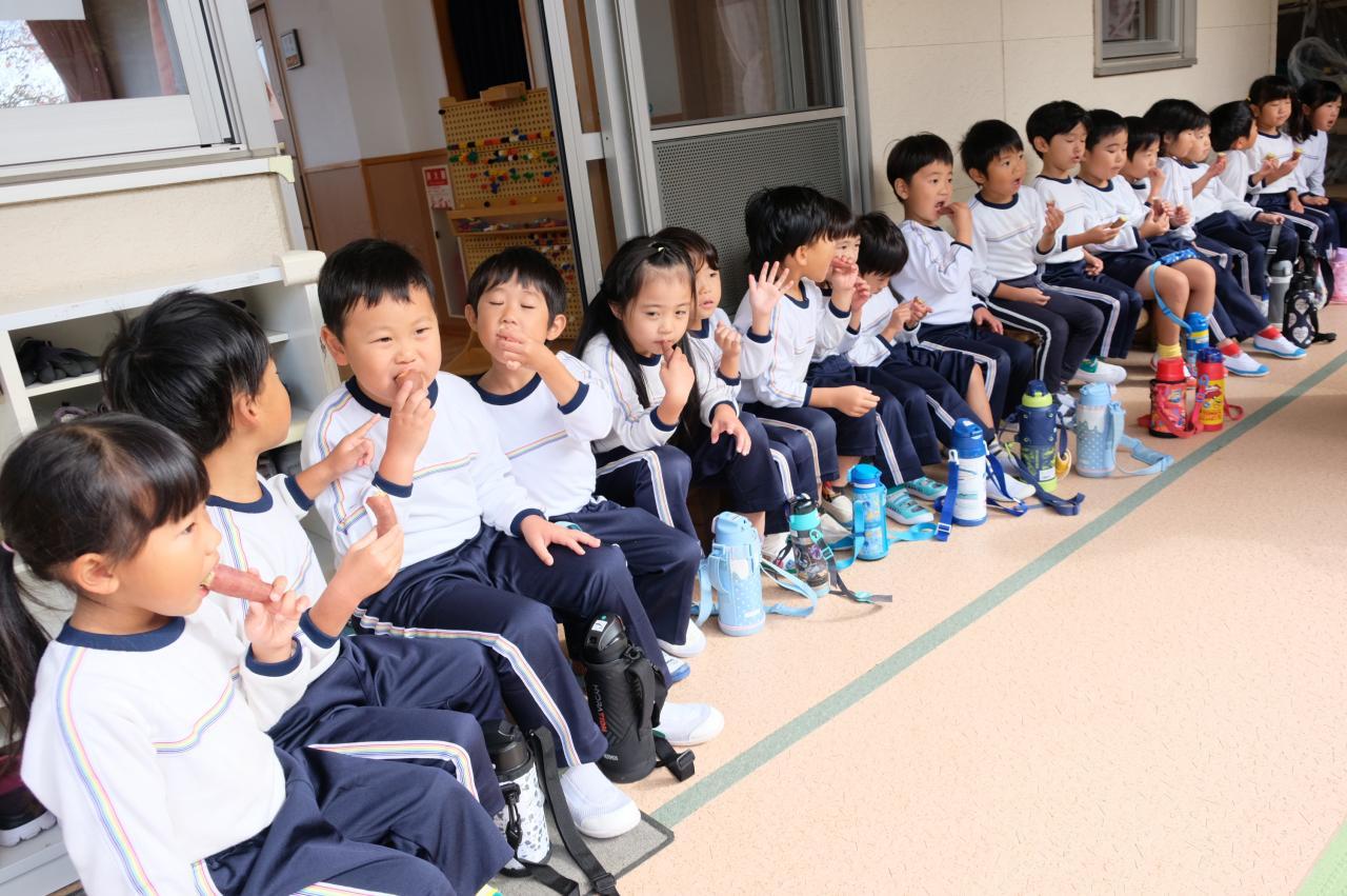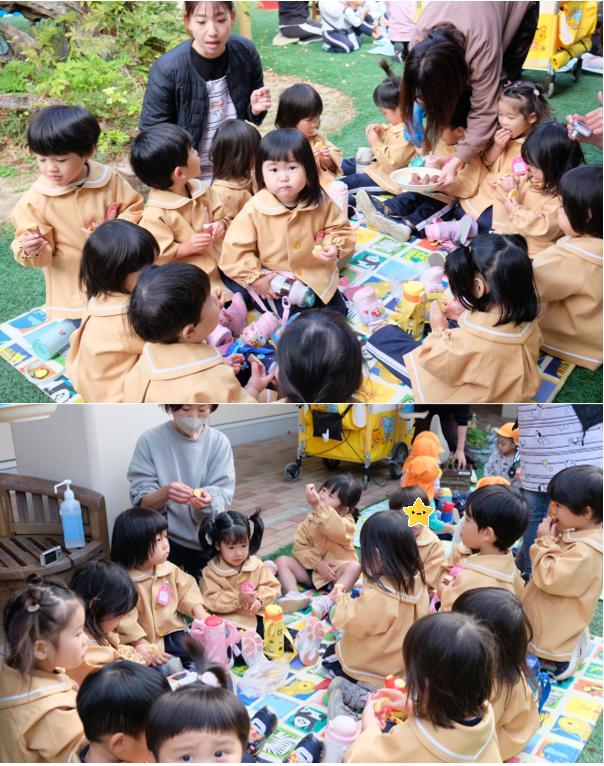 今年は園の畑のさつま芋の育ちがよくなかったので、地域の方がご厚意でくださったさつま芋を使って「ふかし芋会」を開きました。朝早くからさくら組とひまわり組がせっせといもを洗い、薪を焚いてお湯を沸かし、蒸し器を使ってふかし芋を作りました。湯気とともにいい匂いが園庭に広がります。そして、「おいしーー」の声と笑顔が広がりました。食べやすいようにスティック状に切ってもらったふかし芋を見せると、つかみ取って無心に口に押し込む0歳児クラスの子もいました。美味しいものとすぐ分かるのでしょうね。もっともっととせがむ姿が可愛かったです。