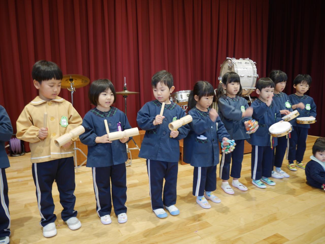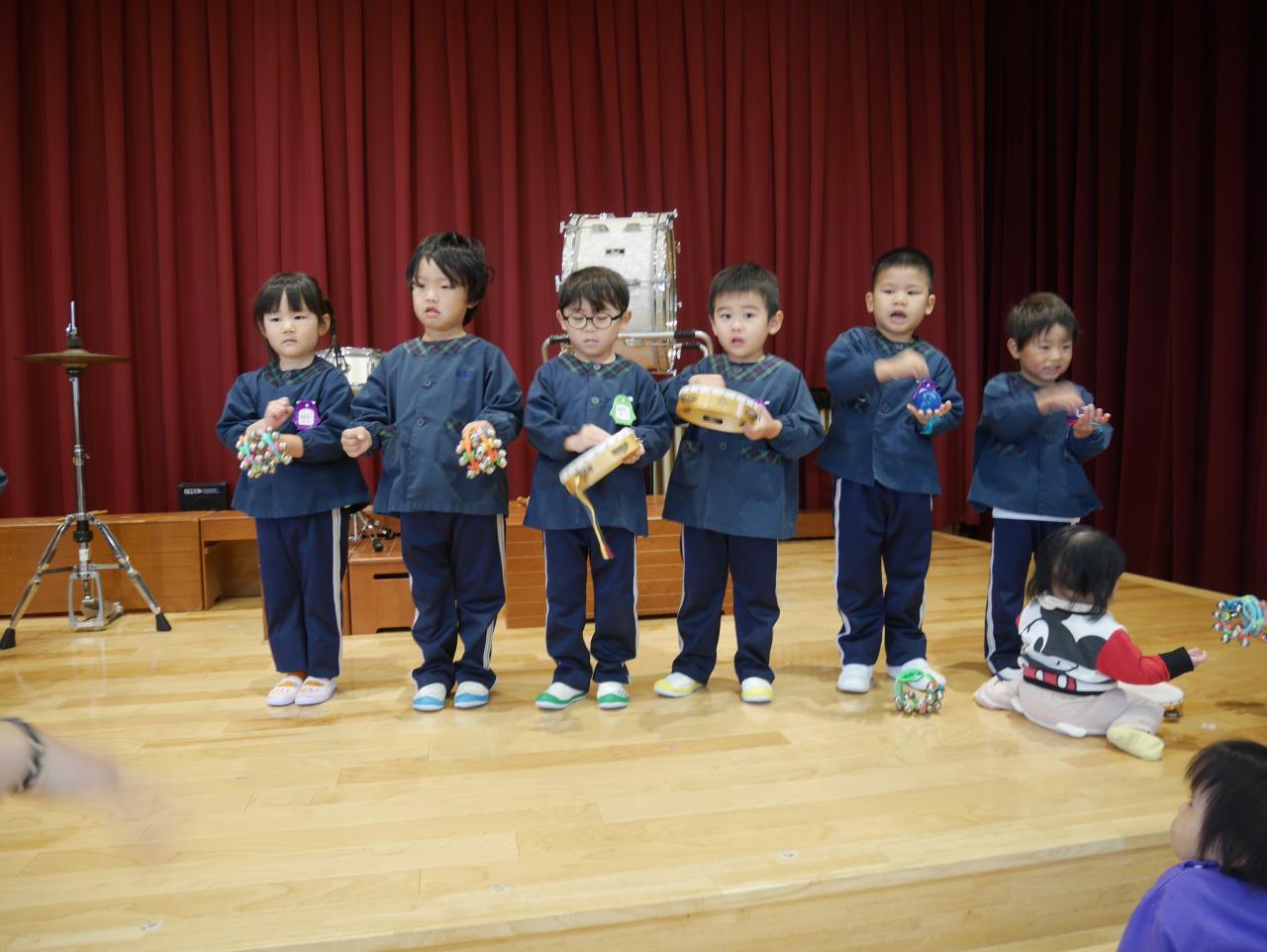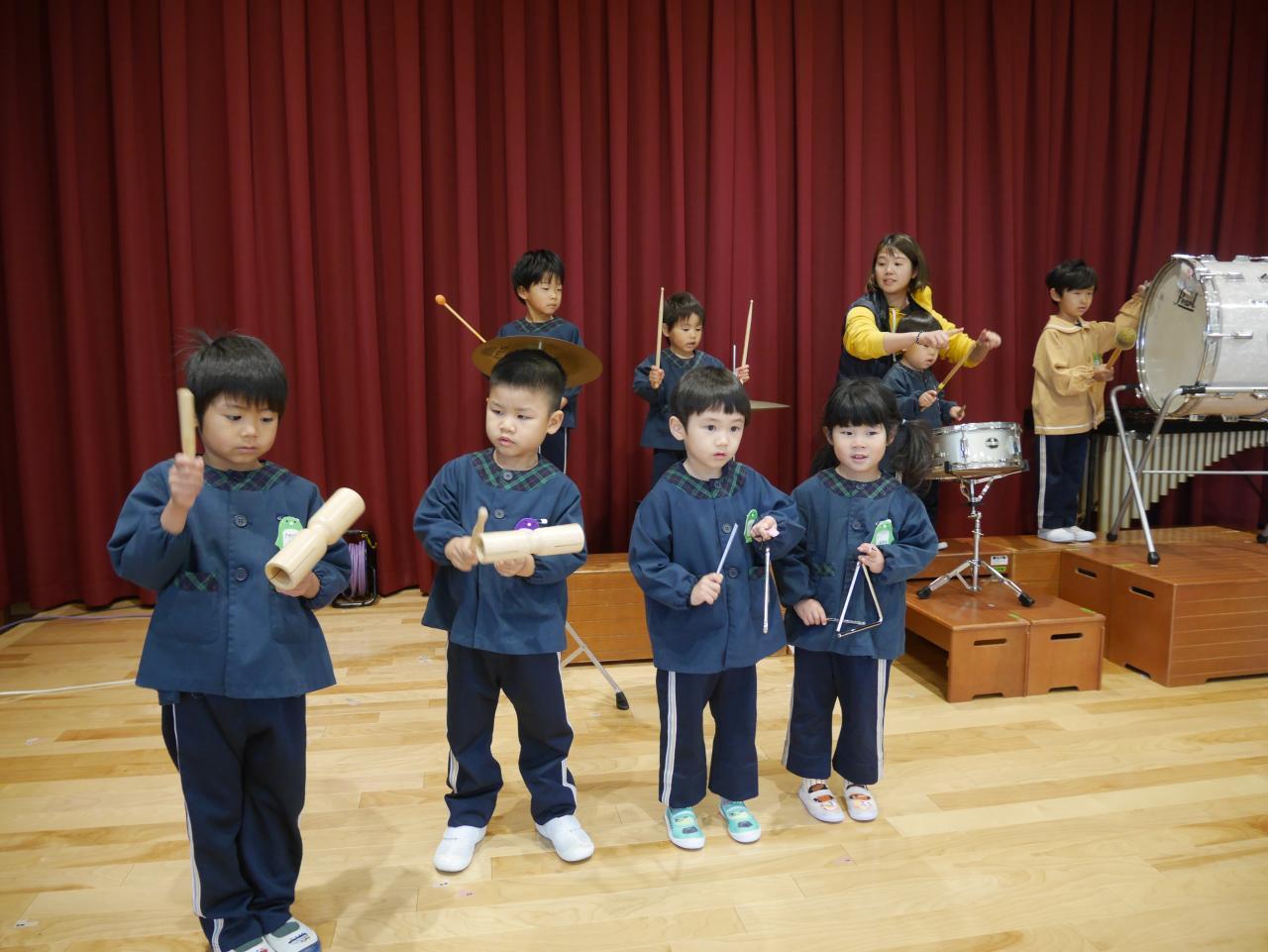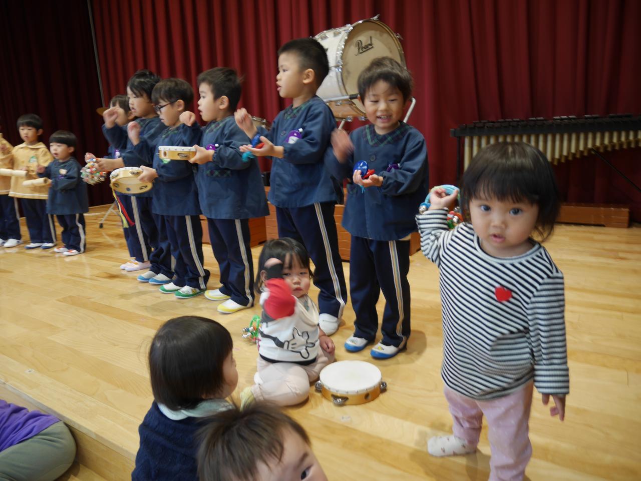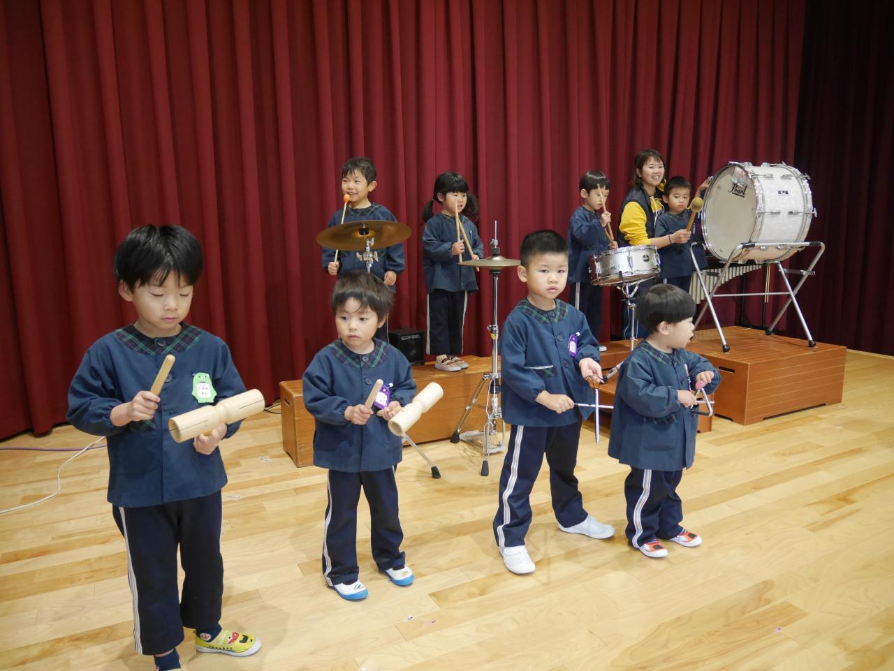 「音楽発表は終わったのですが、子ども達の表現遊びは続いています。今のブームは、「おどるポンポコリン」♪ ということで、ひまわりさんと歌をうたってから好きな楽器で自由奏を楽しみました☺ 何度か音楽教室で触れたことがあるのですが、やはり打楽器が大人気✨ 同じ楽器がしたくなったら、お兄ちゃんにじゃんけんを提案してもらったり、「やだ。僕がしたい」と、自分の意思をしっかり伝えたりして好きな楽器でポンポコリンを演奏しました♬ 自分の好きなタイミングで好きな楽器を演奏し、「たのしかったなー」「またしたいー💕」と、ご満悦な子ども達でした♪
