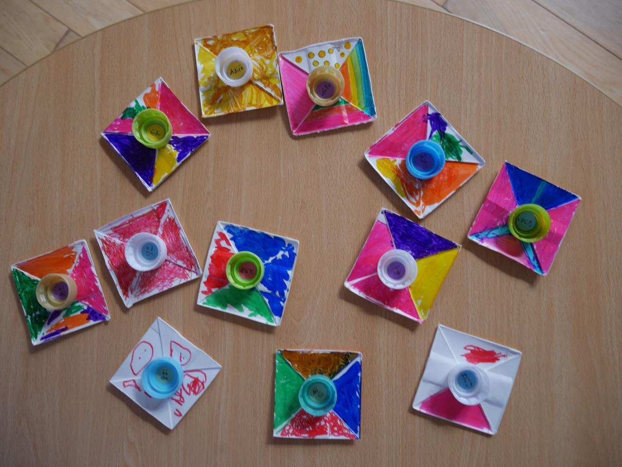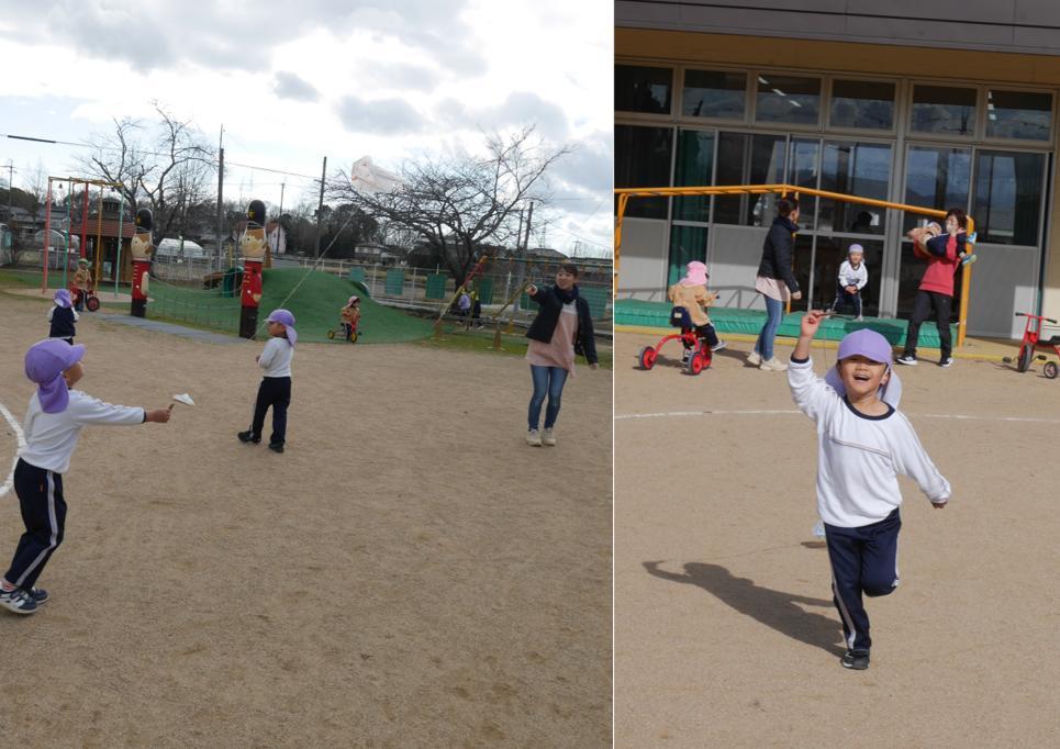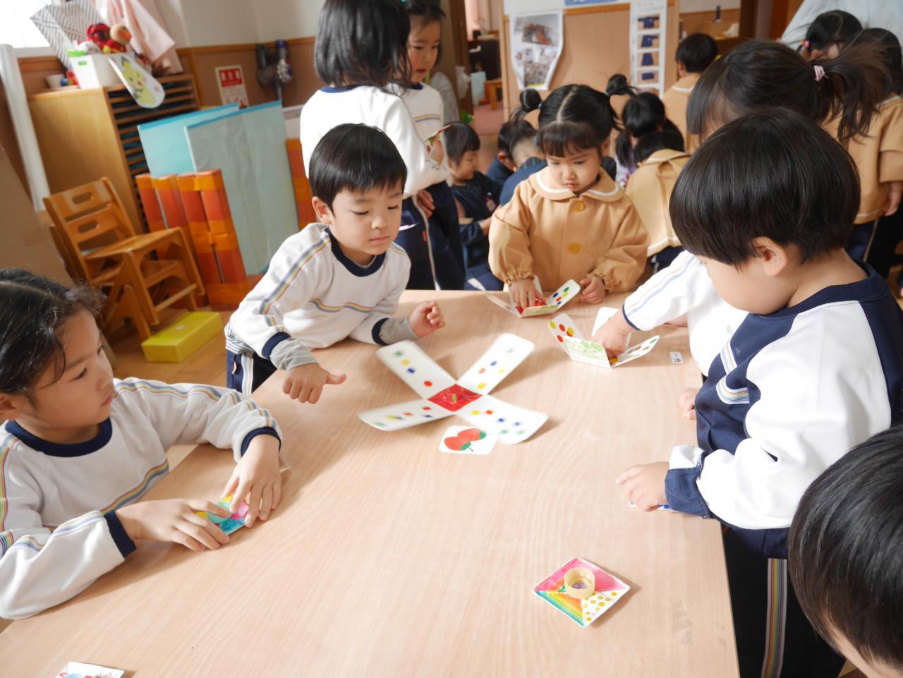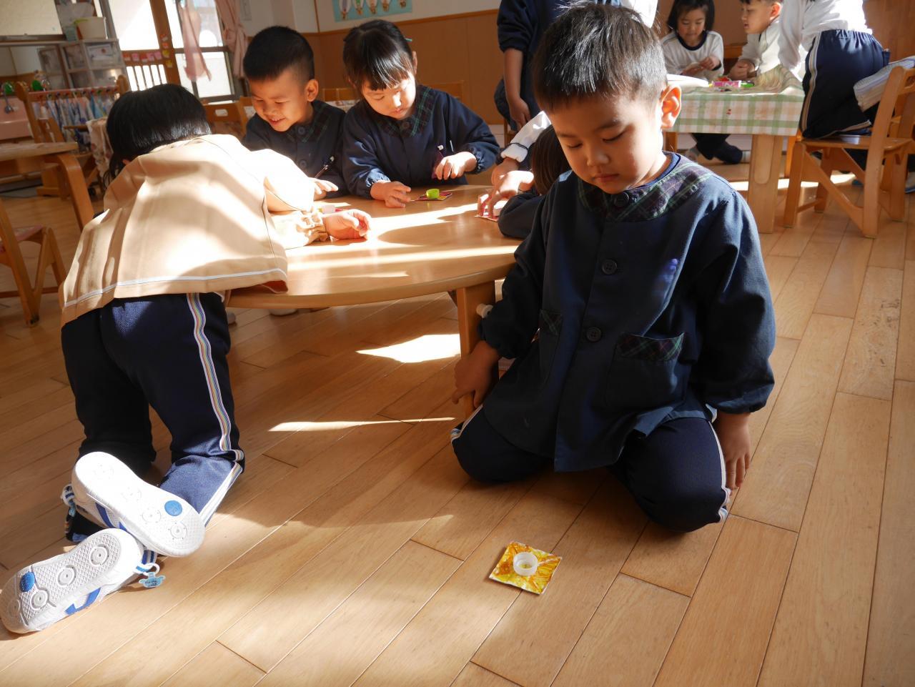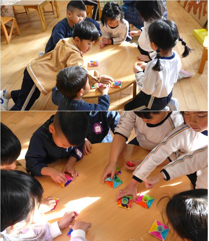 「あけましておめでとうございます!! 本年もどうぞよろしくお願いします☺ 今週はお正月あそびを楽しんでいます。たこ作りをしていると、「家でもしたで~♪」と、教えてくれた子がいました。好きに描いてカラフルなたこ・コマができあがり、喜んで遊んでいます。今日はさくら組もいたので、一緒にコマ作りをしました。作った子から回し合いをしたり、お互いのコマの評価をし合ったりして喜んでいました。みんなで一斉に勝負もして楽しんでいると、すみれさんもコマを作ったと教えてくれ、みんなで回して楽しみました💞」・・・ゆり組より