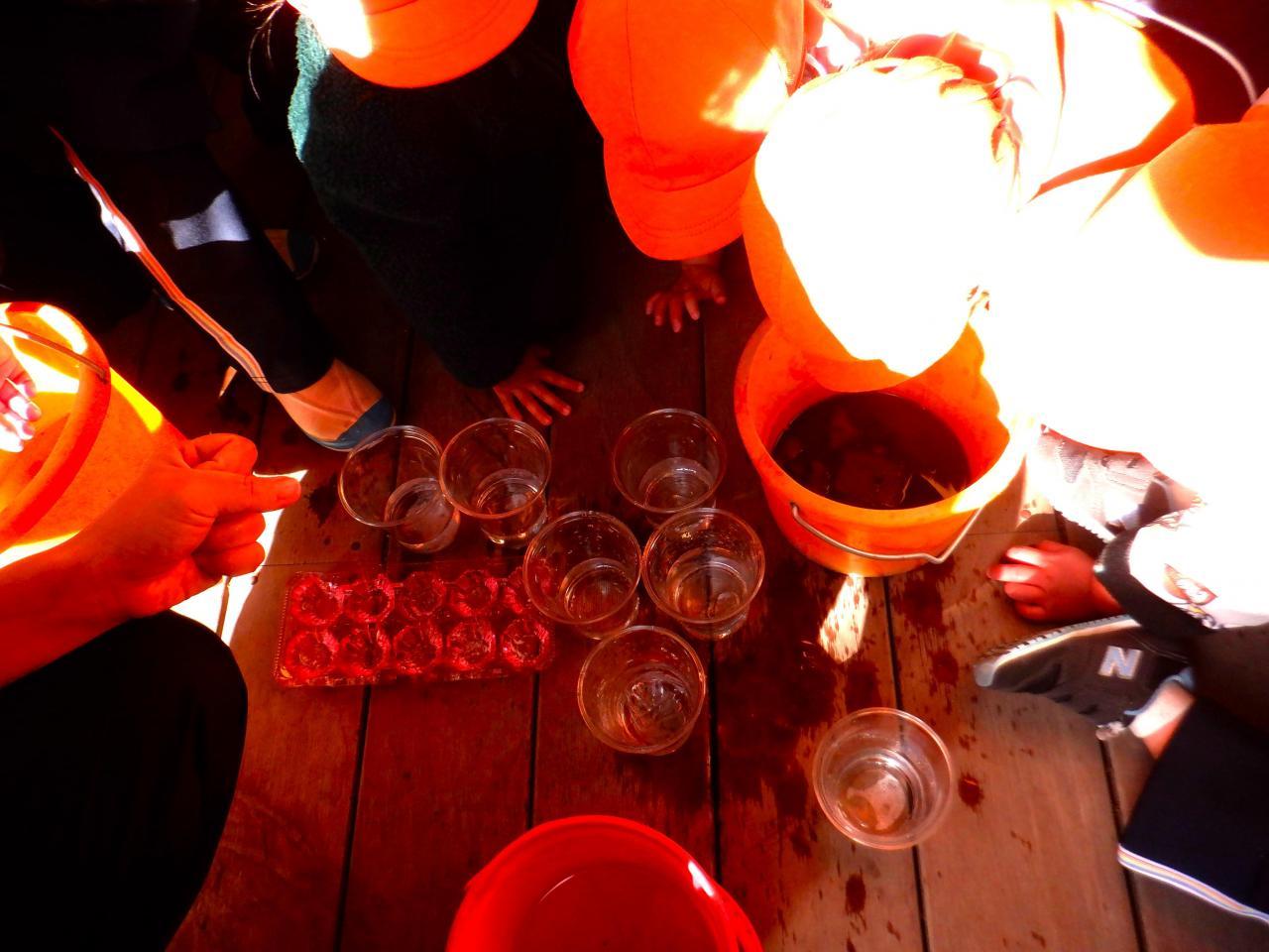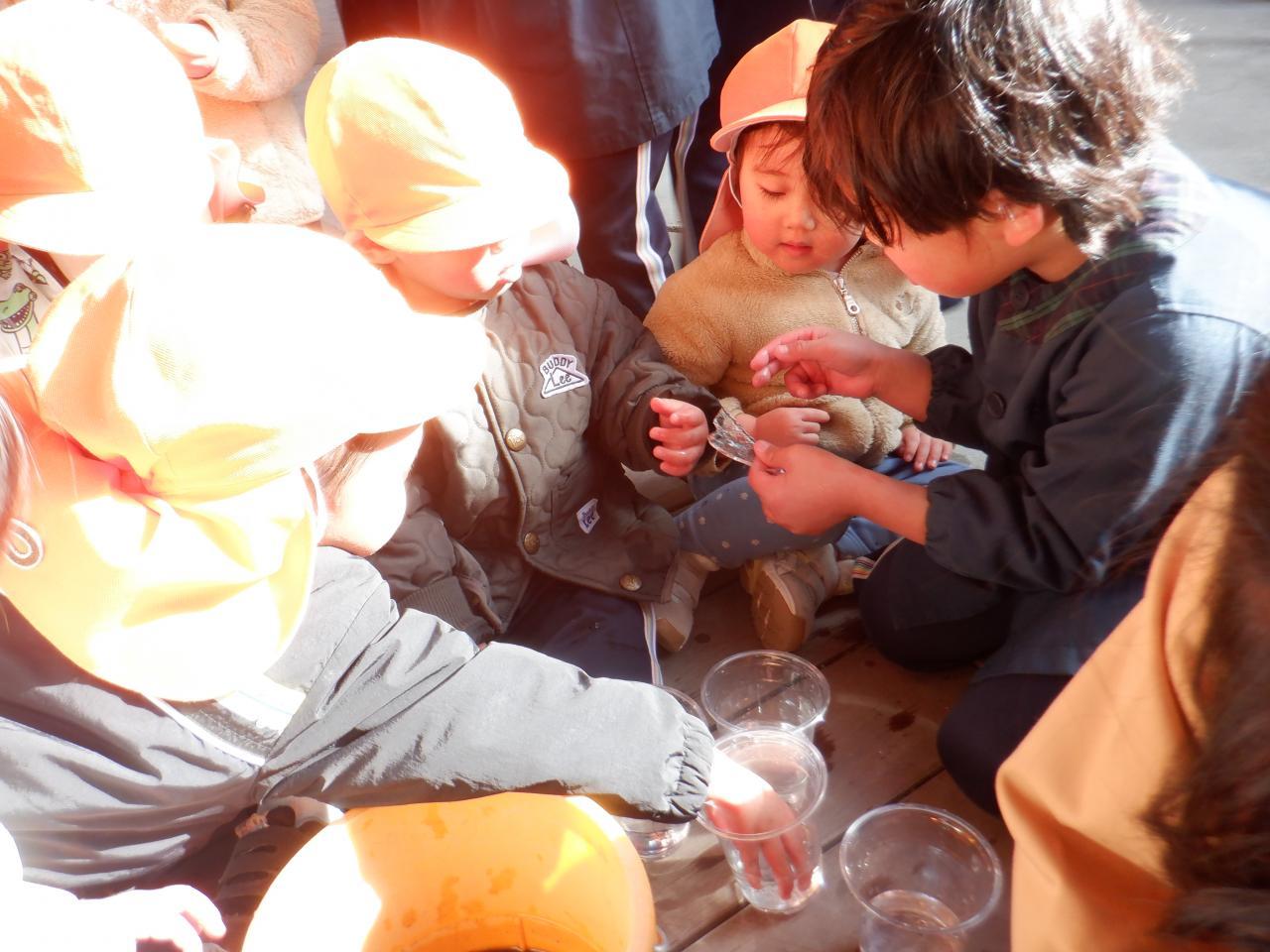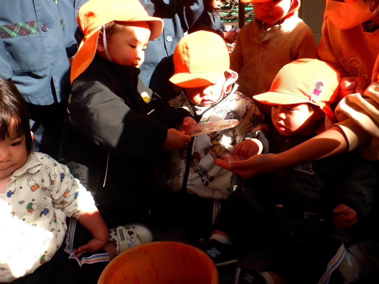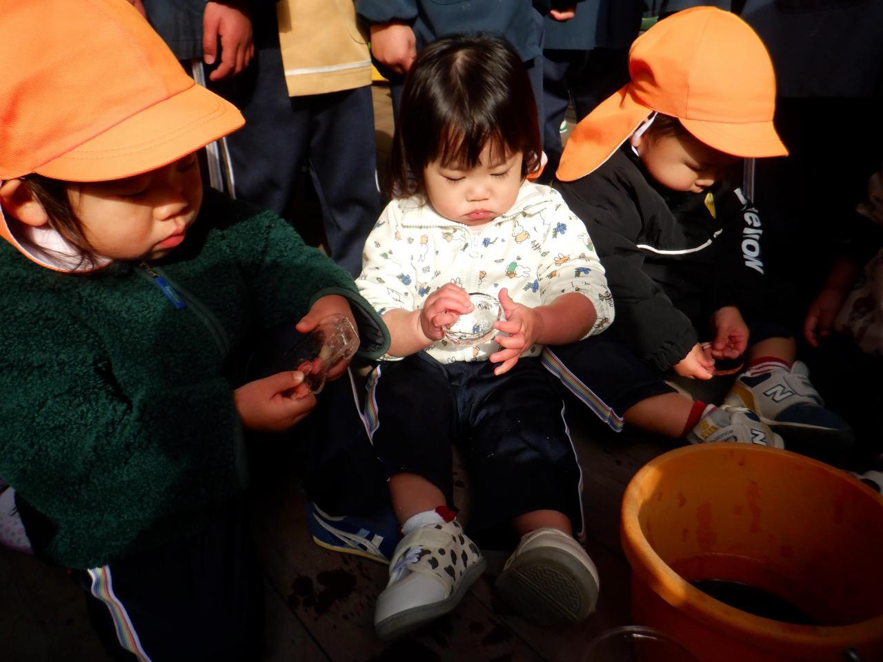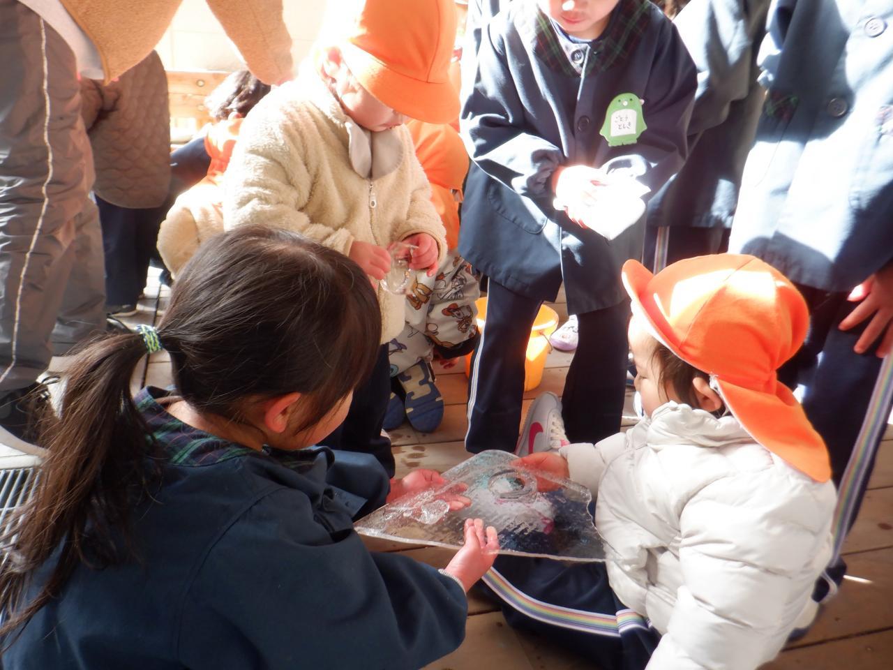 「寒~いある日。みんなで前もって仕込んでおいたお水容器を見に行くと・・・できていました✨そう!氷!! みんな興味津々👀 そこへ、ひまわり組のお友達が「ももさんも氷つくったん?ひまわり組もつくったで~!!」と声をかけてくれ、「見せたろか~?」と、持ってきてくれました✨ もも組の氷より大きくて、厚くて、いろいろな形、色がある氷で、さらに興味津々😀 手に取って冷たさを感じたり、氷の中の水泡を見たり、割れることを知ったり、踏むとパリパリと音が鳴ったり・・☺ いろいろな発見があり、冬ならではの自然現象に触れることができました✨ やさしいひまわり組さん、立派な氷を見せてくれてありがとう💙」・・・もも1組より