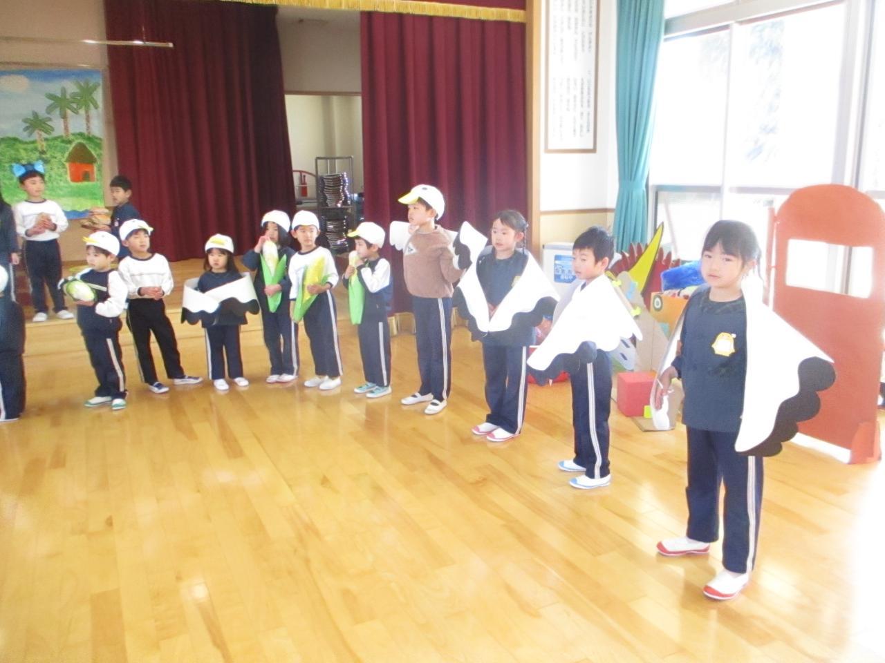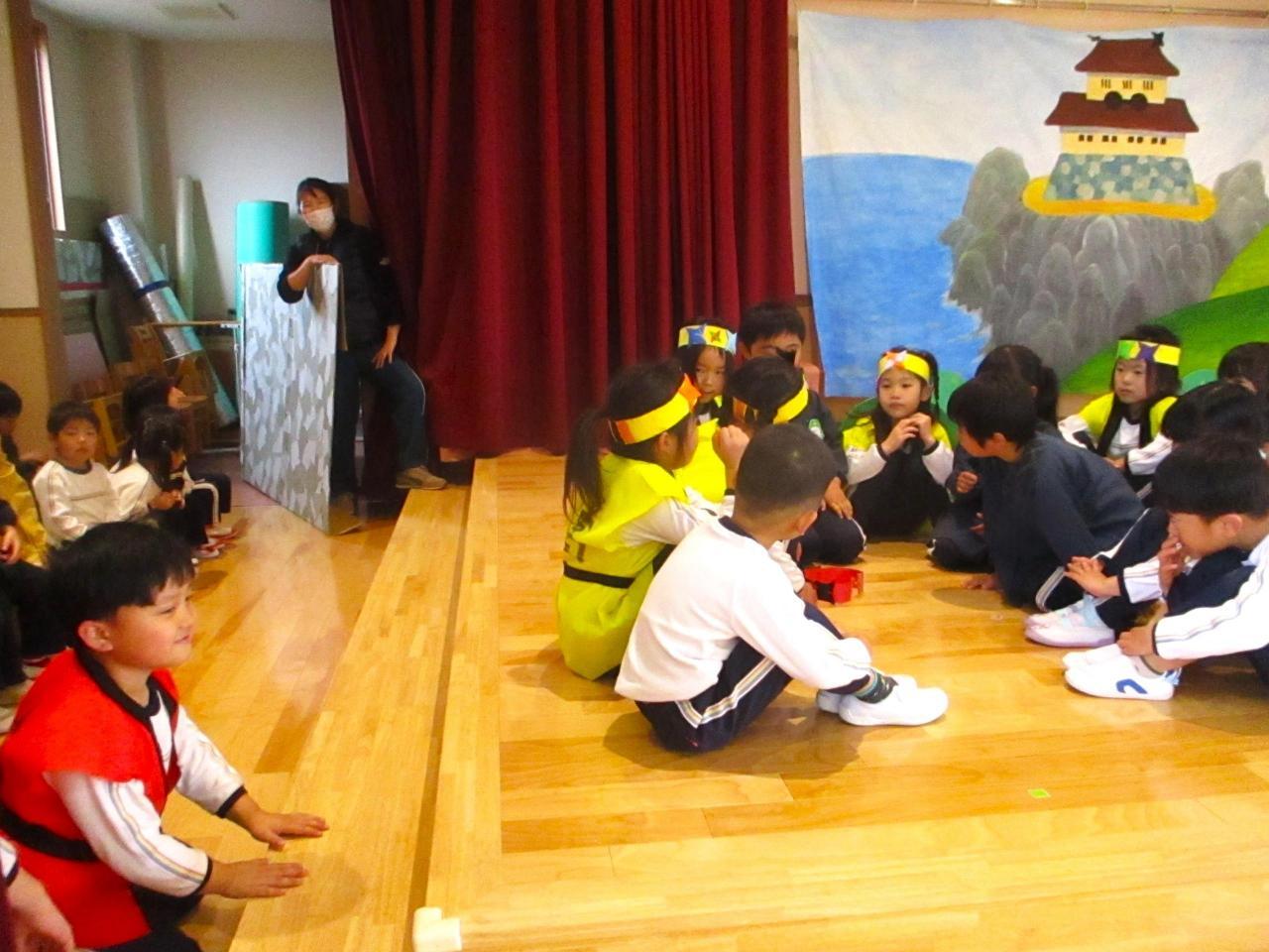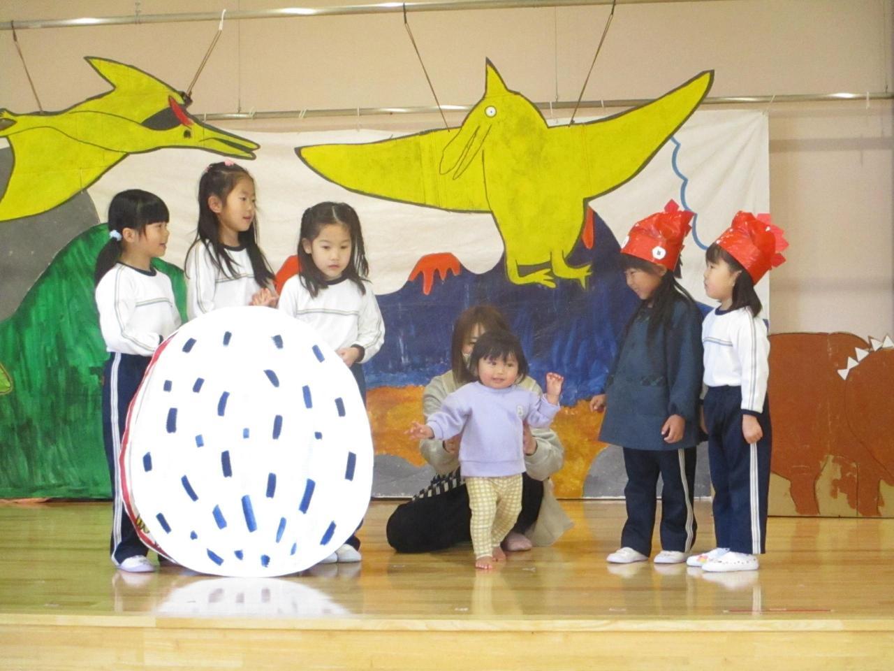 「生活発表会を通して、「役になり切ること」「お友達と一緒に表現すること」がさらに好きになった子ども達☺ 今度はお互いの劇に参加し合って、別の世界観を楽しんでいます。3~5歳児で一緒に「迷子のたまご」のお父さん・お母さん恐竜を探したり、ネコとあほうどりになってコロッケを味わったり、好きな忍者になって修行したり闘ったり・・・⭐「なかよしの術」でもーっと仲良しになったので、一緒に給食も食べましたよ💛 一緒に演じる中で新しいセリフや表現も生まれていて、わくわくがどんどん膨らんでいます!」・・・さくら、ひまわり、ゆり組より