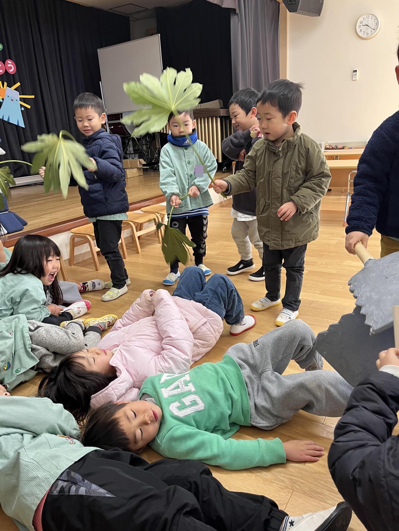 お話に出てくる登場人物になりきったり、劇に出てくる歌を口ずさんだり、