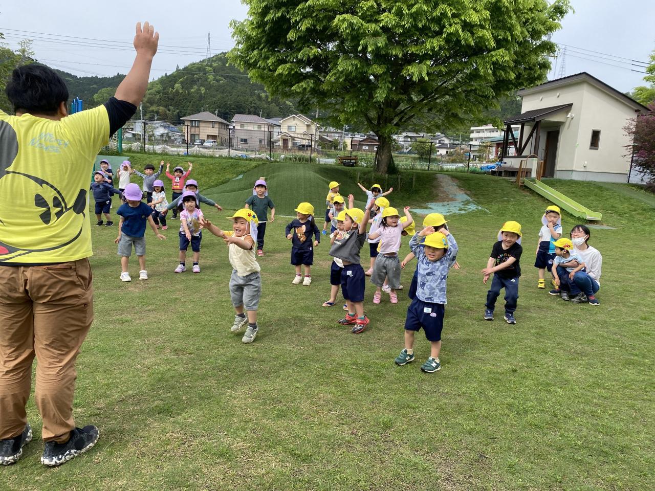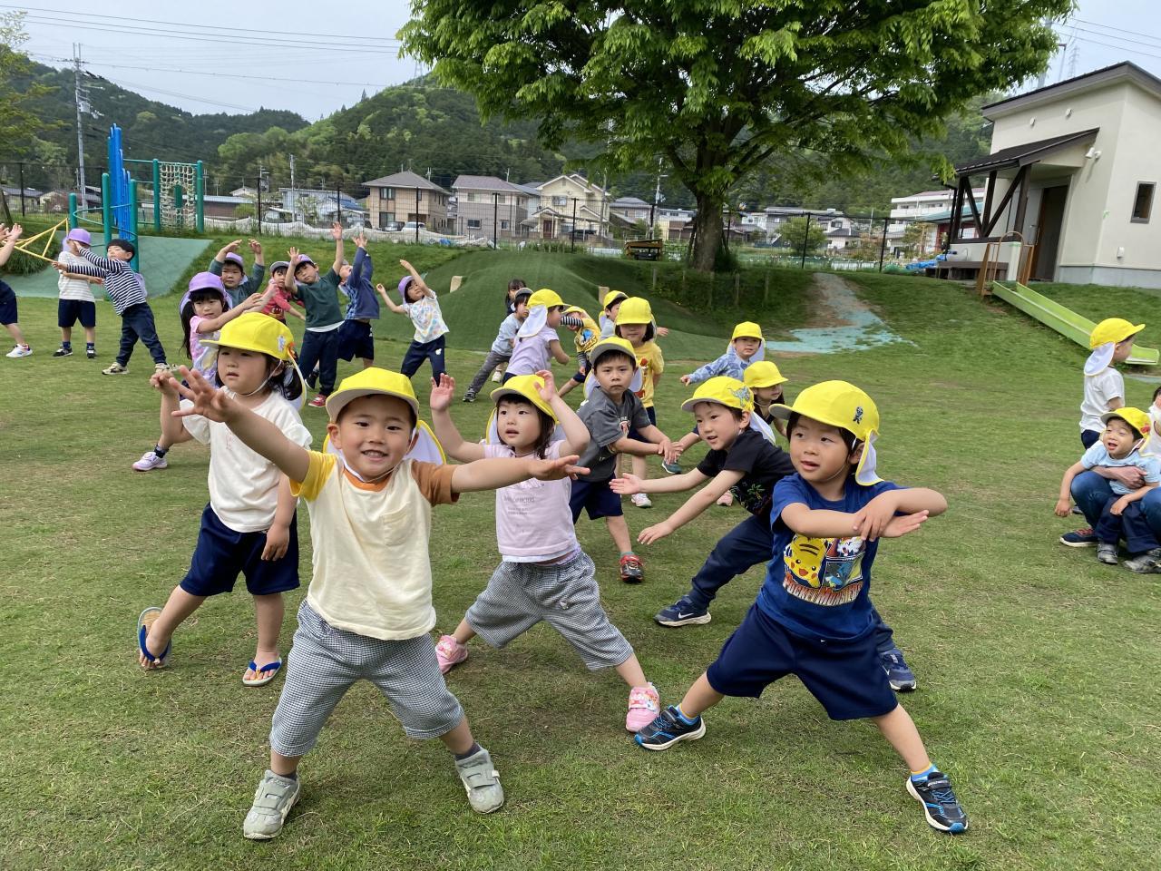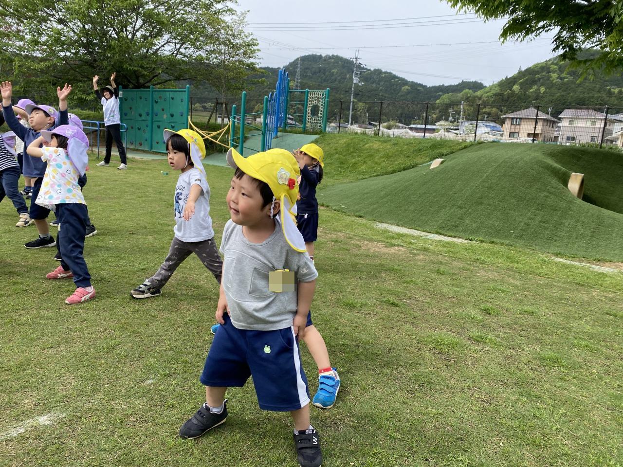 外遊びの時に、体操を楽しみました♪リズムに乗って体を動かすことを楽しんでいましたよ。