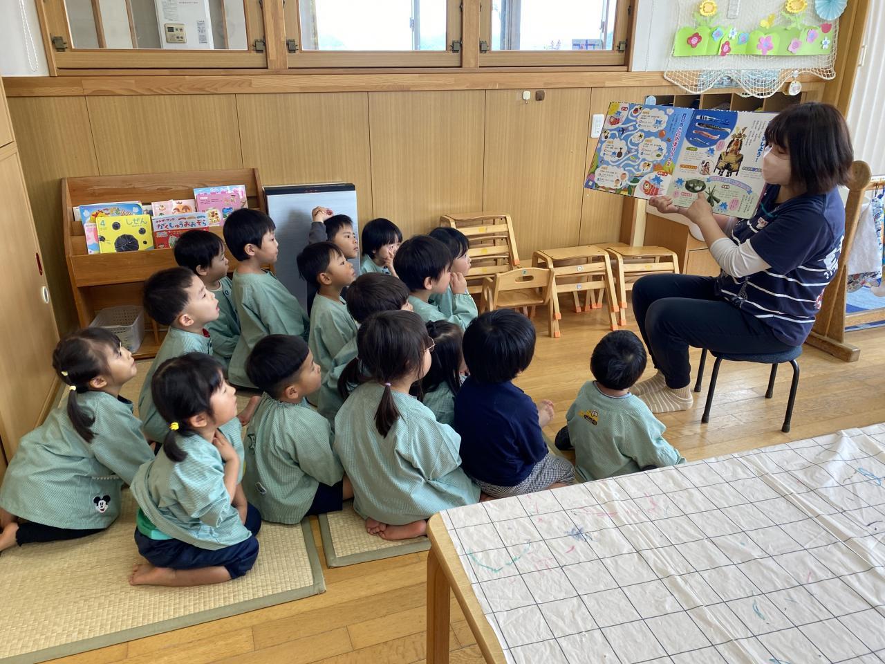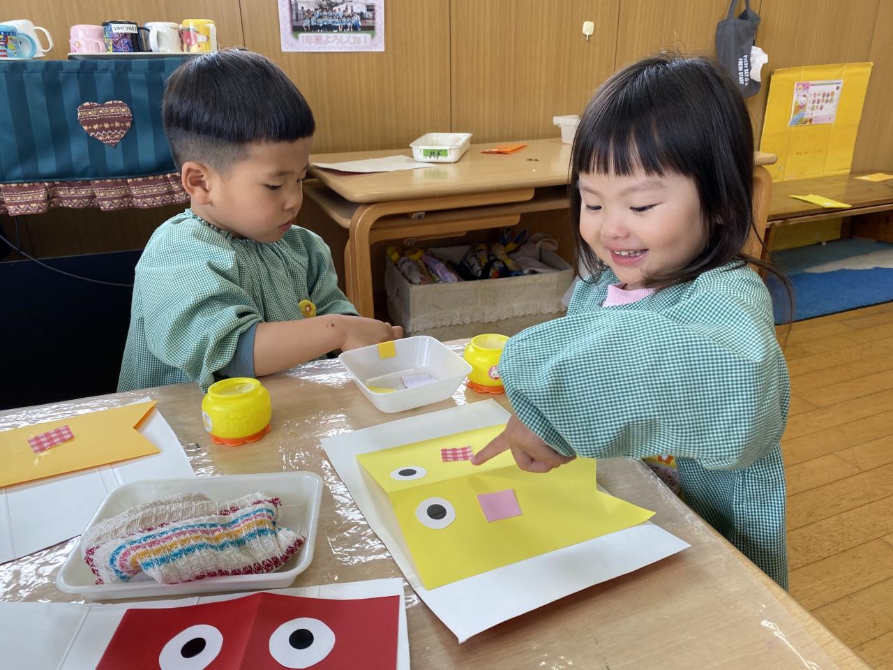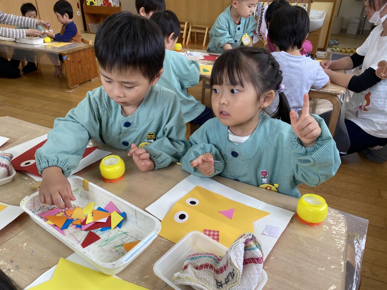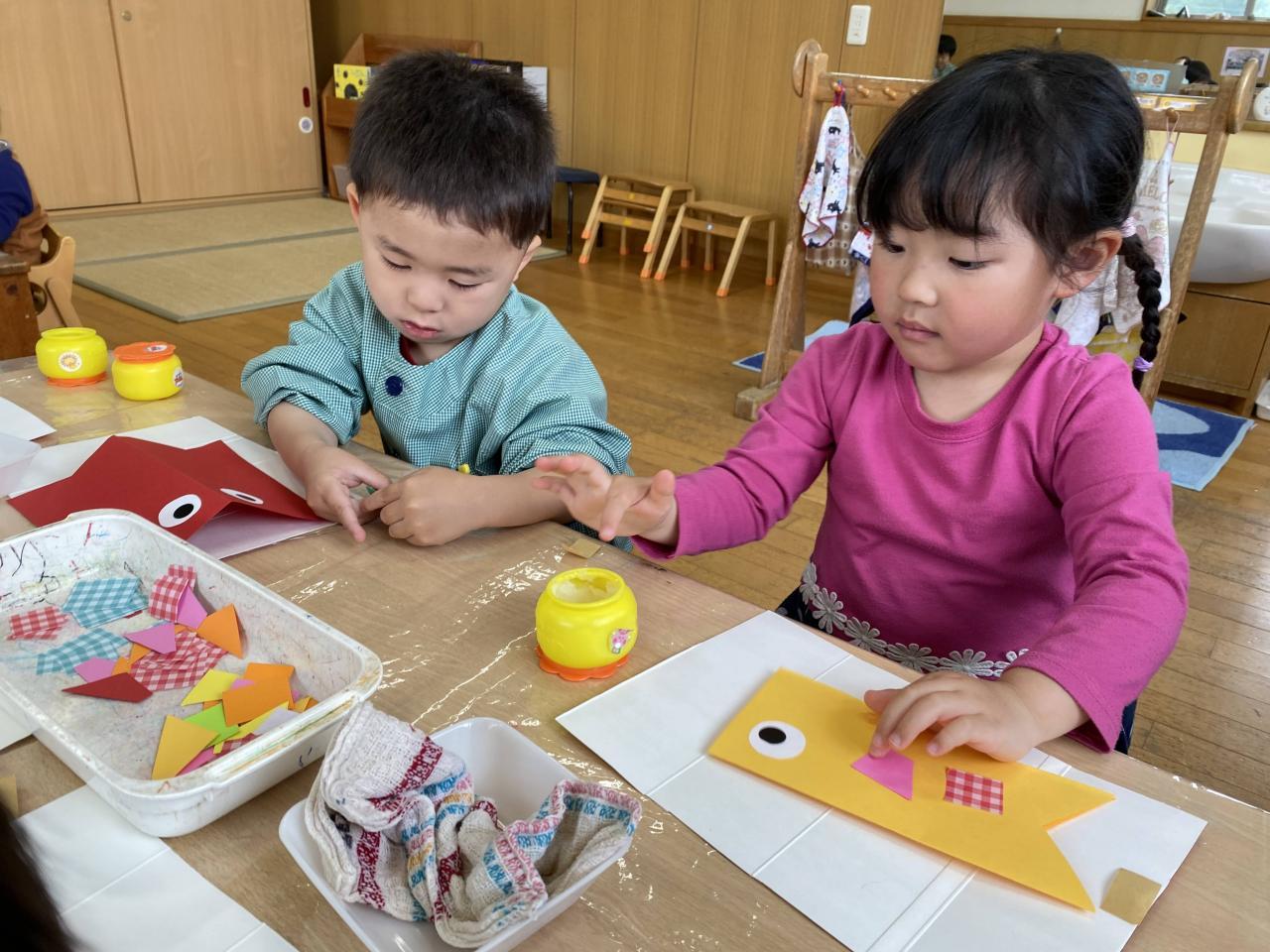 二つめのこいのぼりにはシールで目を貼り、のりで画用紙を貼って模様にしましたよ。のりのお約束もよく聞いて、守っている子が多く驚きました👏
