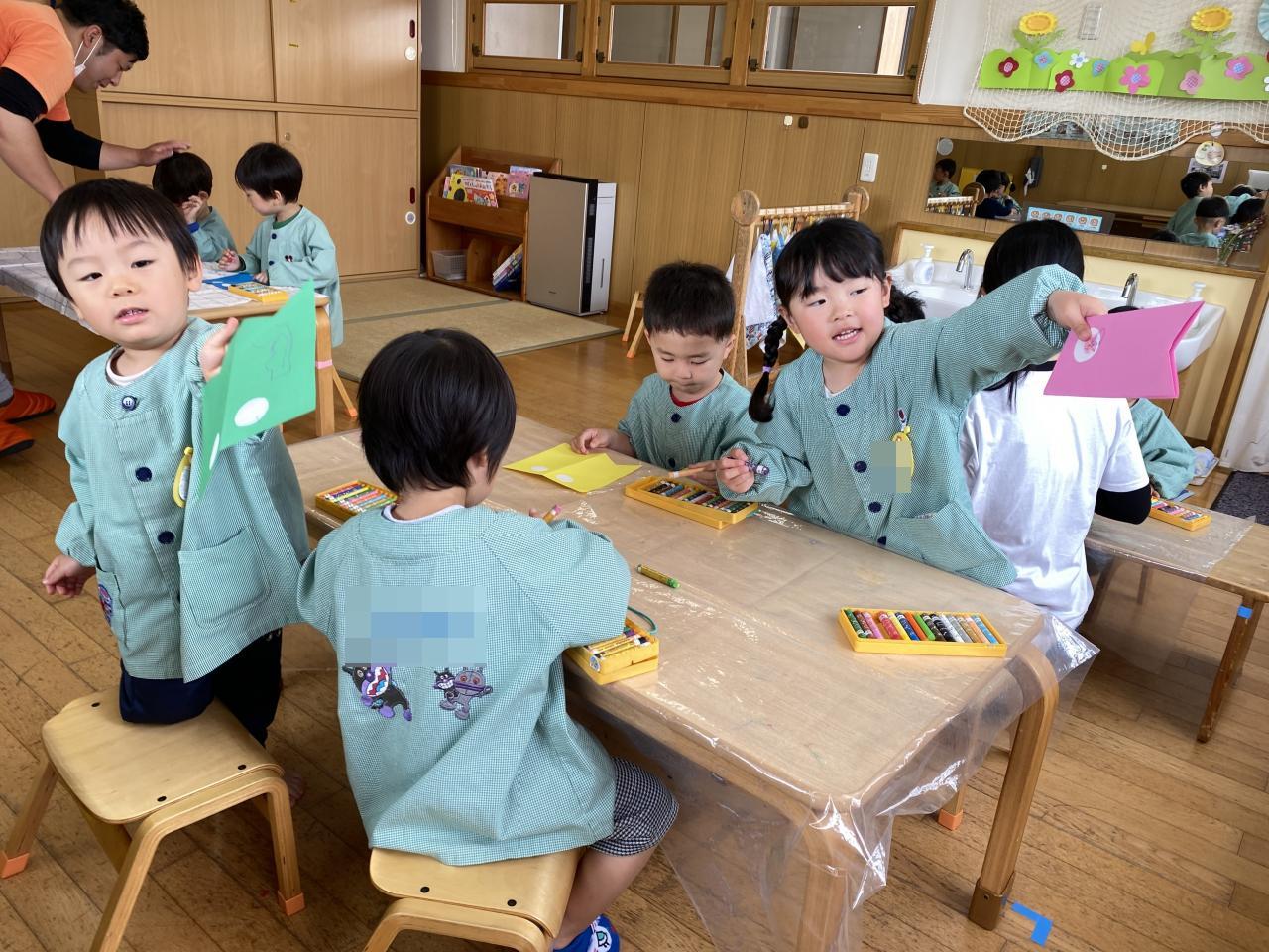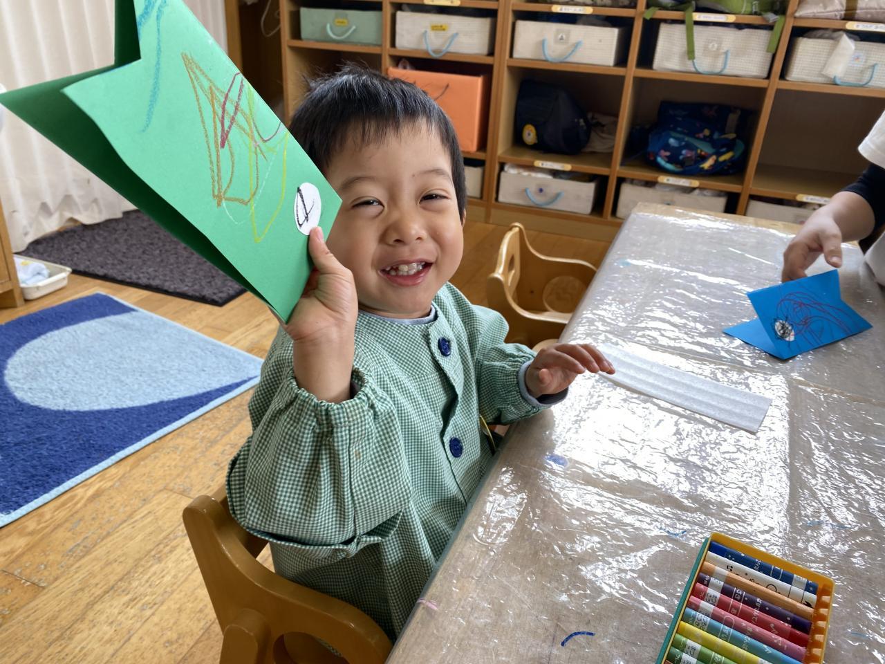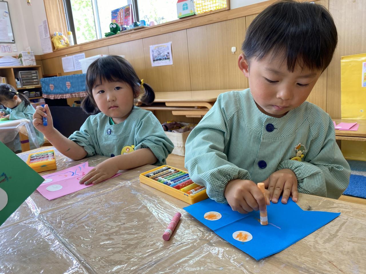 一つめのこいのぼりには、クレヨンで目と模様を描きました「僕はあおい目!」「私はピンク~」と自由に模様を描いていました✨