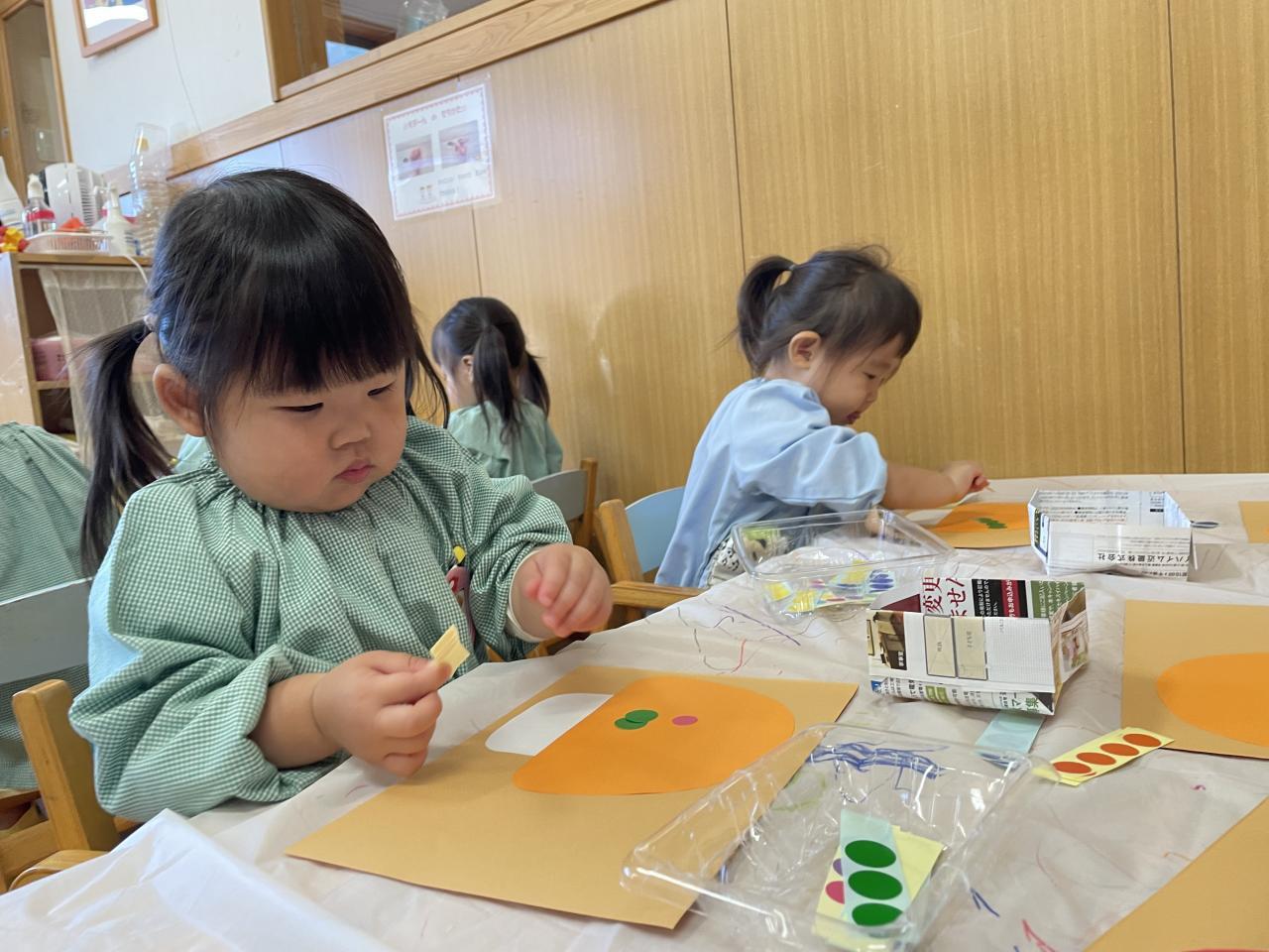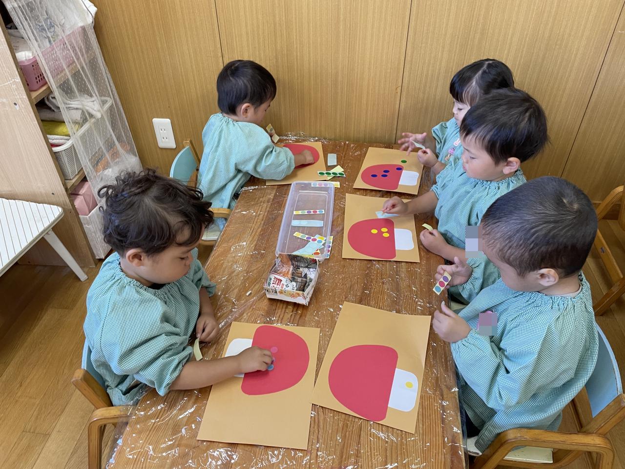 きのこの製作をしたよ!きのこの形をした画用紙に丸シールを貼りました。指先の使い方が巧みになってきて、上手にシールを剥がしたり貼ったりできるようになりましたよ😄