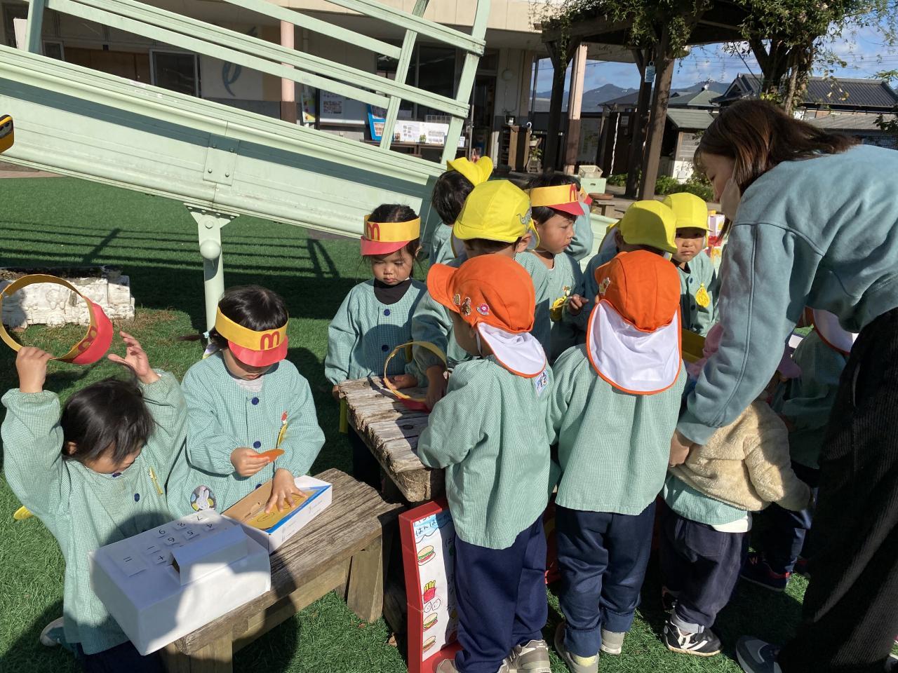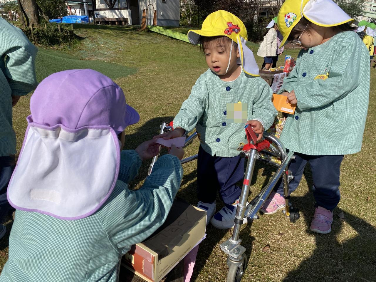 「お店屋さん、開店で~す!」の声と鐘の音が聞こえると、みんな一斉にお買い物へ🏃お店屋さんも「いらっしゃい、いらっしゃ~い!」と声をはりあげます😄❗