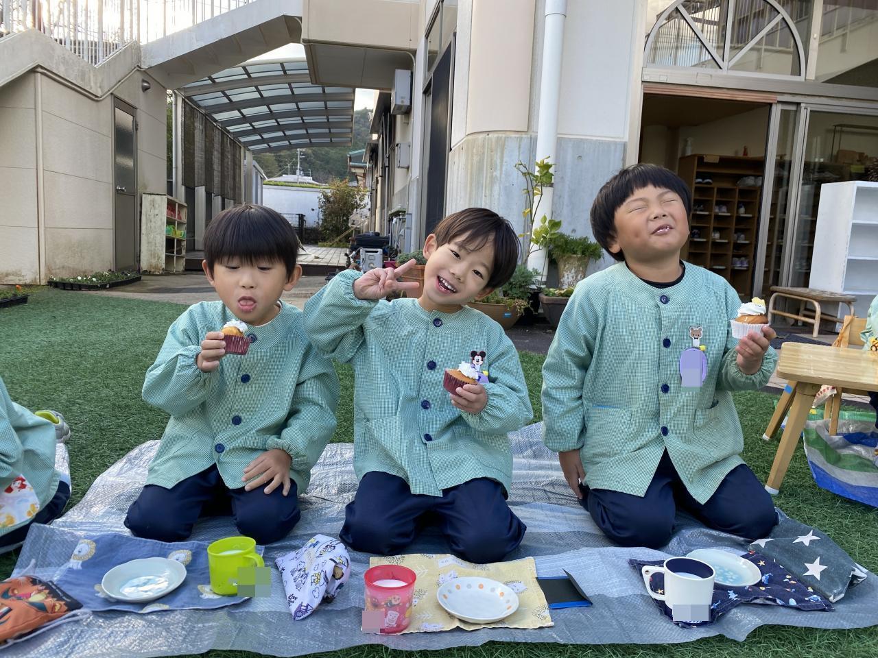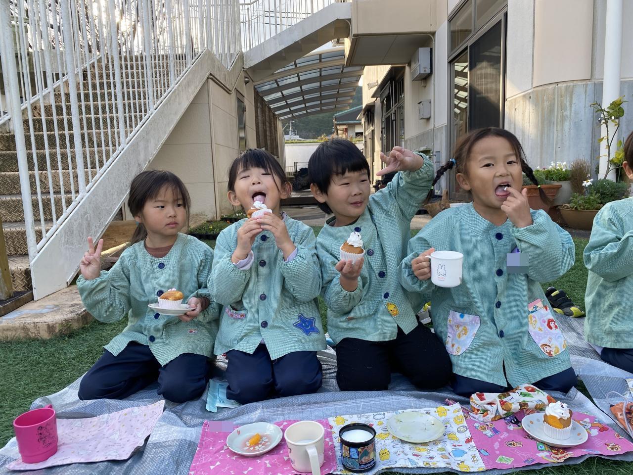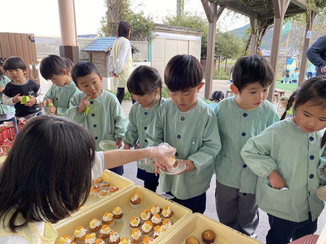 おやつの時には給食の先生のおやつやさんが開き、かわいいカップケーキに目がキラキラ✨✨