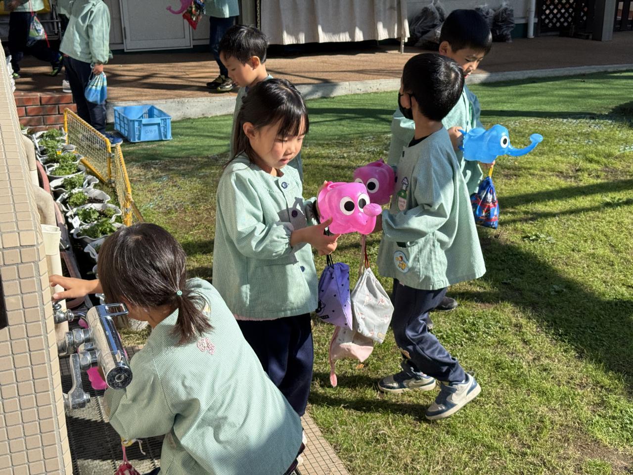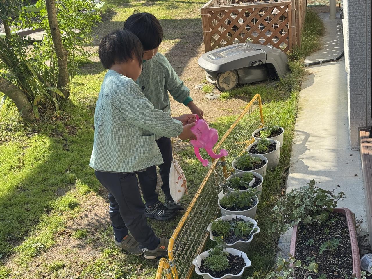 少し前、花に向かって「元気にしてる~?」と話しかけている子がいました。ステキだな~と思って、「お花は話しかけてあげると綺麗に元気に育つらしいよ😄」と声をかけると、最近ではたくさんの子ども達が部屋に戻ってくるたびに「ただいま~」「咲いたかなぁ」「元気?」など、たくさん話しかけている光景を目にするようになりました🥰
