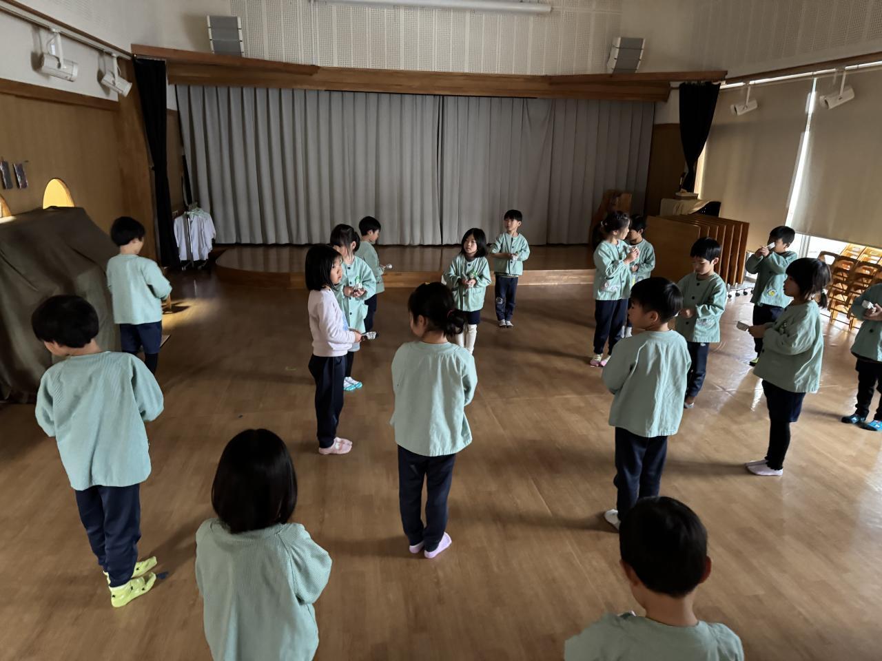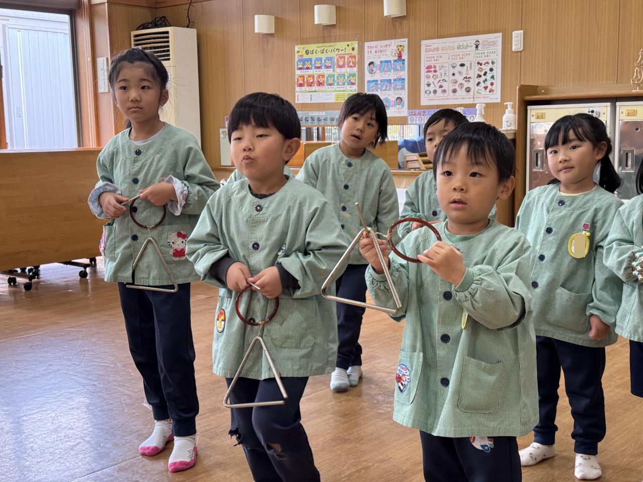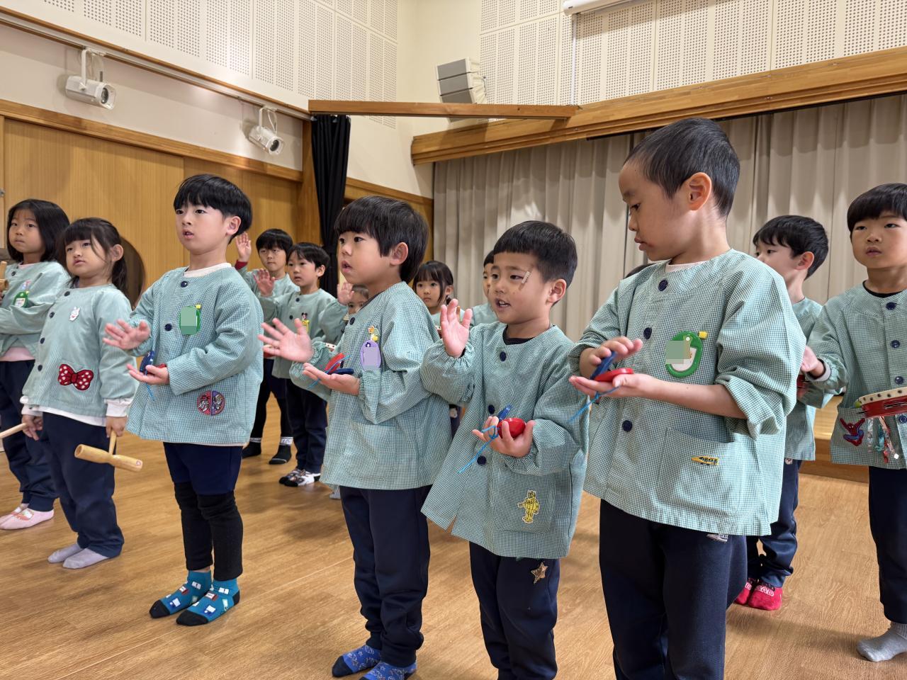 ゆり組、こすもす組、たんぽぽ組を縦割りにして楽器遊びを楽しんでいます♬音楽発表会で合奏を経験しているゆり組の子ども達は、各楽器のリーダーとして、堂々とかっこいい姿を見せてくれています✨