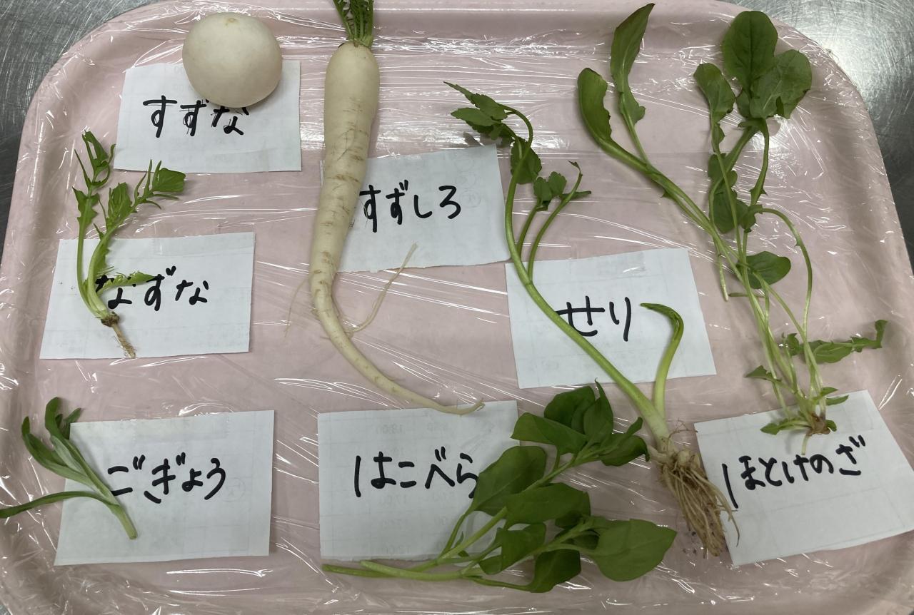 朝に、トレイに春の七草「せり、なずな、ごぎょう、はこべら、ほとけのざ、すずな、すずしろ」を並べ、各クラスで見てもらいました。七草は早春にいち早く芽吹くことから邪気を払うといわれていて、七草を入れたお粥を食べると1年間無病息災で過ごせるそうです。