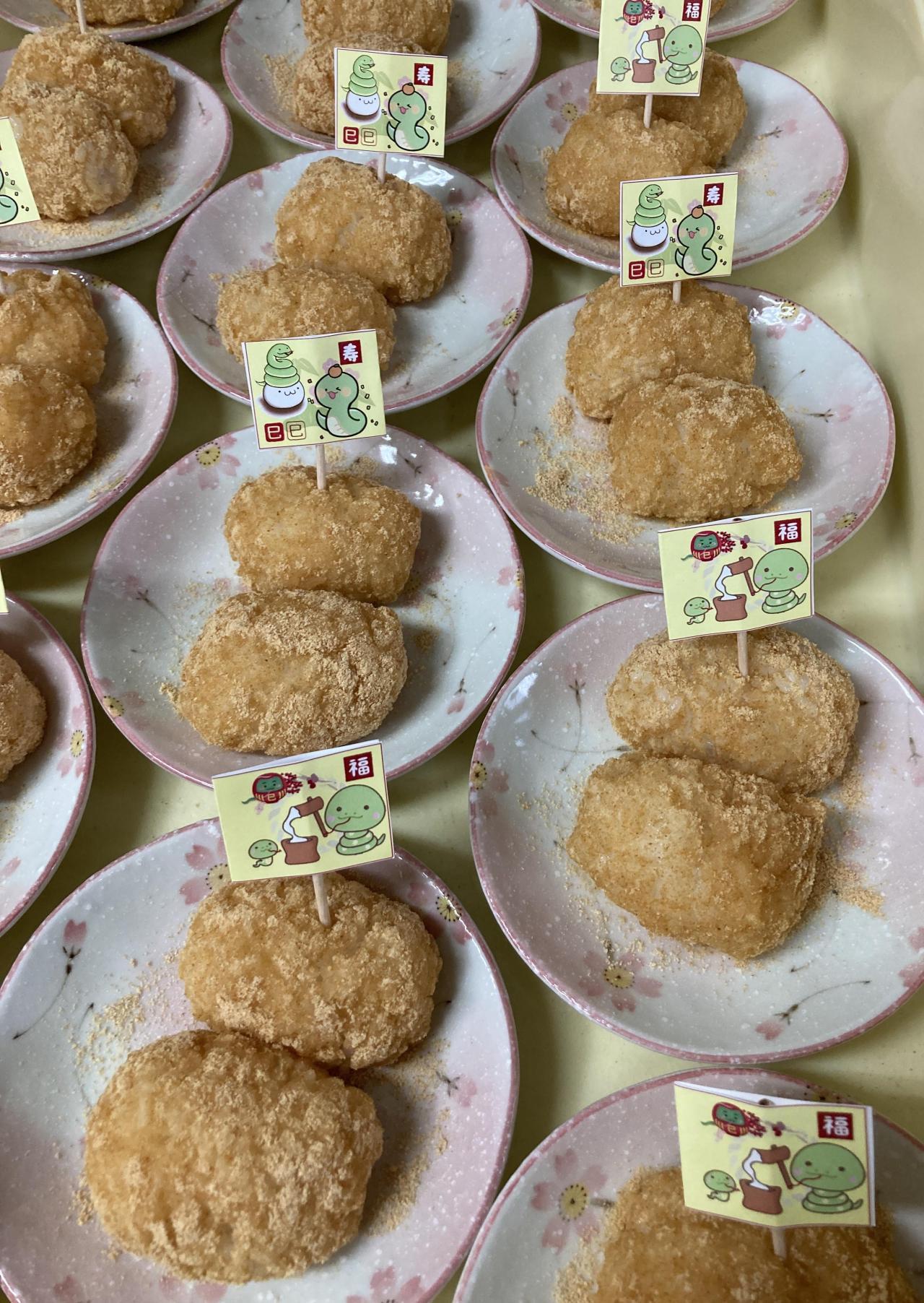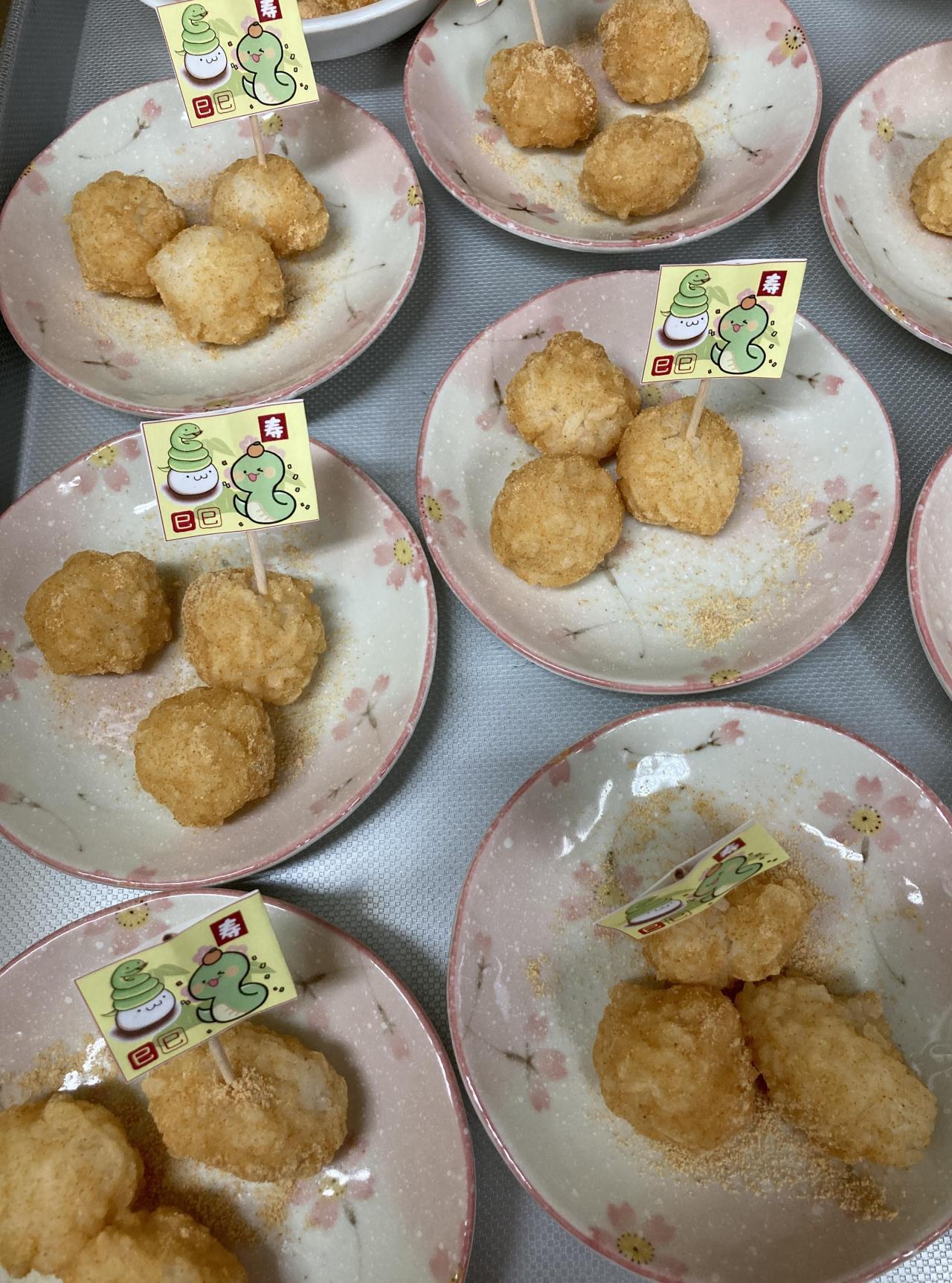 そして、おやつの時間には毎年恒例✨ 新年最初の手作りおやつの「きなこおはぎ」 つぼみ、もも組は精白米、ちゅうりっぷ、たんぽぽ、こすもす、ゆり組はもち米を使って作りました。