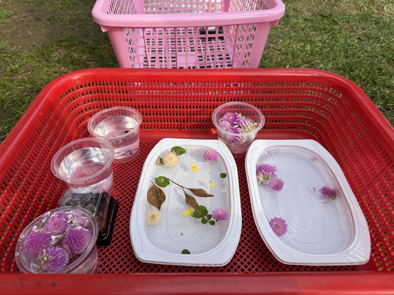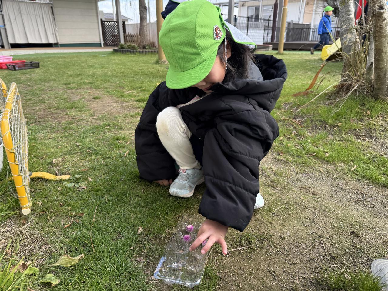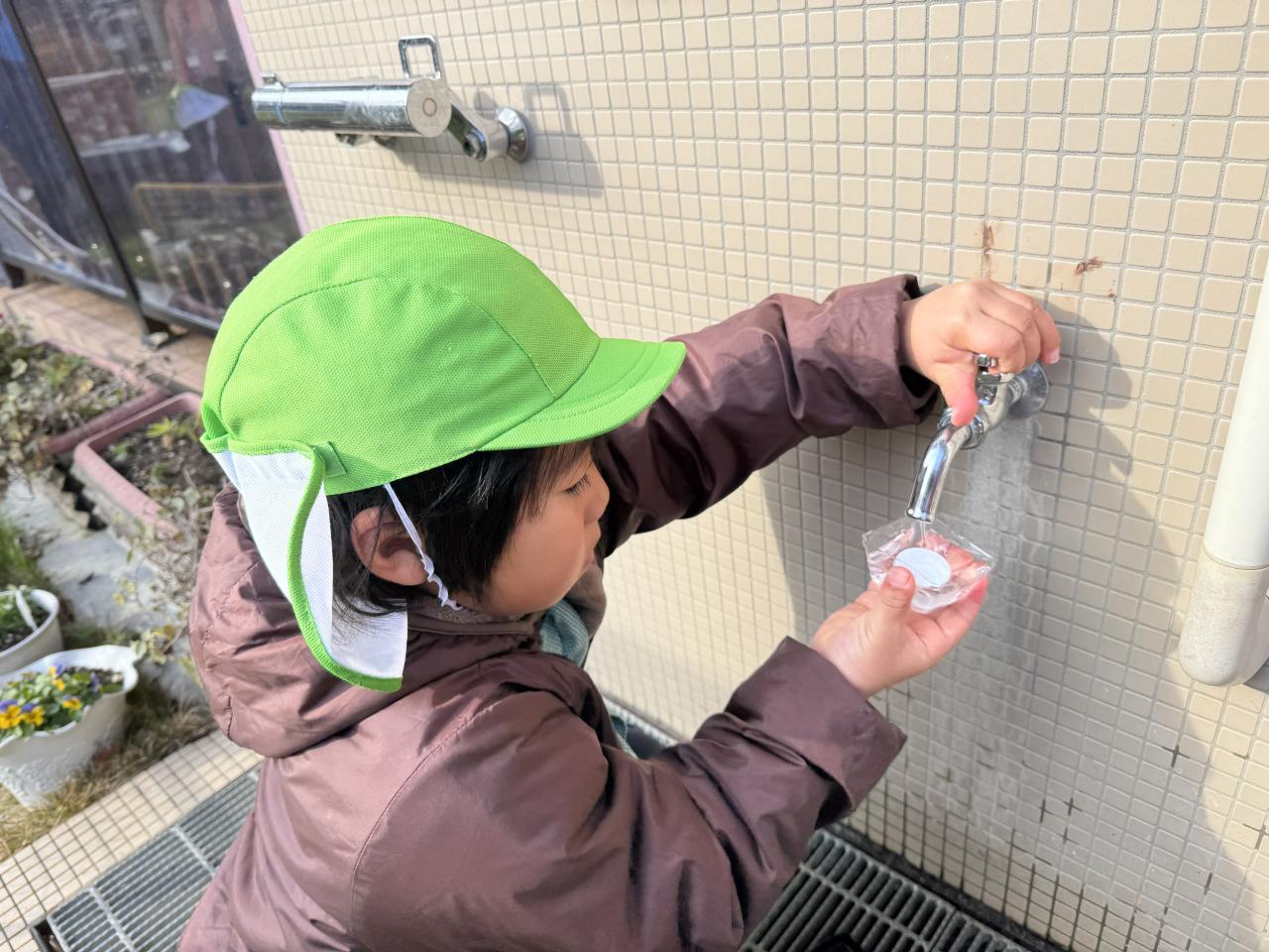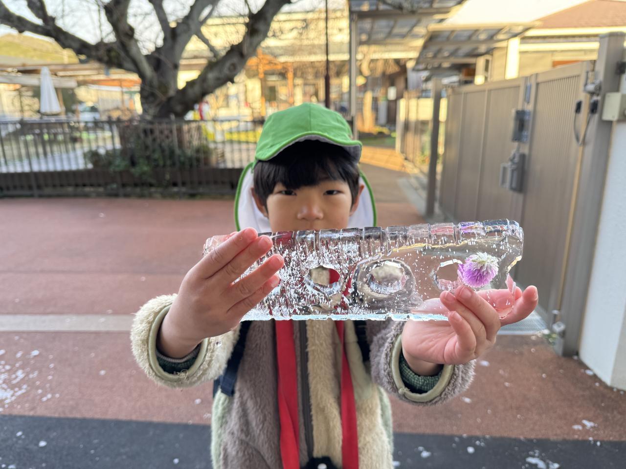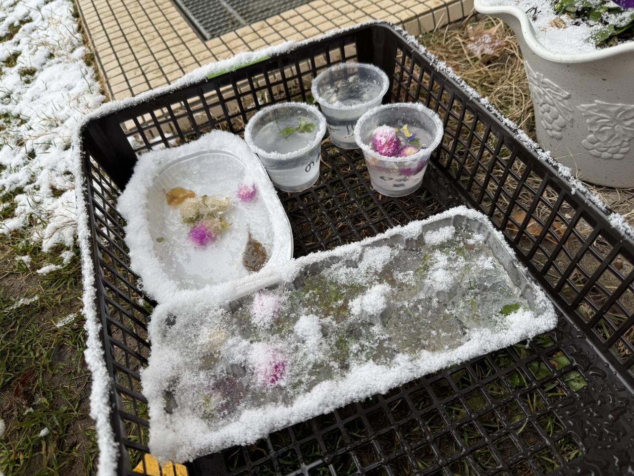 そんな中、ゆり組では氷づくりに挑戦!容器の大きさや置き方は自分で考えましたよ😀花を浮かべる子や、石を入れる子、蓋をする子・・・。さあ、どうなったでしょうね❄