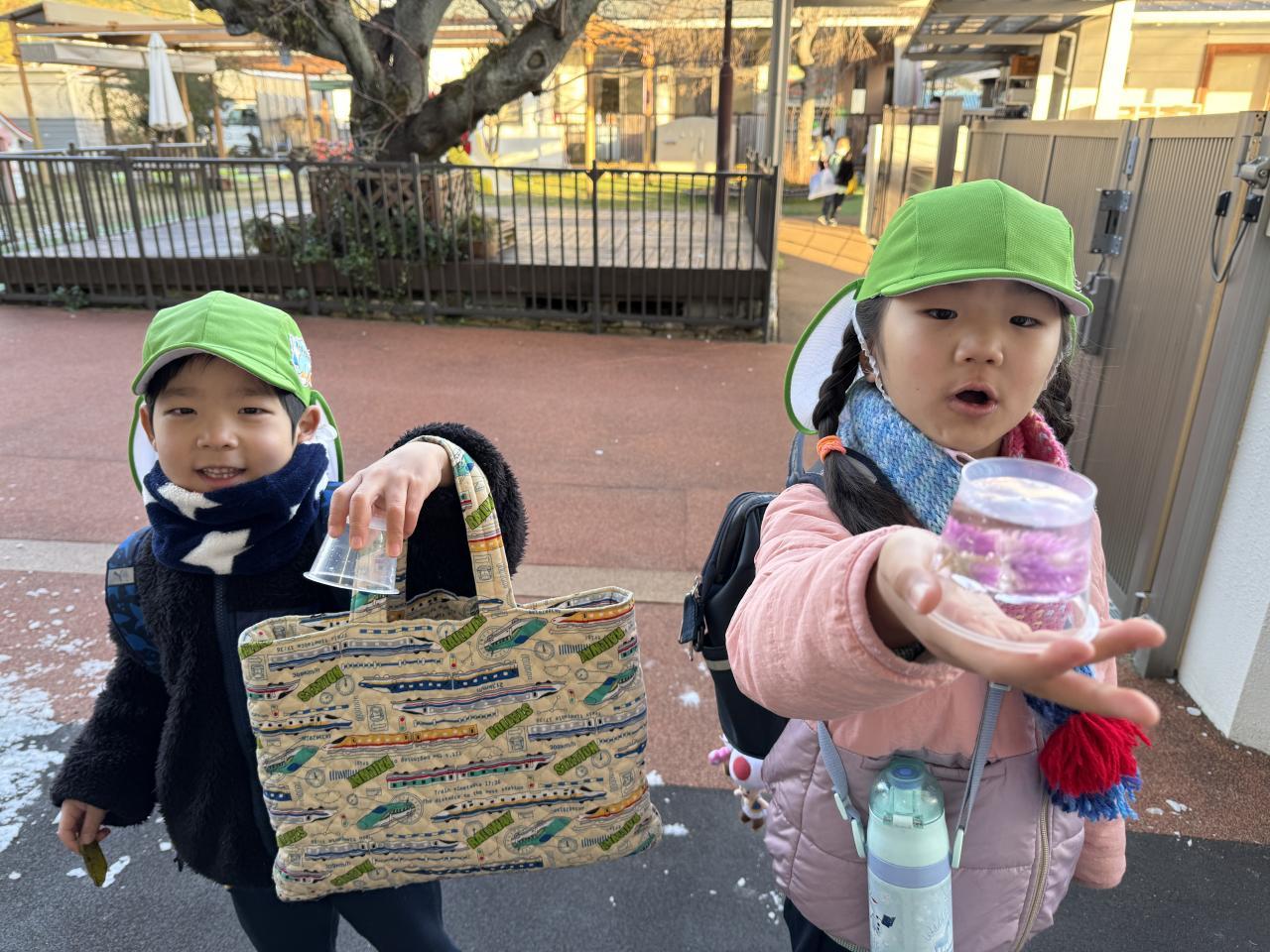 登園してきたまま、カバンを置くのも忘れて氷を楽しんでいた子ども達です😂