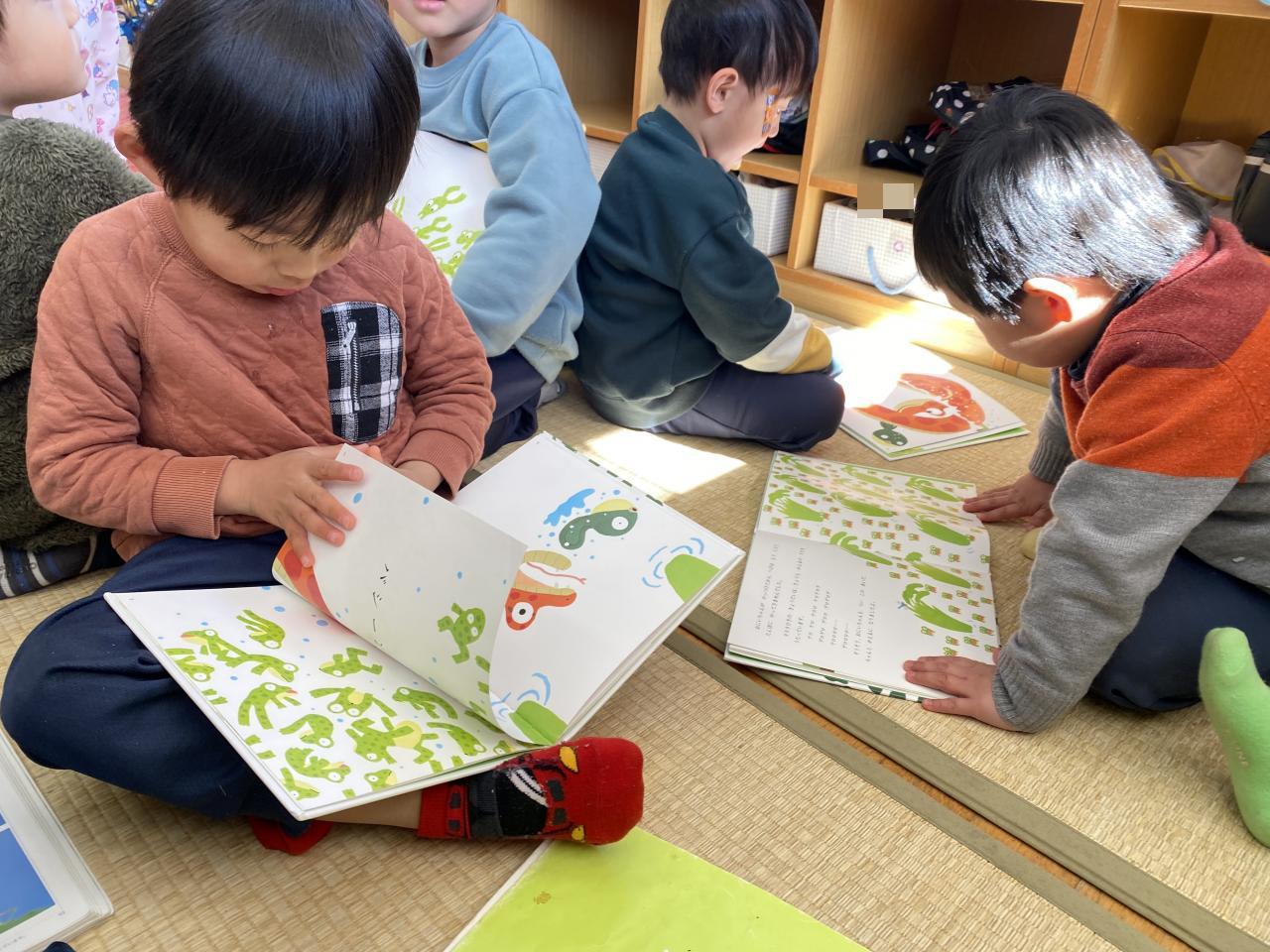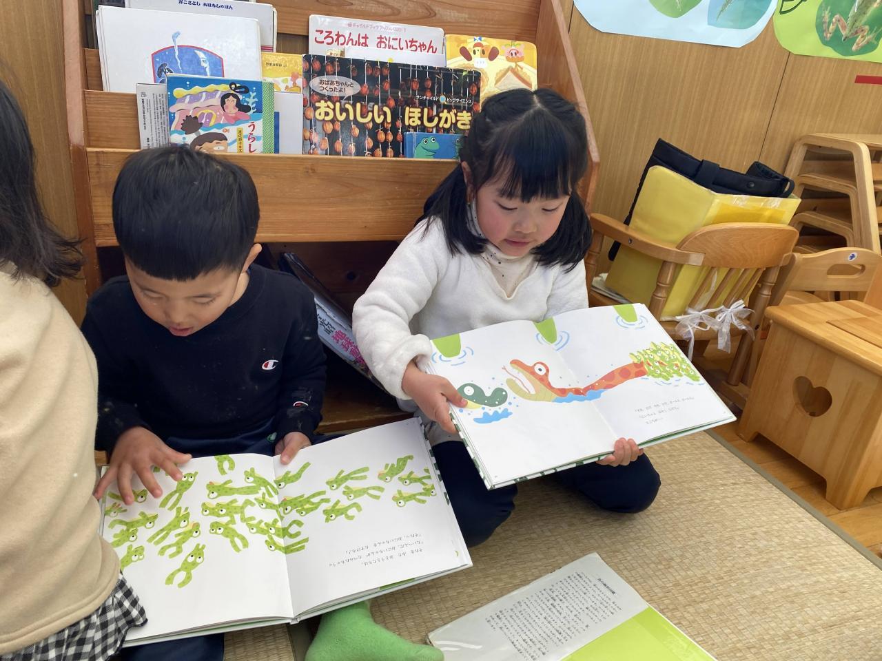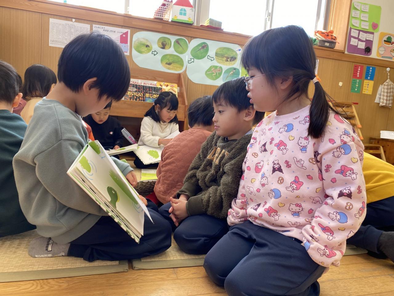 お部屋では、「999ひきのきょうだい」の絵本をお友達同士で見たり、自分でじっくり読んだりしています。セリフを言ったり、劇の歌を歌っている子もいて、お話の世界をいっぱい楽しんでいます🥰