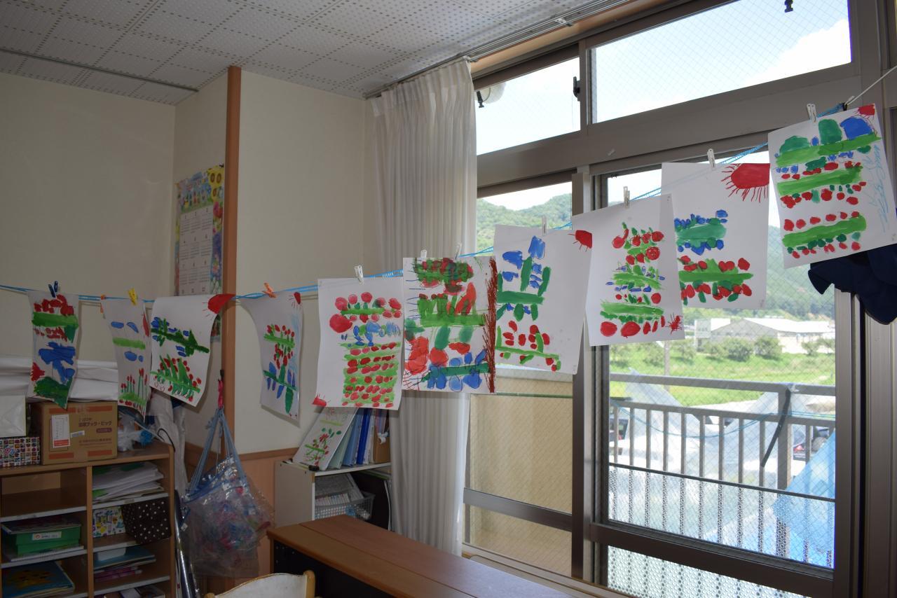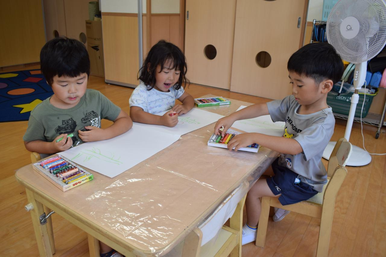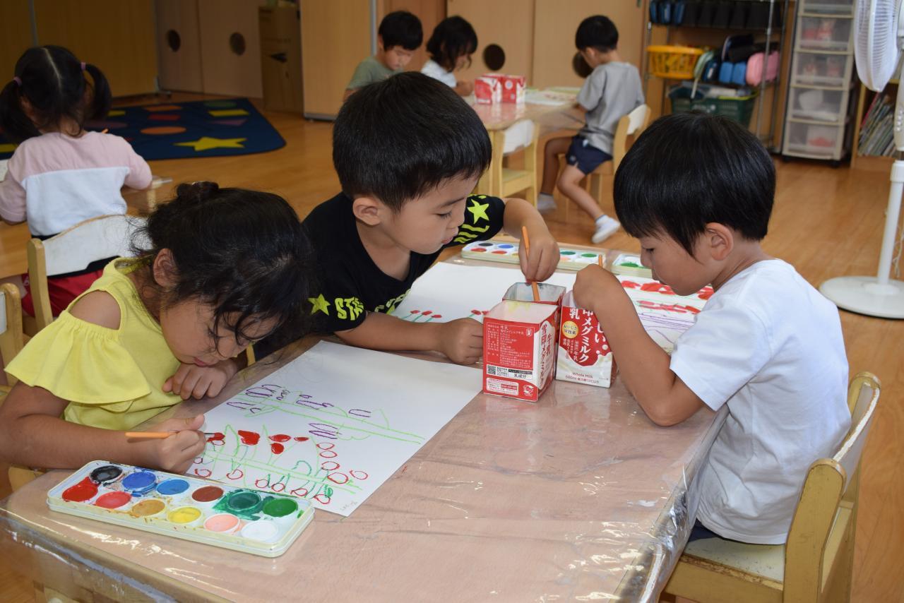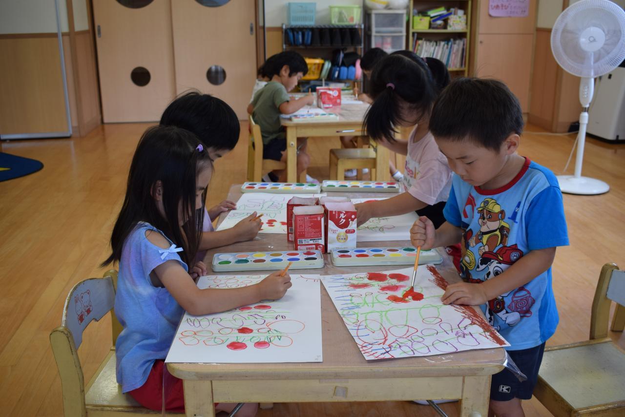 その後は、畑の野菜たちのお絵かきをして、絵の具で色塗りもしました。