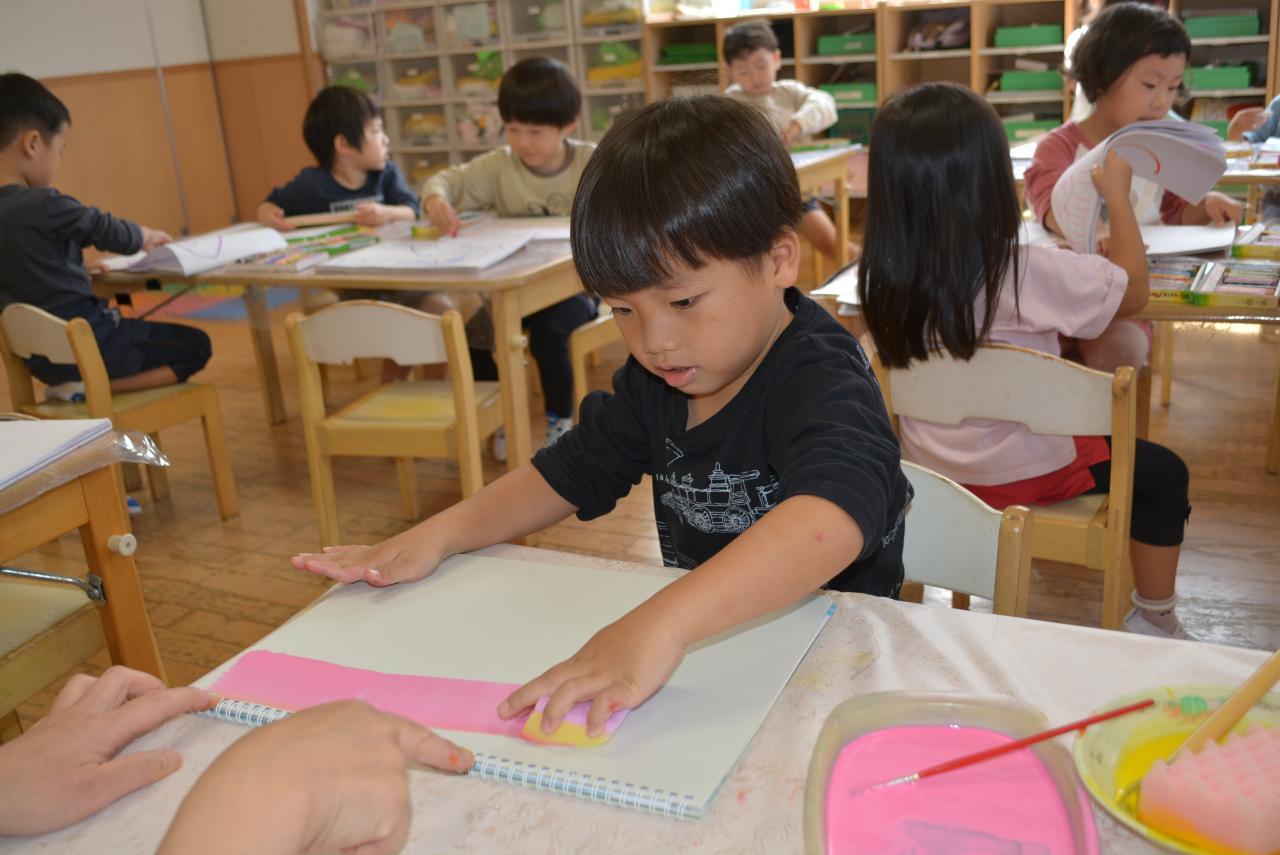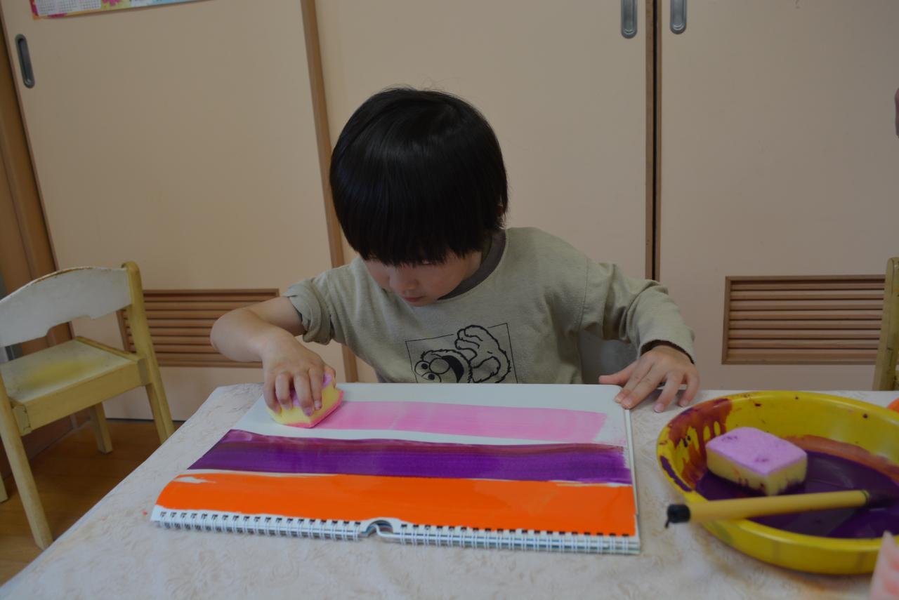 今日は10月の製作帳の続きで、絵の具とスポンジを使って色を塗りました🌈