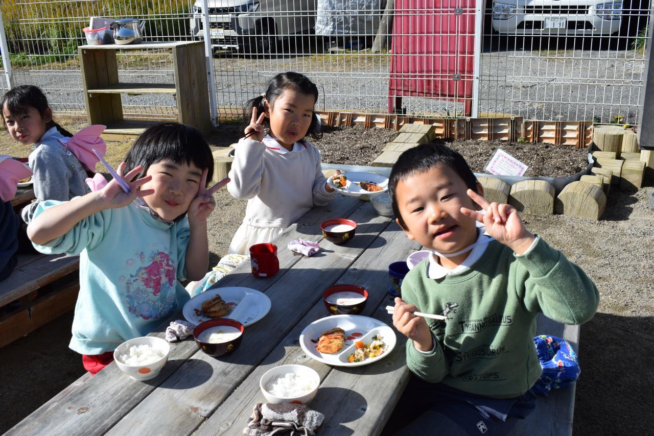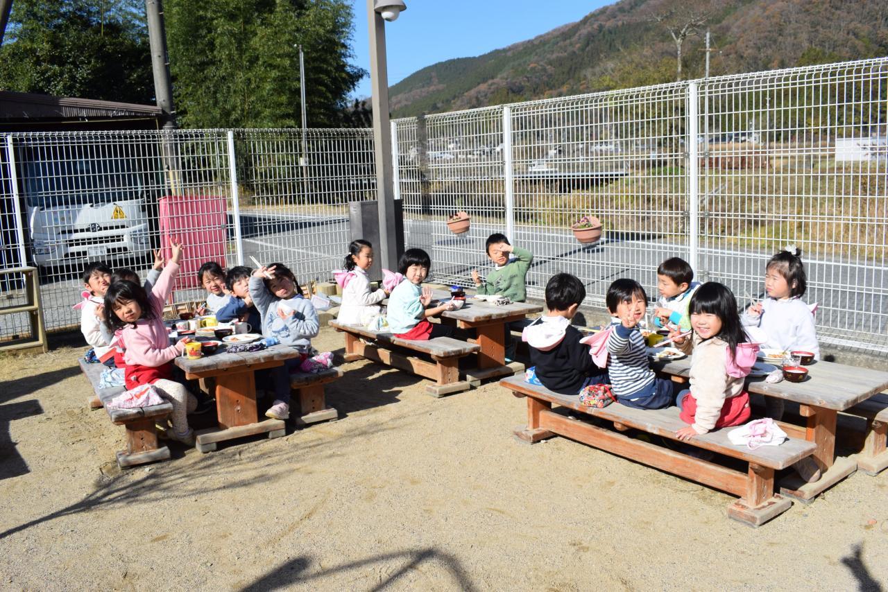 お外で食べる給食はいつもより美味しく感じるそうです(笑)