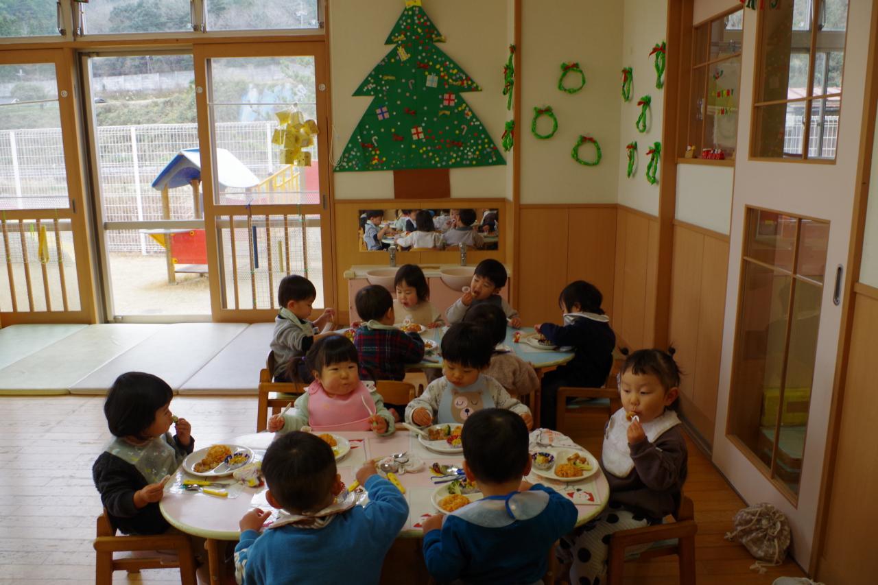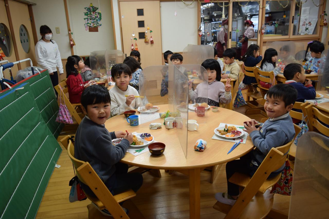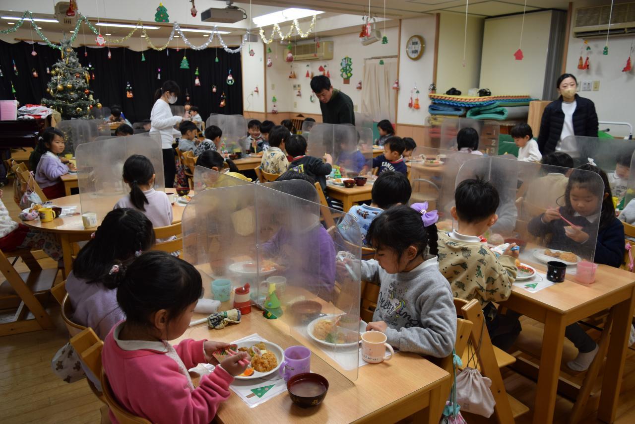 いるか、しゃち、くじら組のお友だちはランチルームで会食を楽しみました🎄