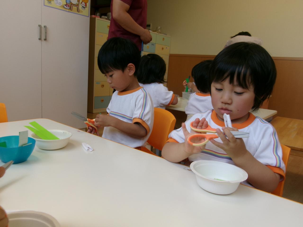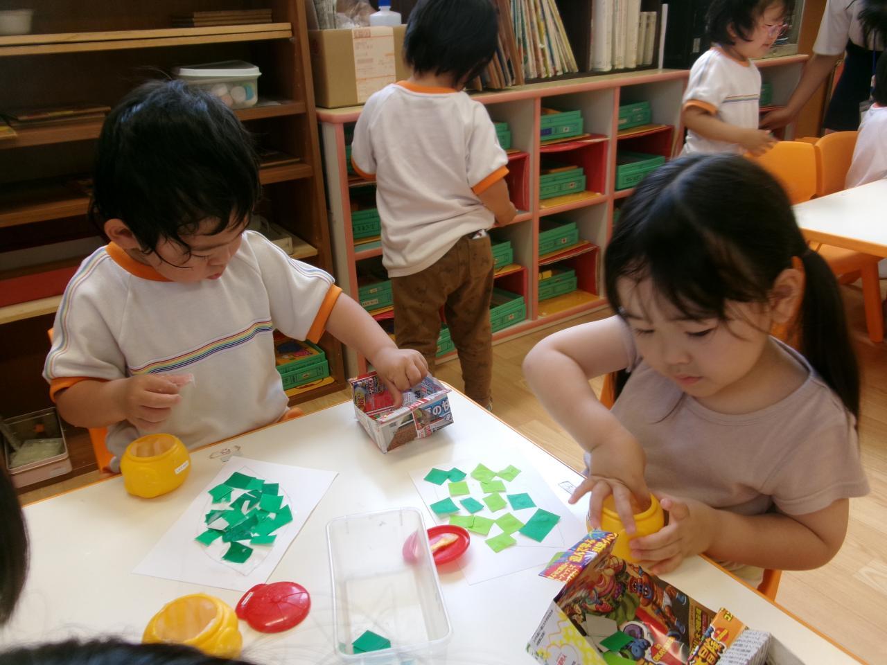 今回は書かれている線の上を切る一回切りに挑戦しましたが、皆上手に切ることができていました😄。切った紙は葉っぱの形が描かれている紙に貼っていきましたが、皆葉っぱの形からはみ出すことなく上手に貼ることができていました!
