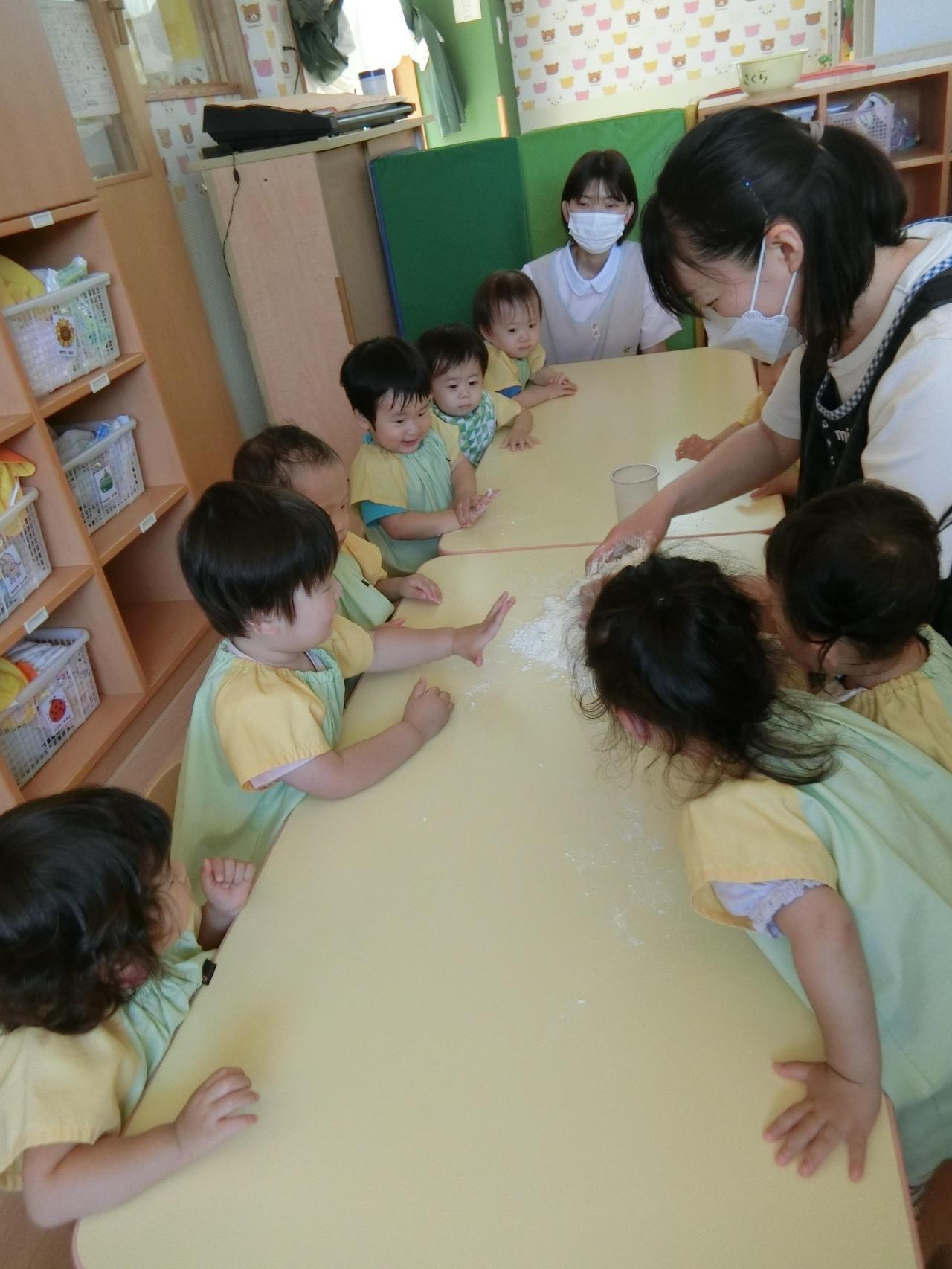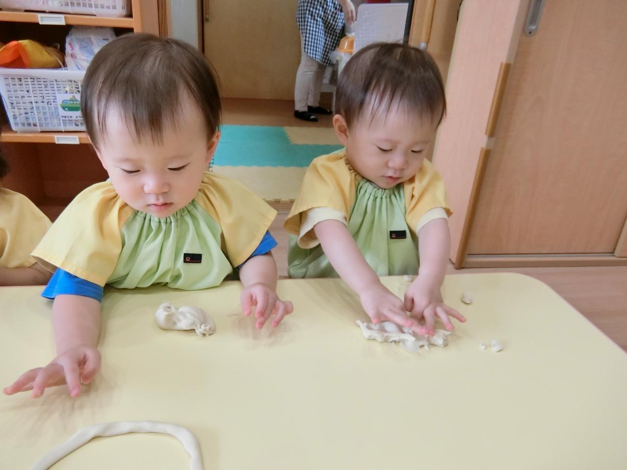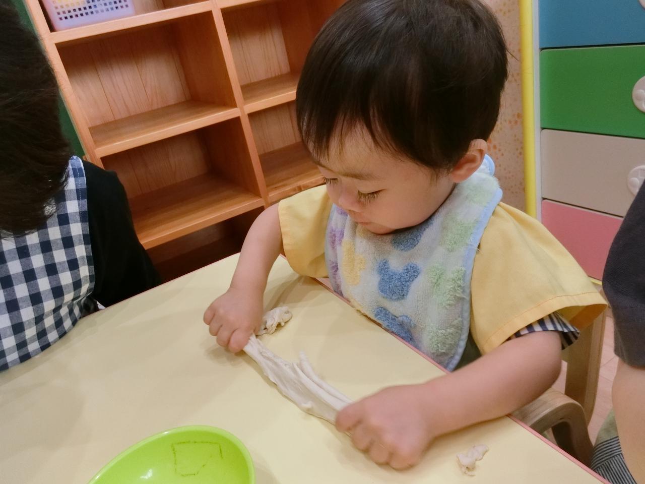 子ども達の前で粉から粘土を作り、こねたり、ちぎったり、伸ばしたりと沢山触って存分に感触遊びを楽しみました!