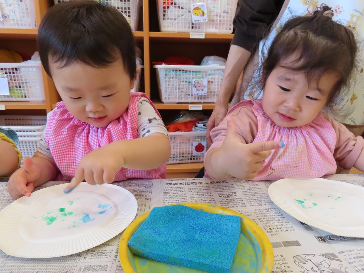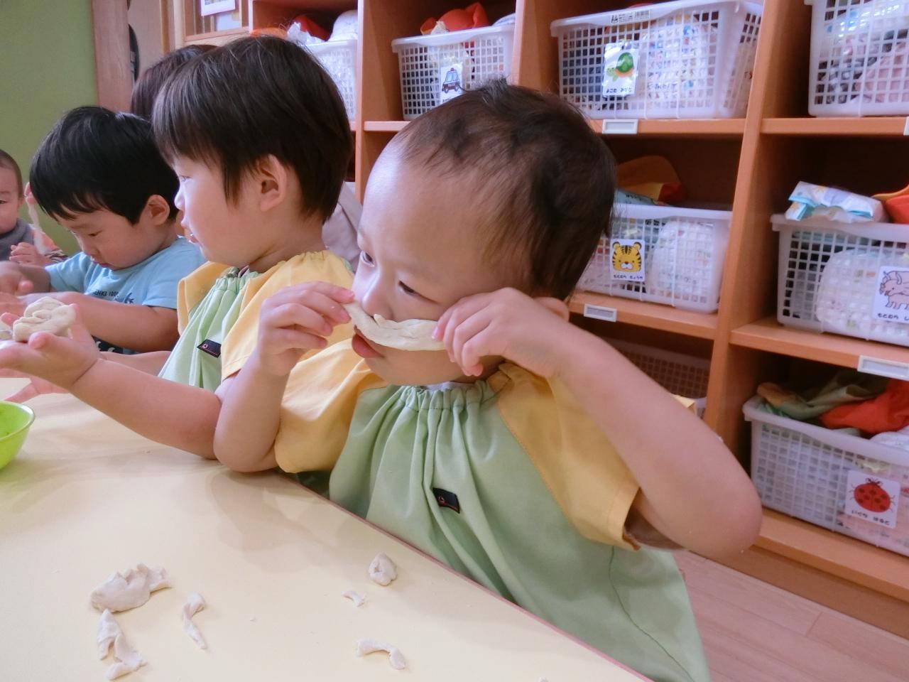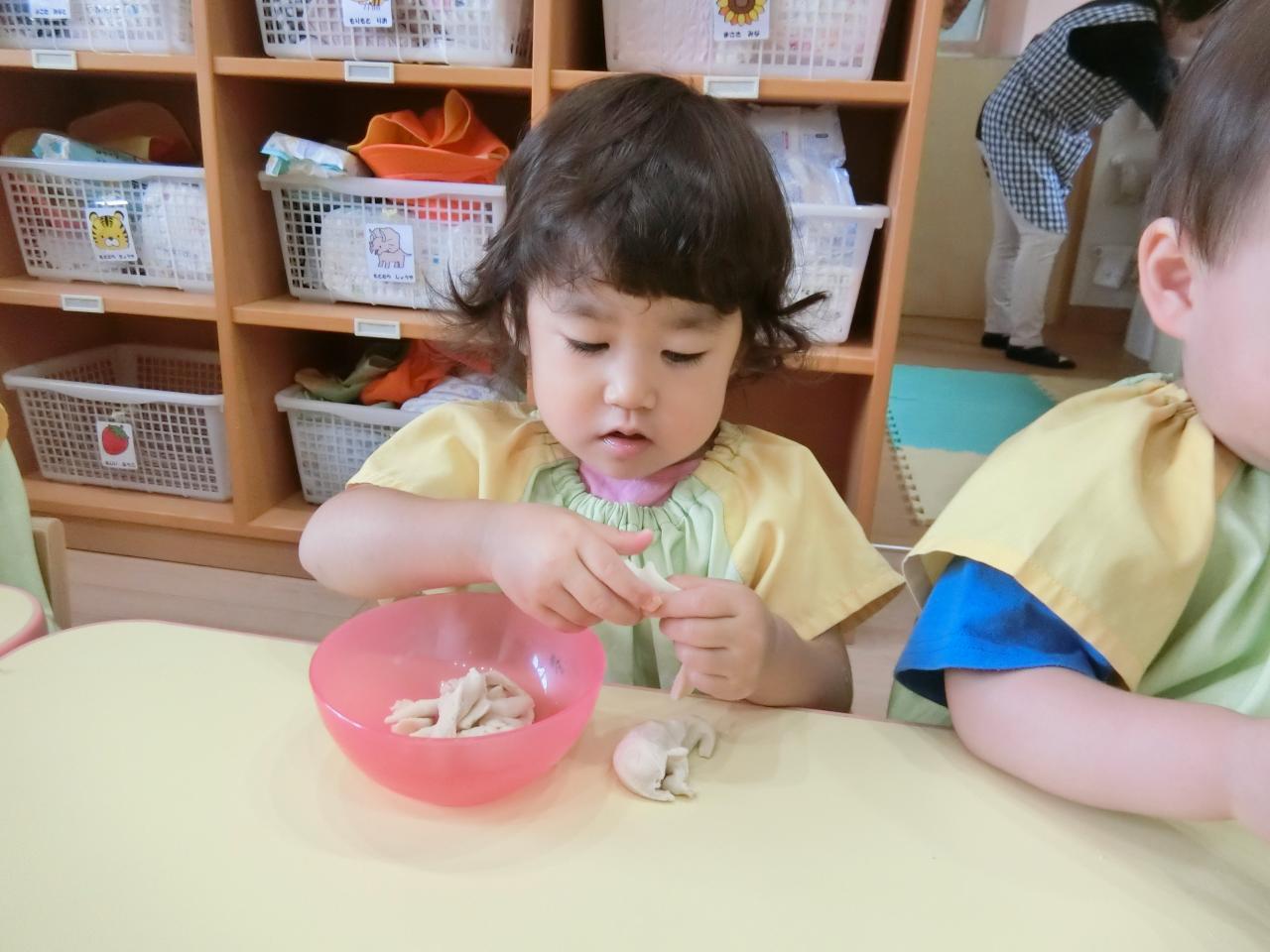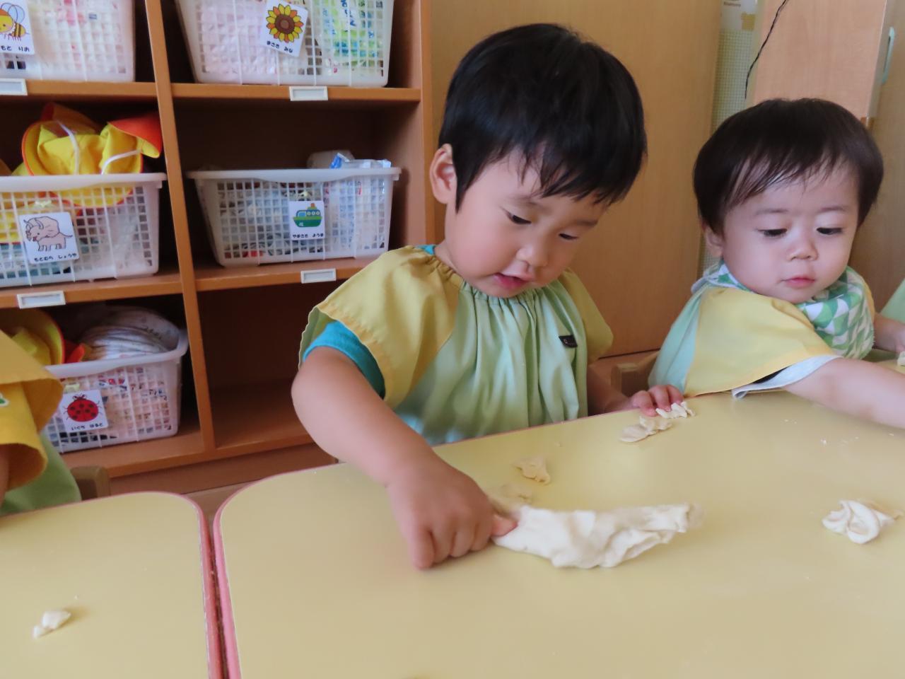 子ども達の前で粉から粘土を作り、こねたり、ちぎったり、伸ばしたりと沢山触って存分に感触遊びを楽しみました!