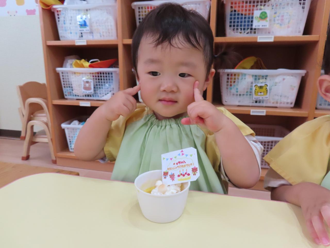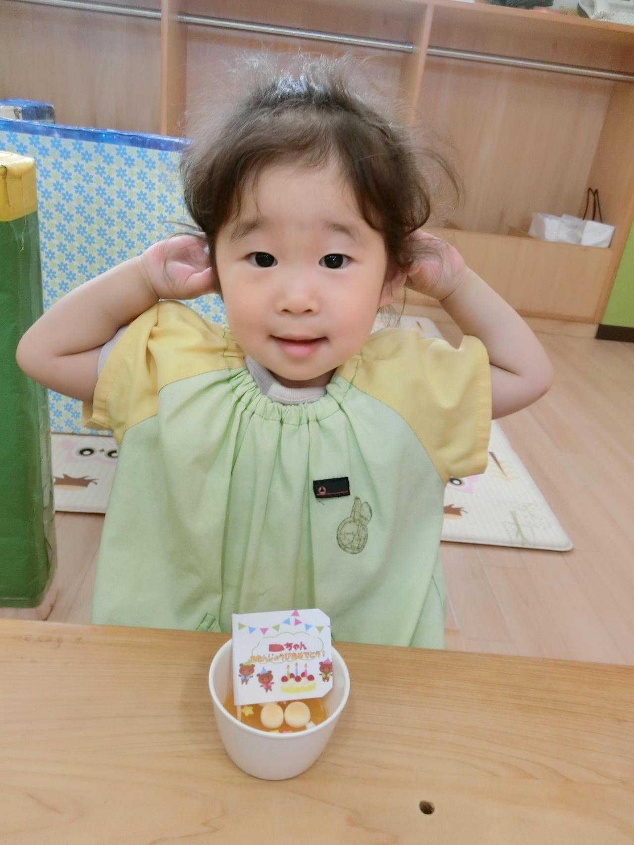 調理の先生がかわいい誕生日デザートを作ってくれて、みんなでお誕生日の歌を歌ってお祝いしました!