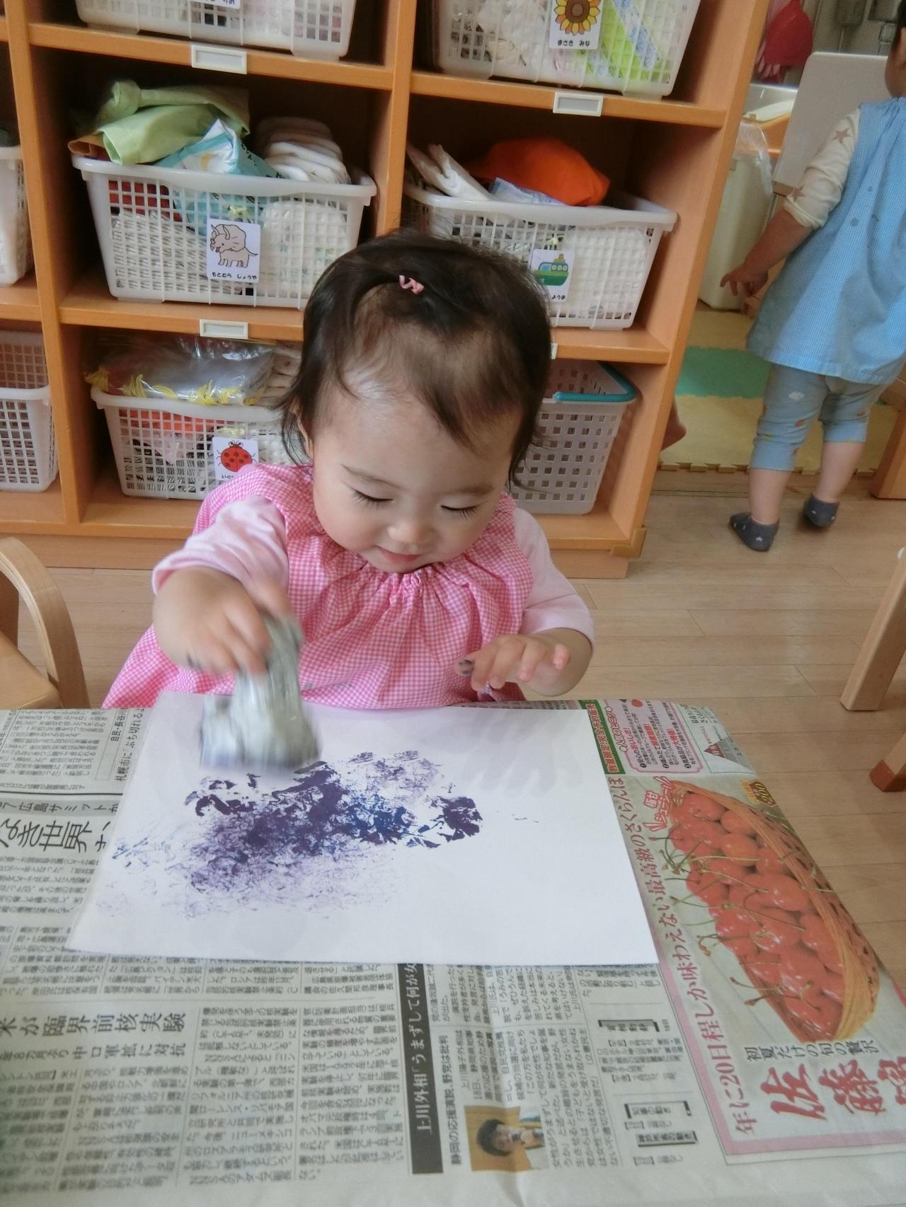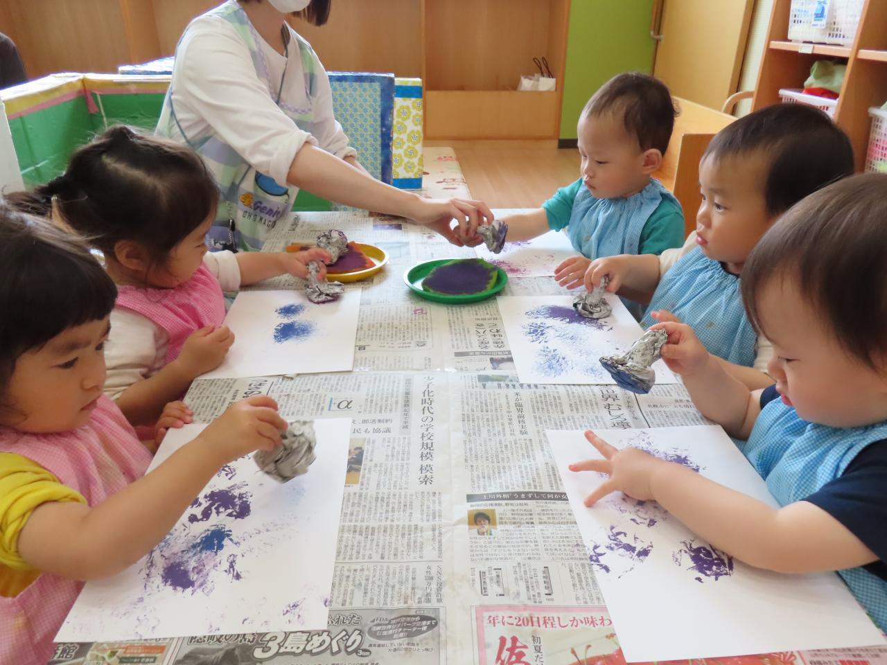 あじさいは新聞紙スタンプでポンポンポン!