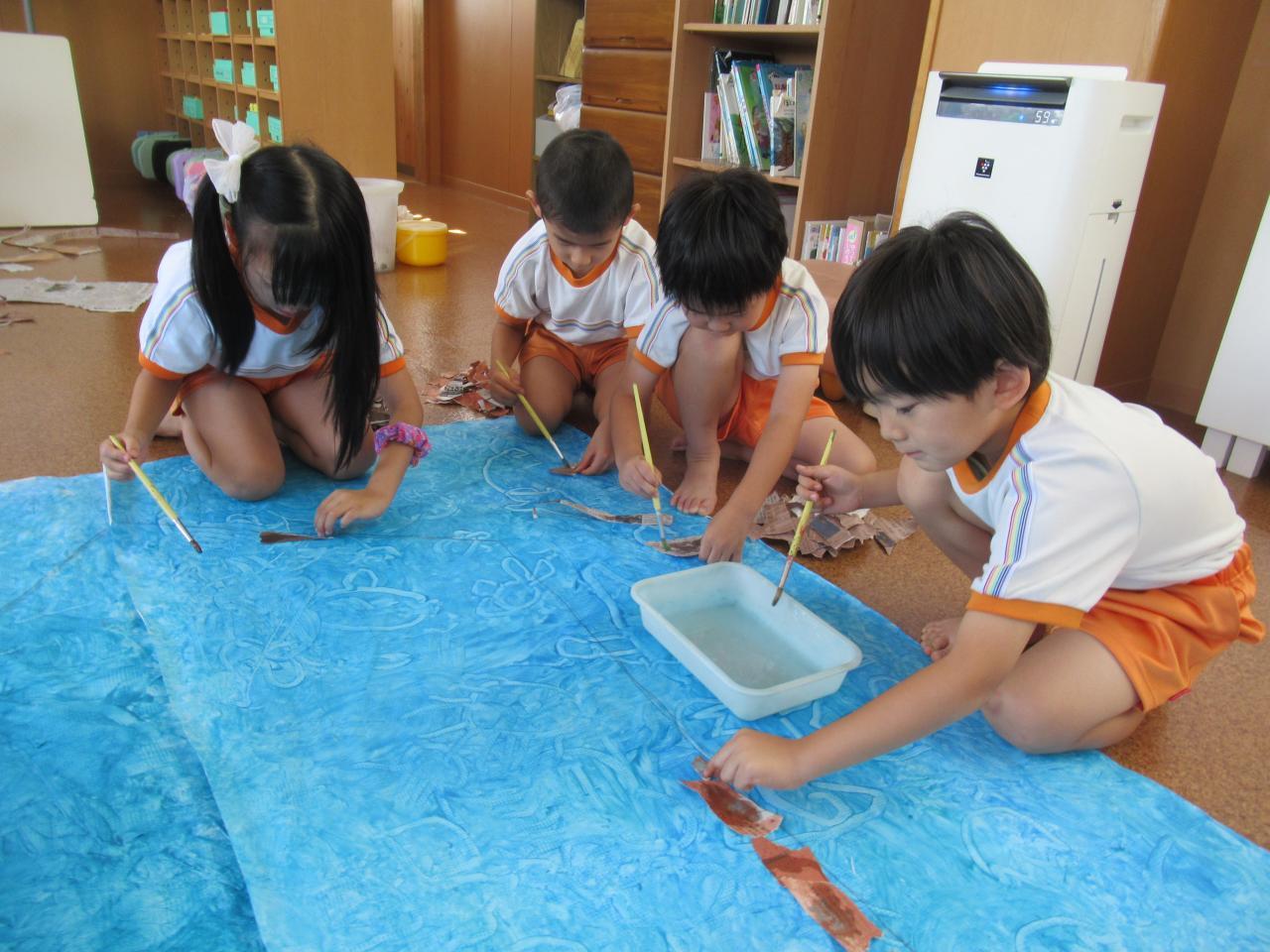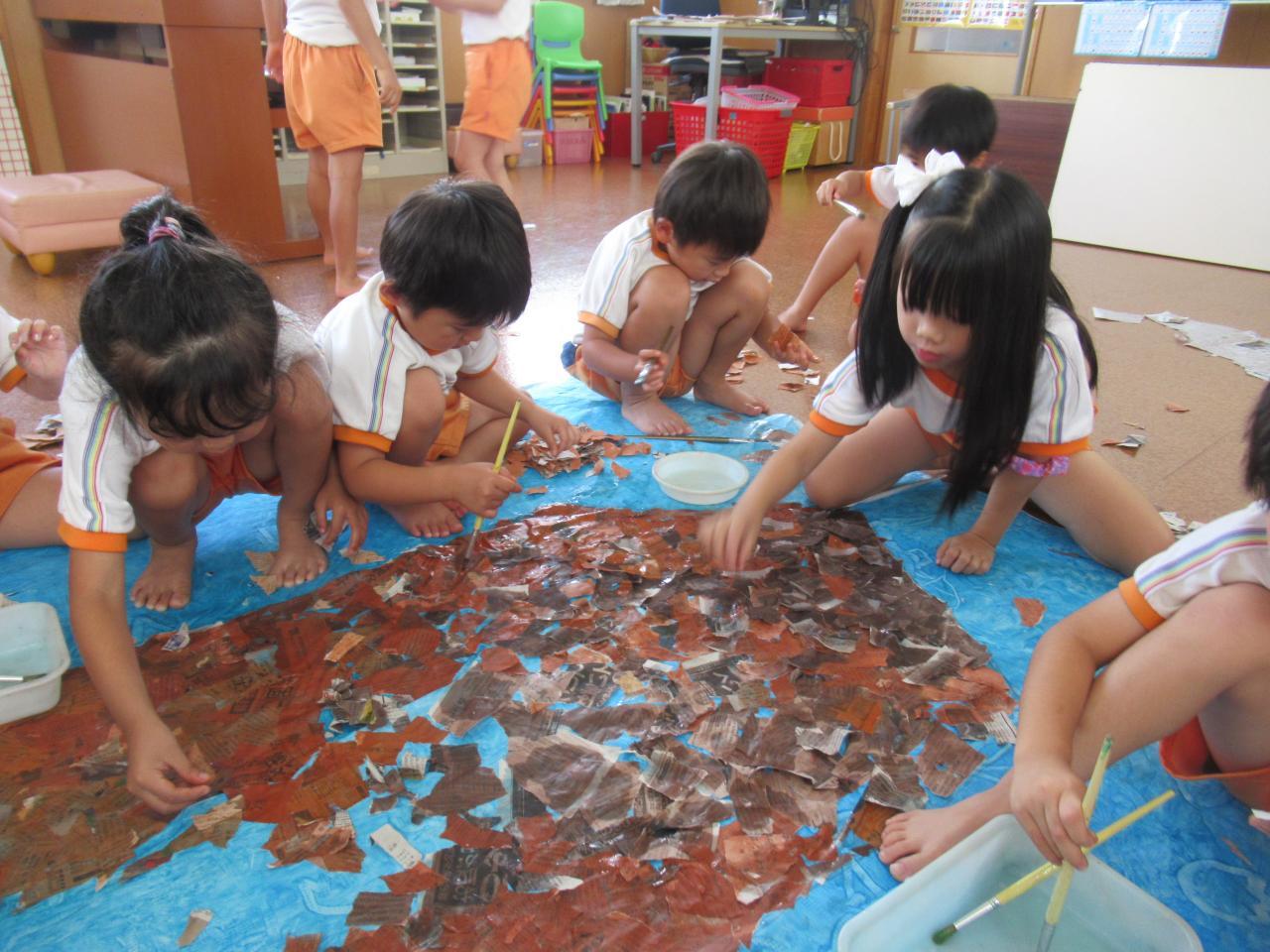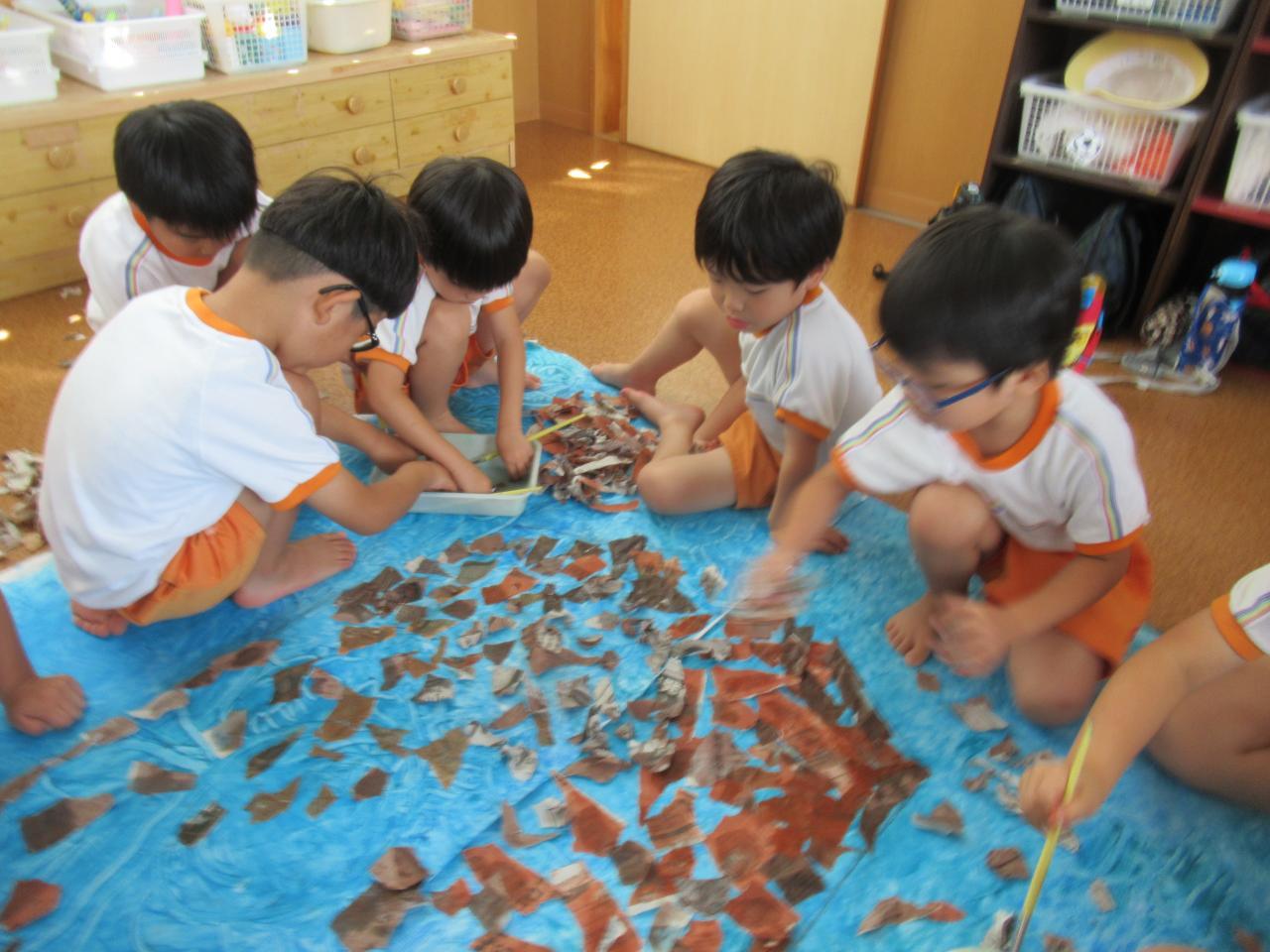 「はみださんように貼ろな!」「ここ空いとるで~」と声を掛け合ったり、
