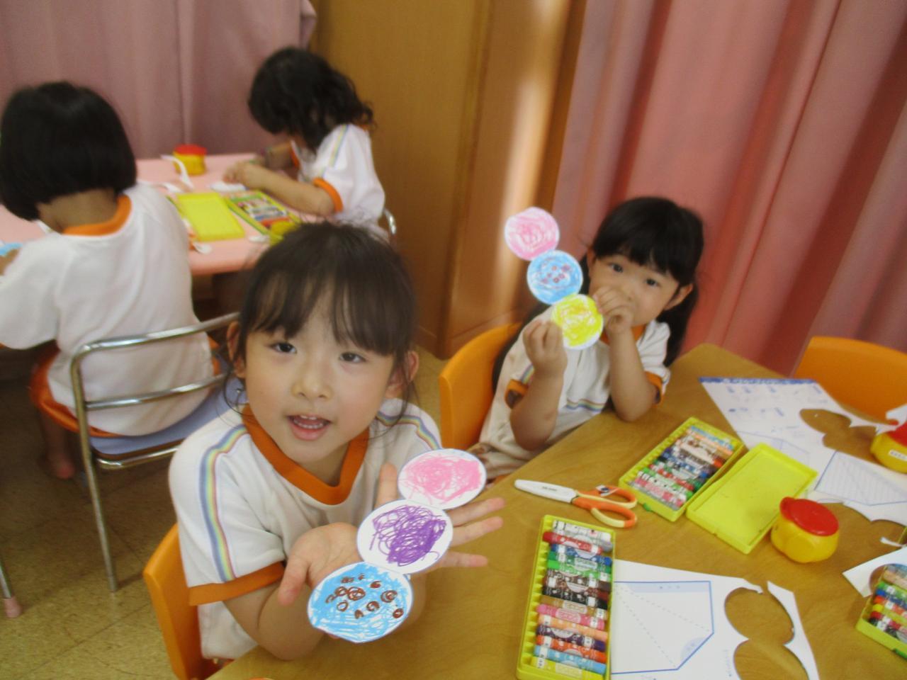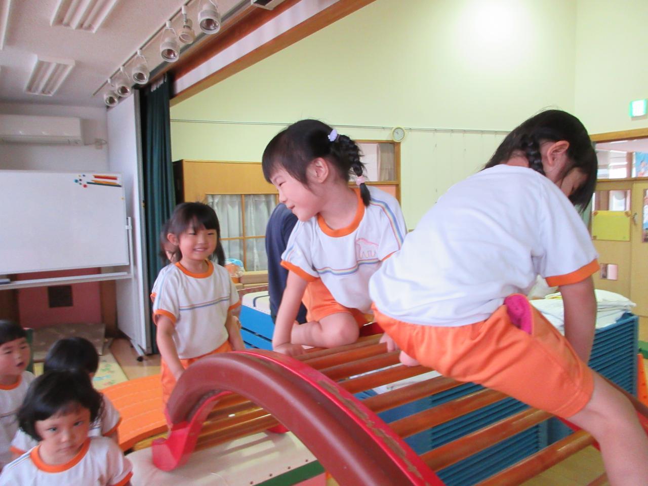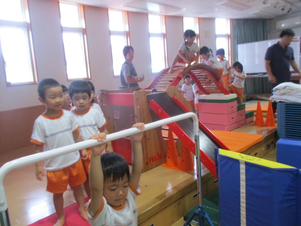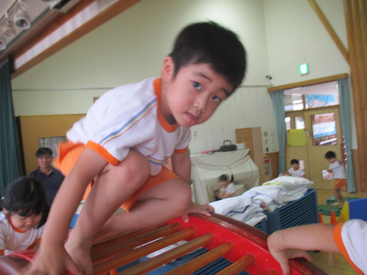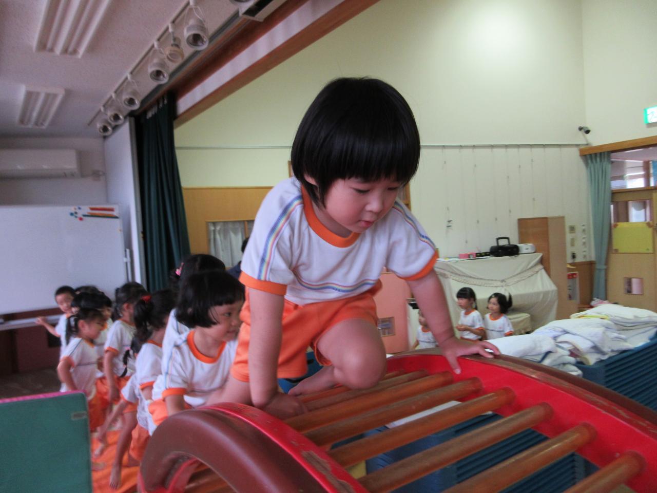 暑い日が続き外で遊べないときは、ご覧頂いたように製作をしたり、ホールでアスレチック遊びをしたりしています。ホールで伸び伸びと体を動かして遊んでいます。😄