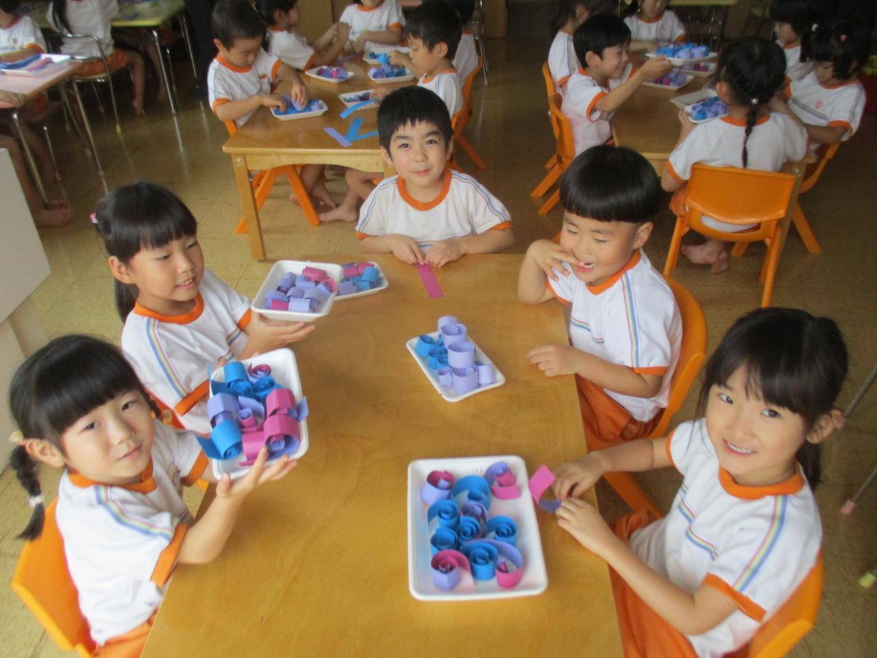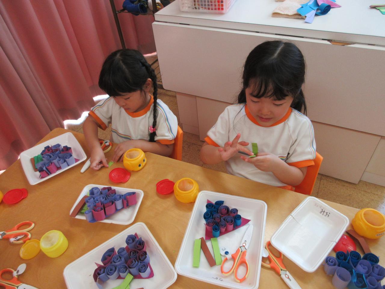 次に細く切った画用紙を丸めてブドウの実を作っていきます。