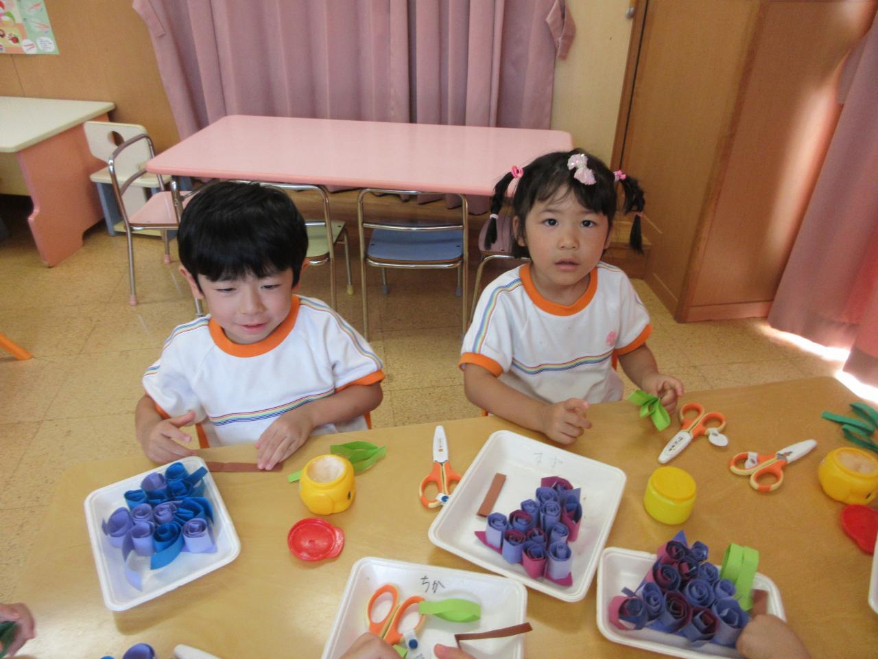 それを重ねて一点でのり付けし、ヘタになる茶色の画用紙に付けると完成❗