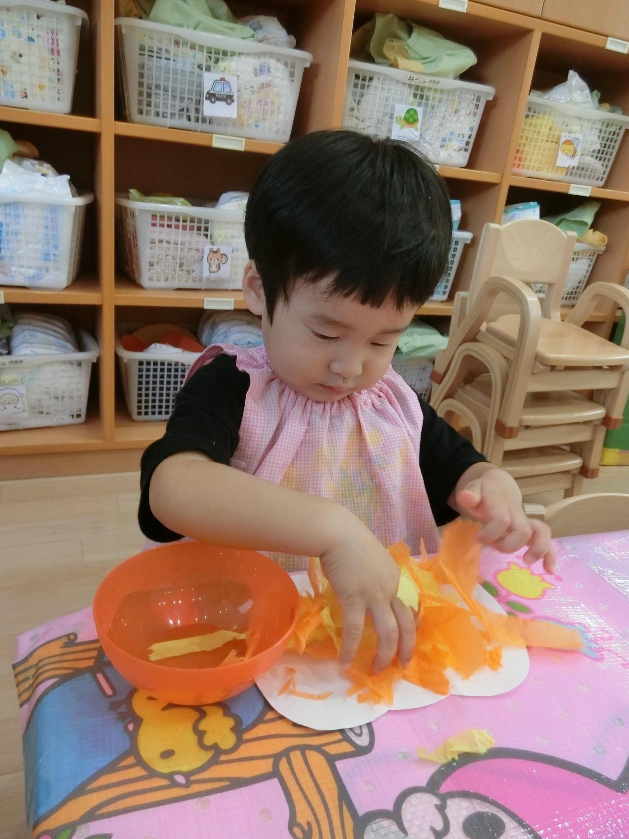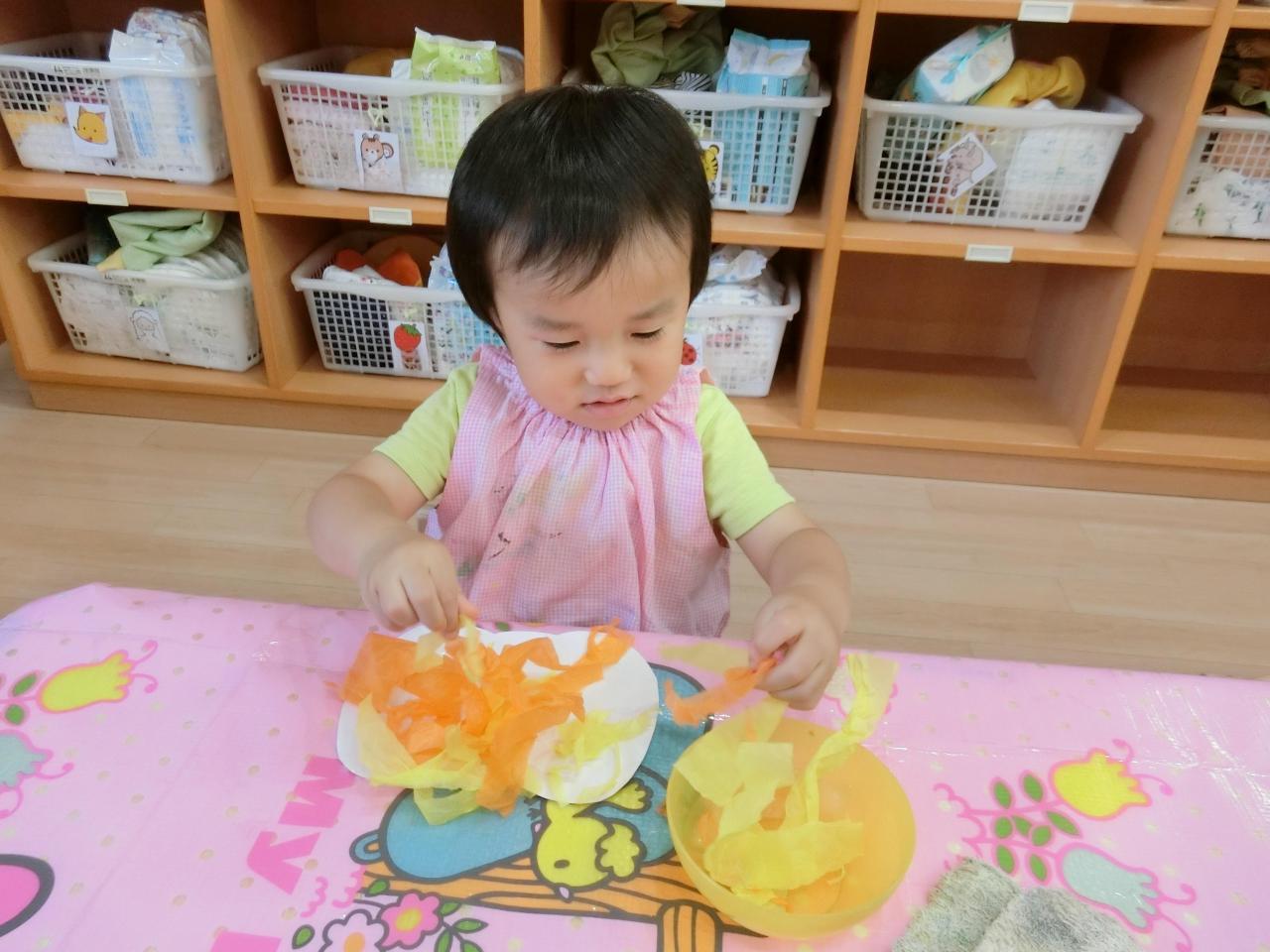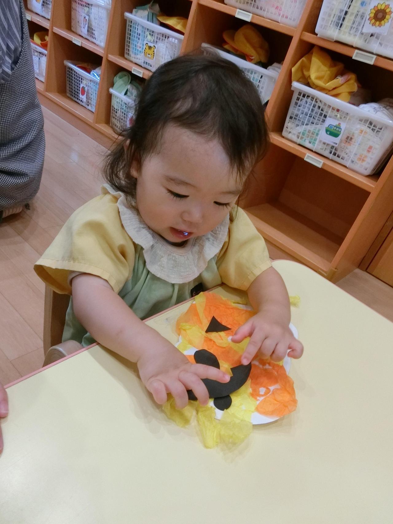 見本を見ながら目・鼻・口の場所を考えて置く子や自分の好きなように配置する子など様々で一人一人違ったお顔になり、とても可愛いかぼちゃおばけになりました👏