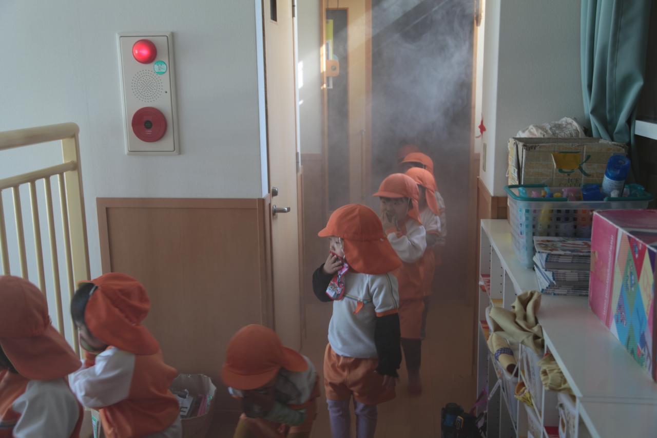 部屋に入ると中は真っ白で、「見えないよ~」と周りのお友達が見えない怖さを感じたようですが、先生の話を聞き、少しだけ見えている前のお友達に続きながら、上手に煙体験できていました✨