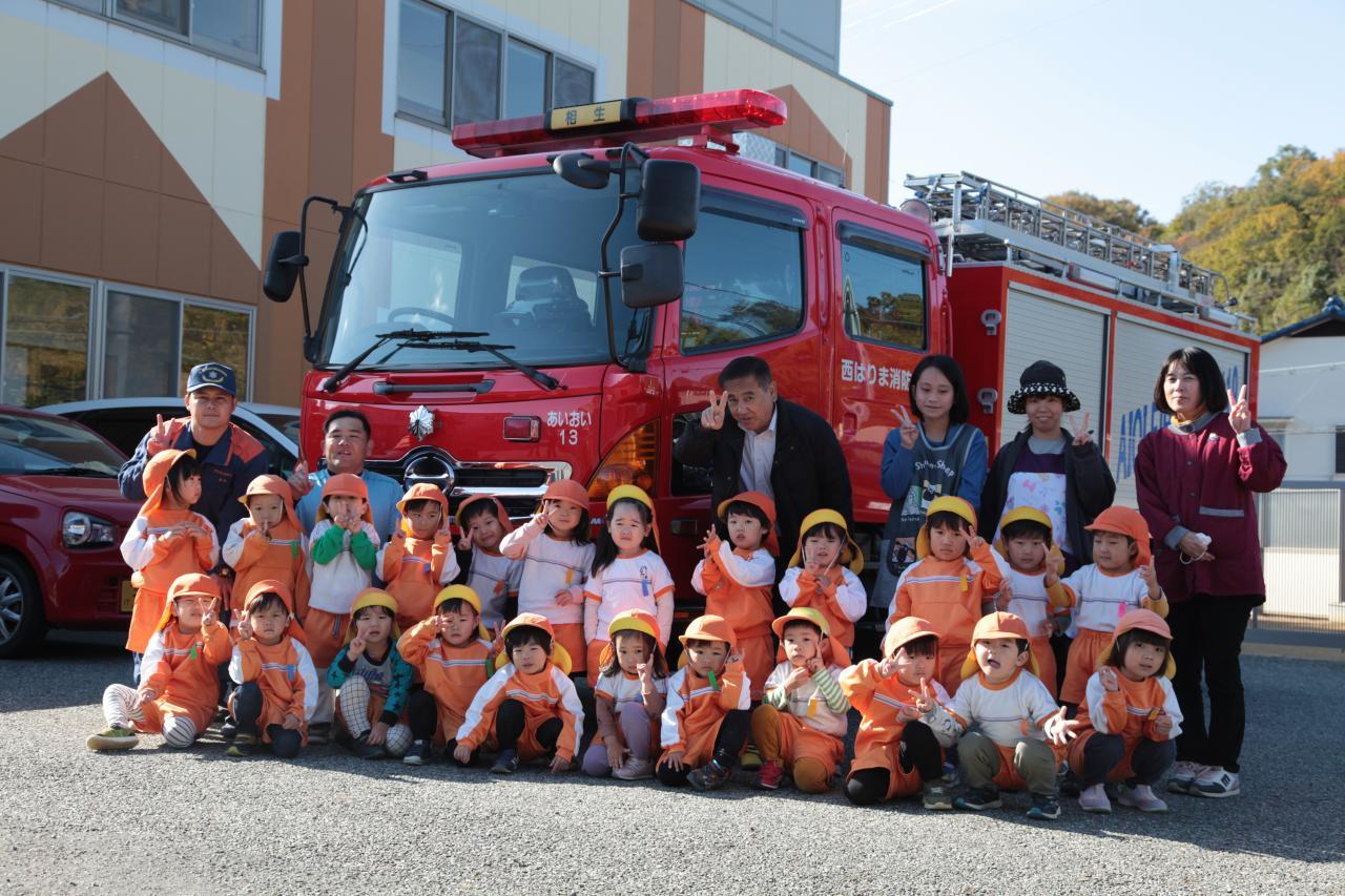 防災訓練の後は、消防車の近くに行き、間近で見学して皆で記念撮影をしました😆