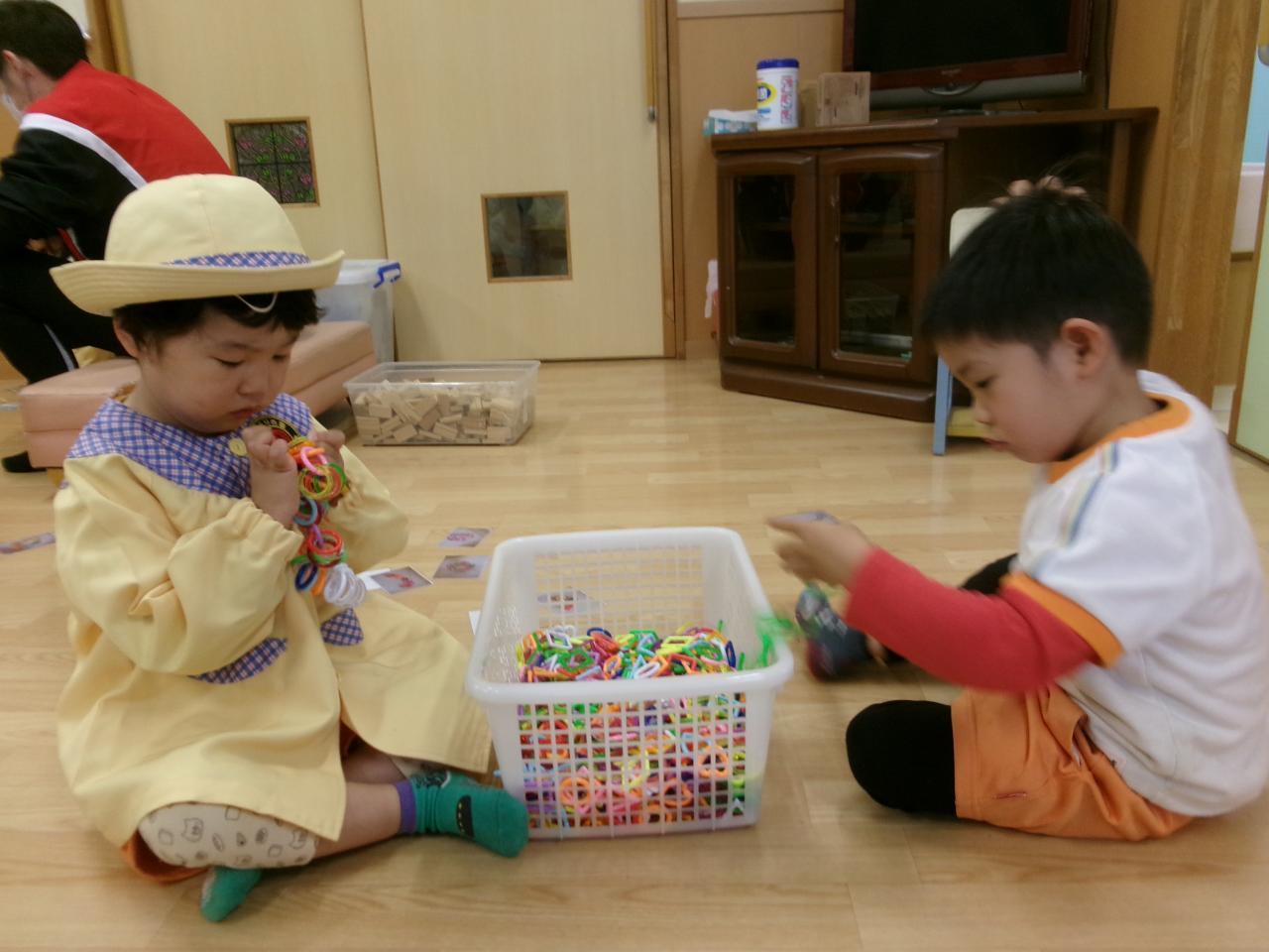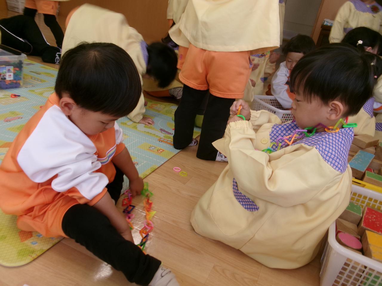 三角やハートなどの輪っかがあり、それを繋げて遊びます!皆集中して遊んでおり、最初の方は繋げるという目的だったのが、後半になると長く繋げて友達と長さを比べたり、首飾りを作ったりして遊ぶようになり楽しんでいました🤩