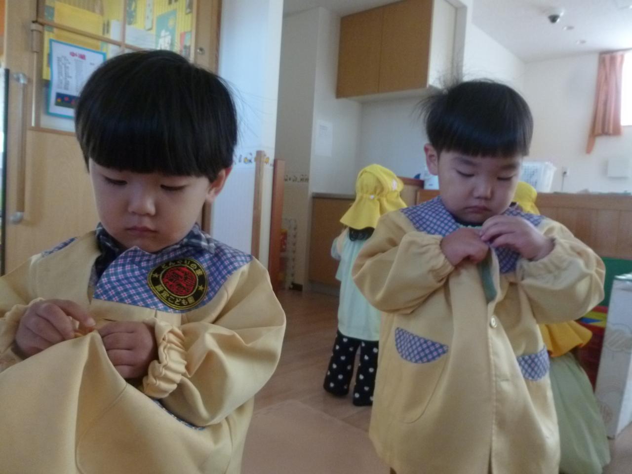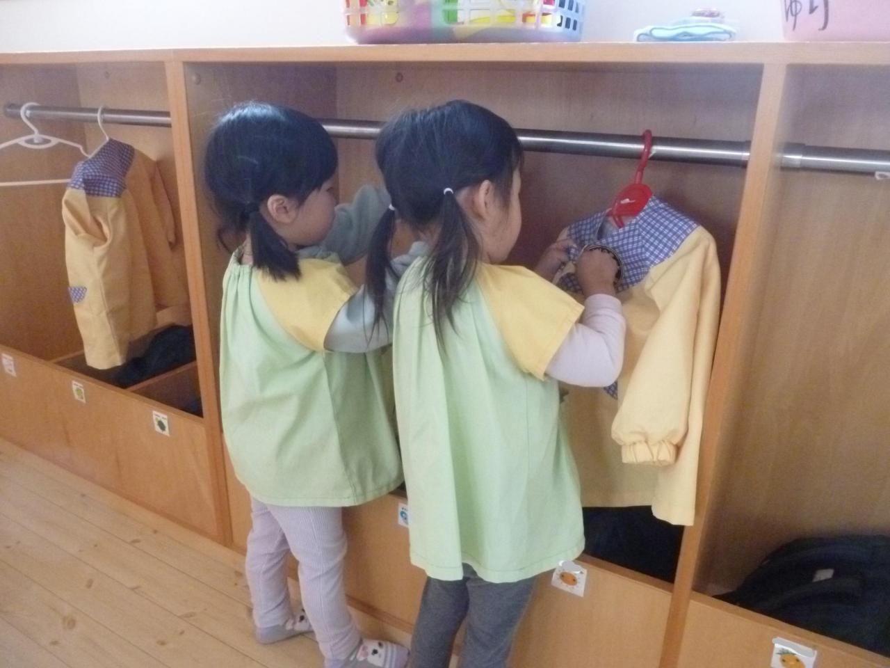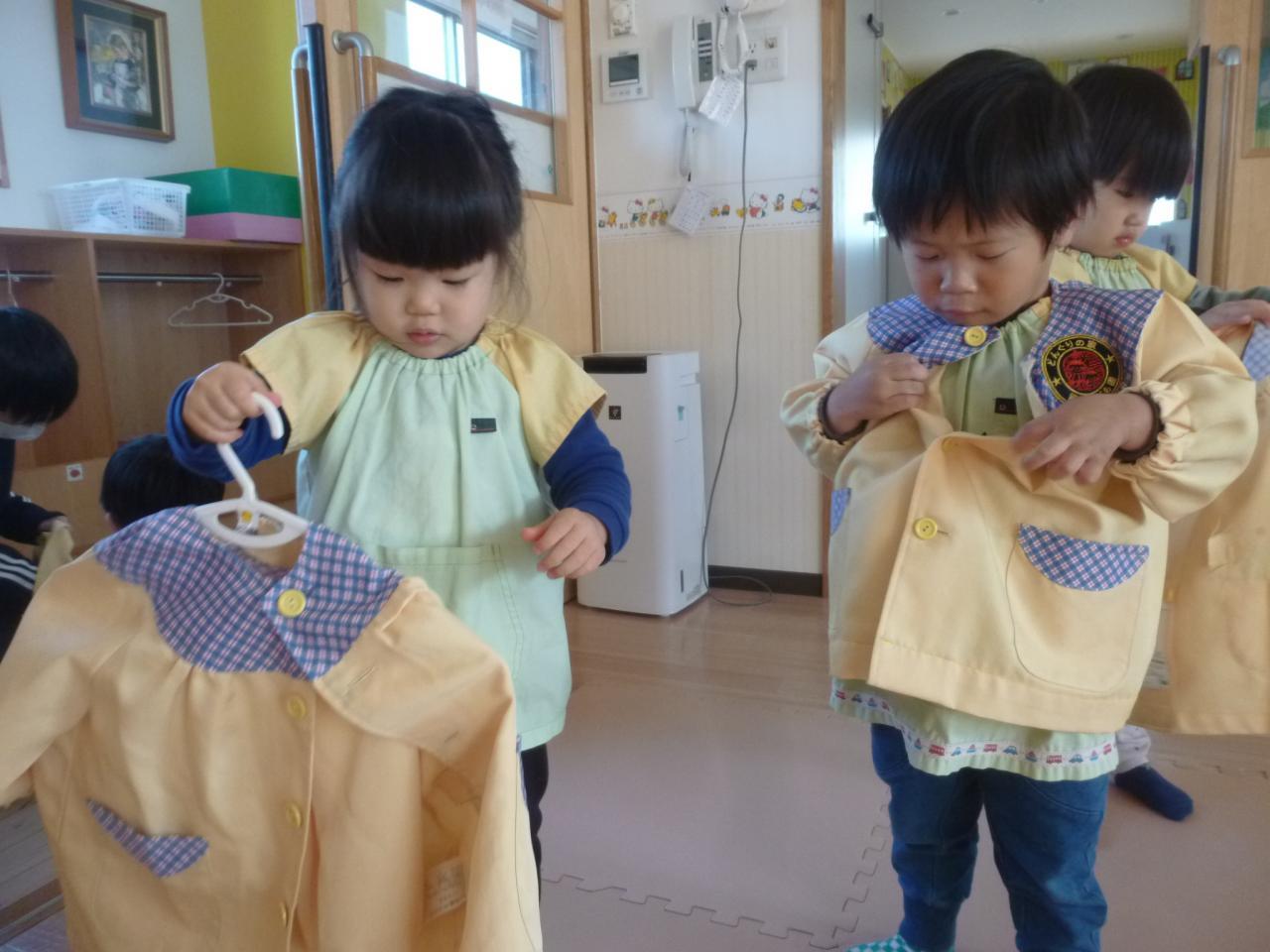 次はスモックを脱ぎます🔥最近では、ハンガーに挑戦中🙂まだまだ苦戦する子もいますが、「できない」などといわずに黙々と頑張っています