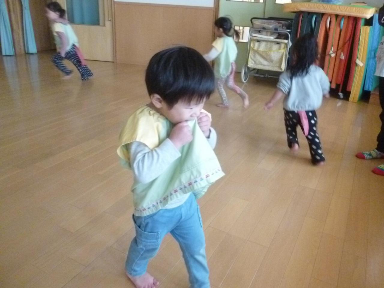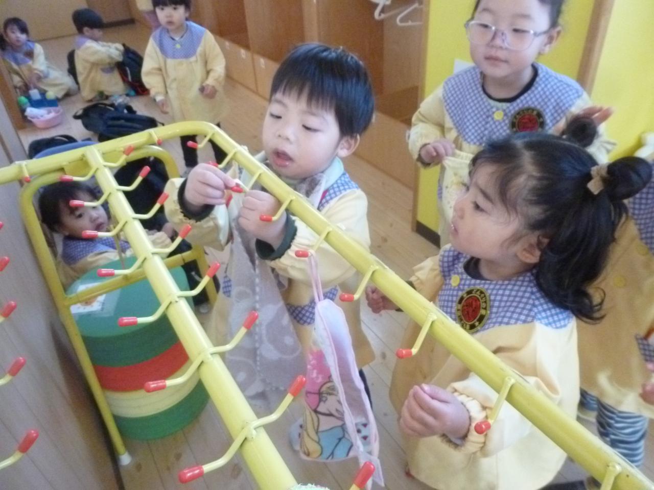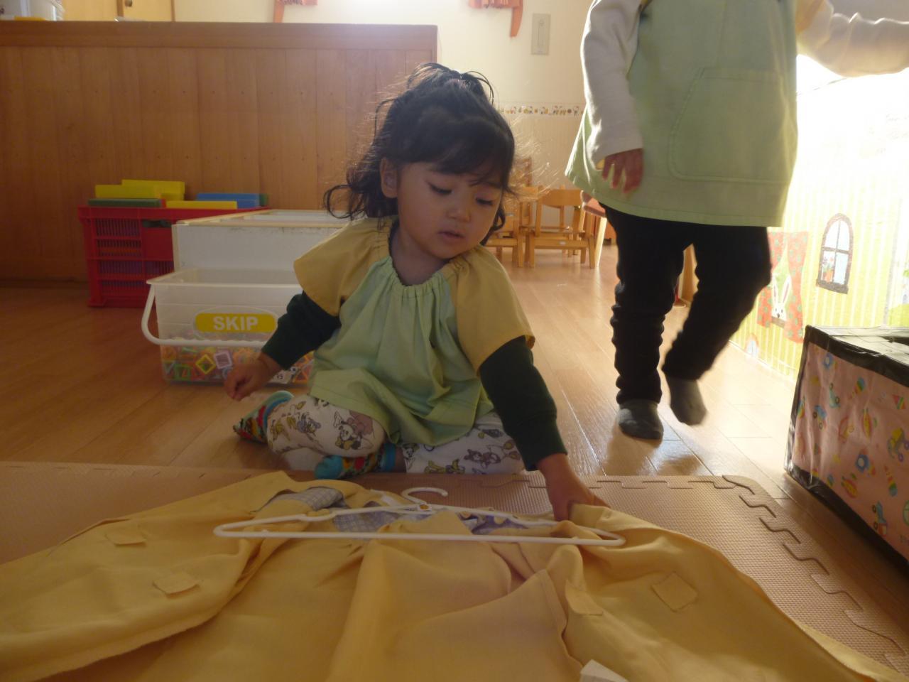 次はスモックを脱ぎます🔥最近では、ハンガーに挑戦中🙂まだまだ苦戦する子もいますが、「できない」などといわずに黙々と頑張っています