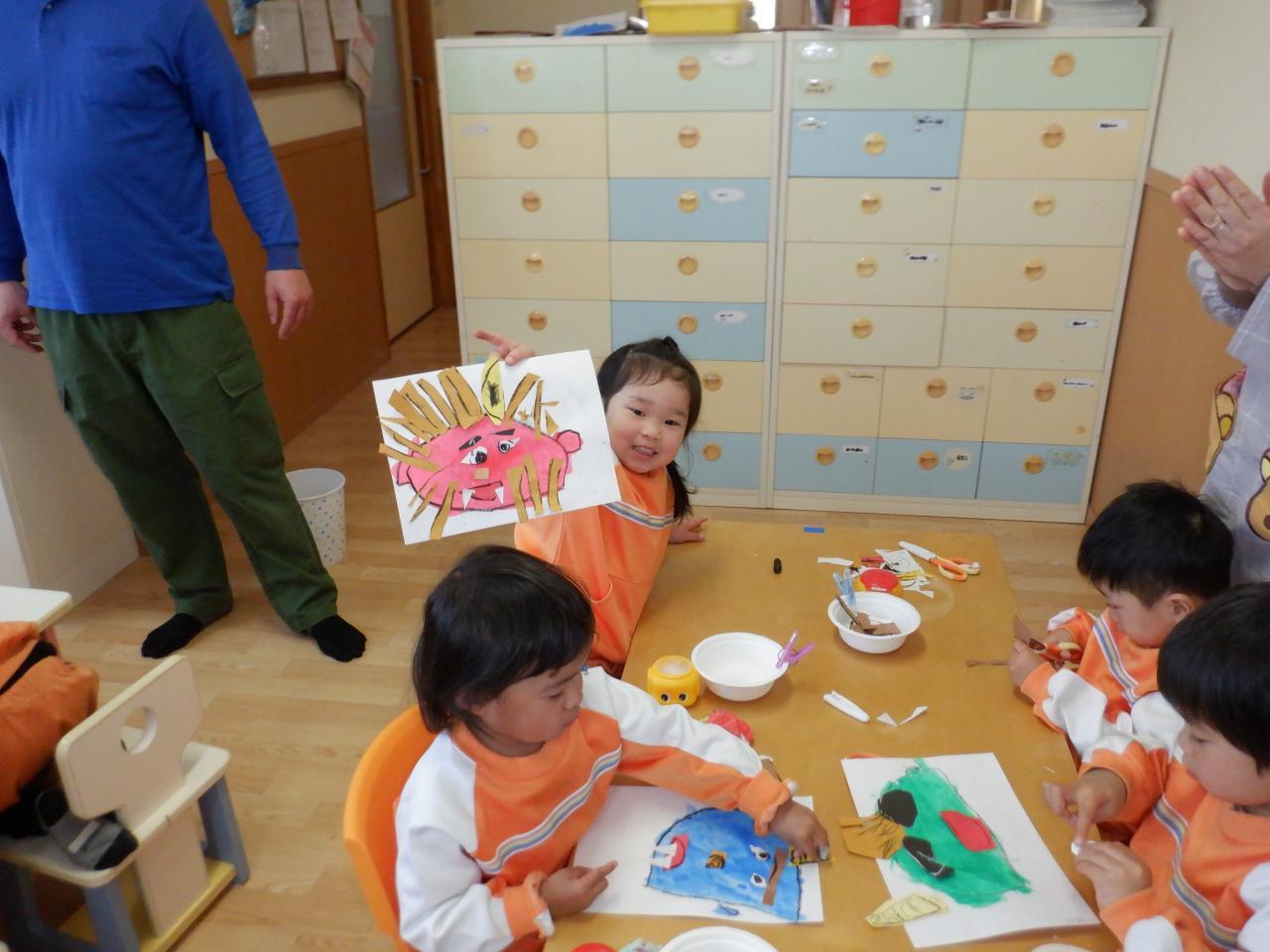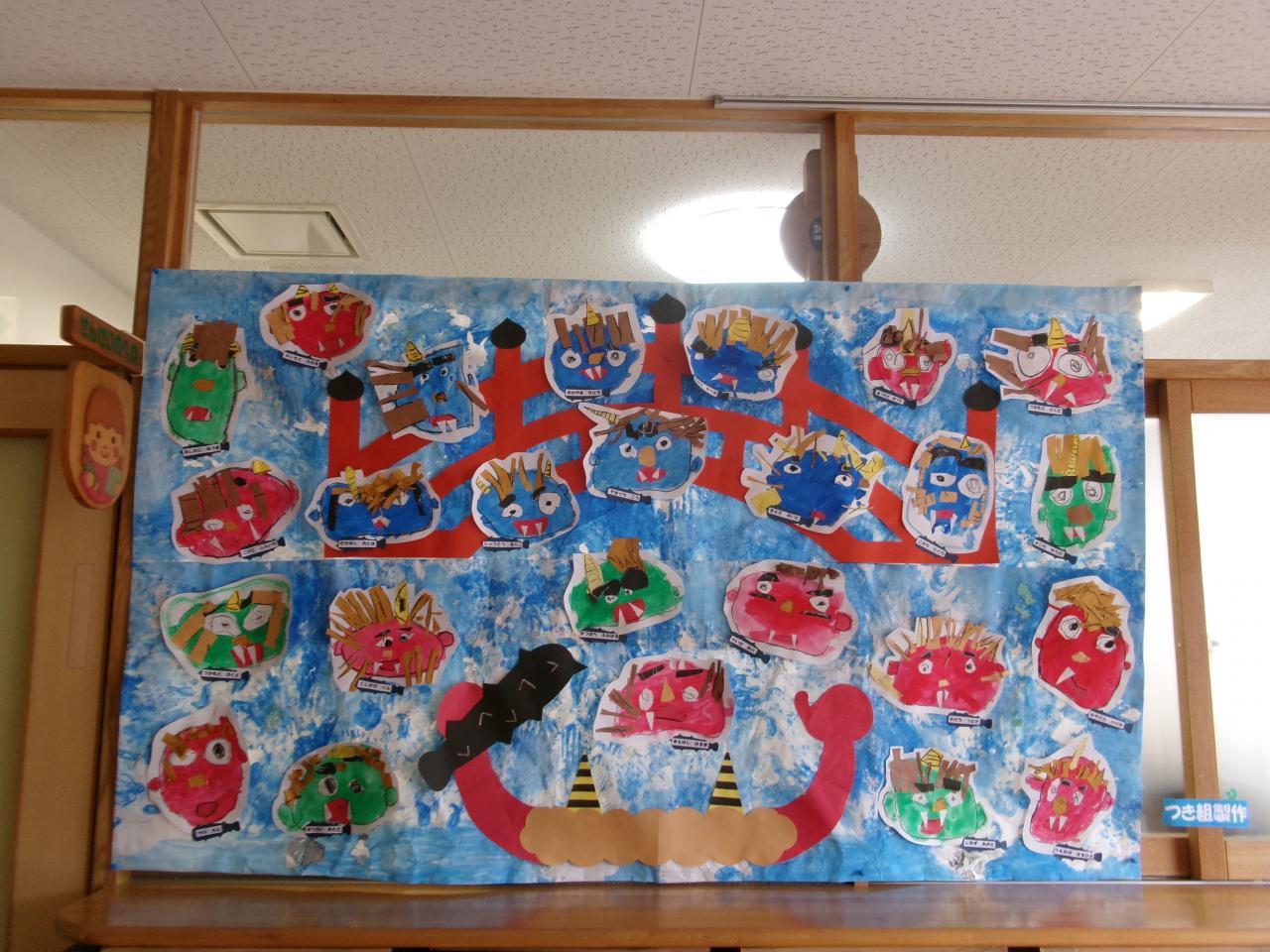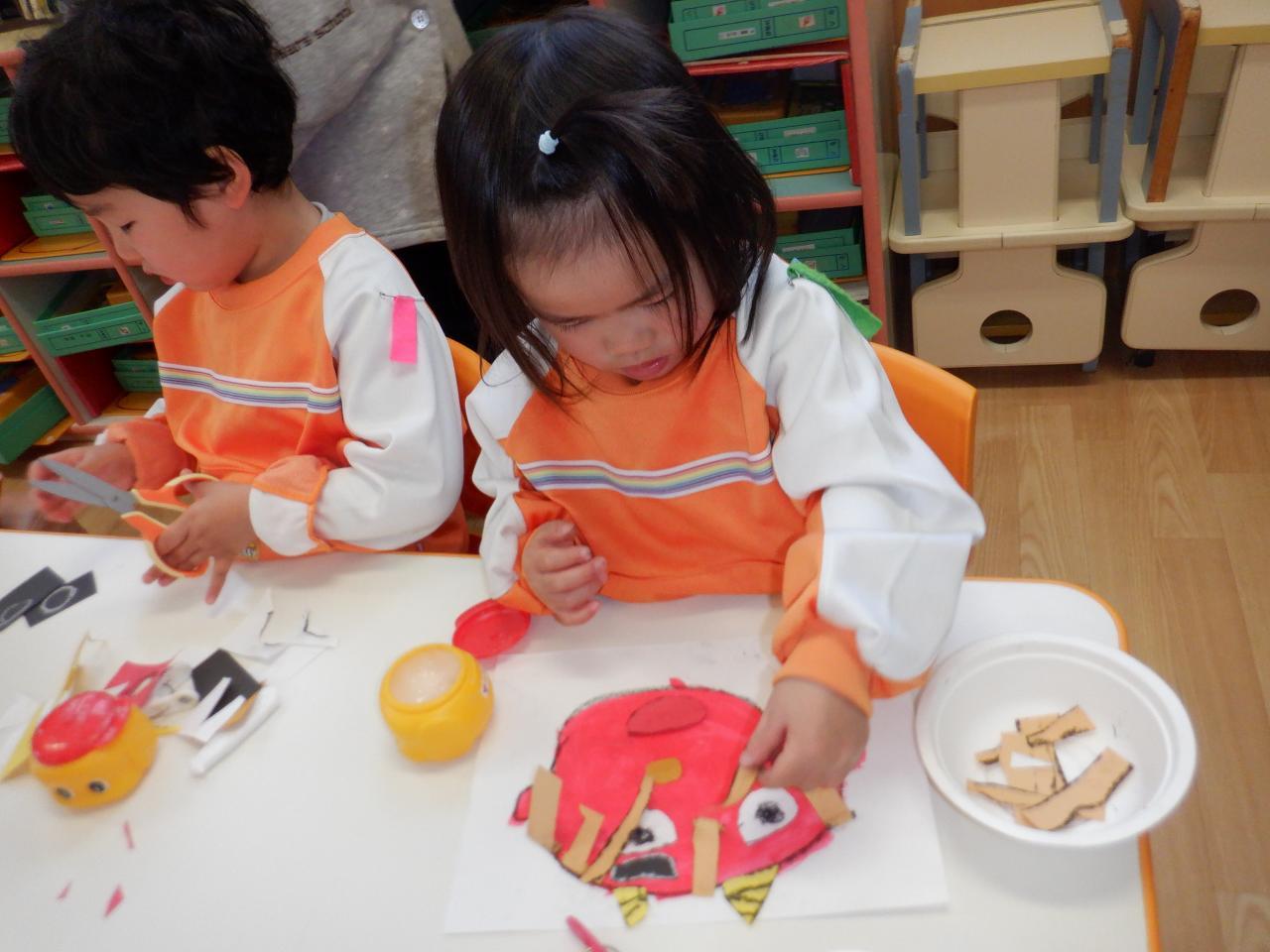製作では、節分ということや、オペレッタで『だいくとおにろく』の練習をしていて鬼に親しみの気持ちをもっていたことから鬼の製作に取り組みました。
