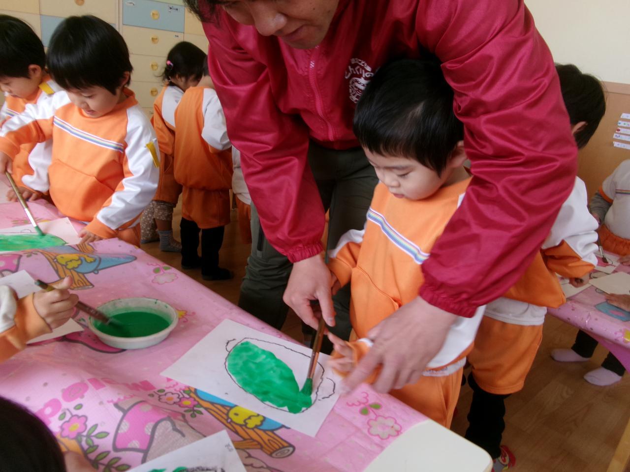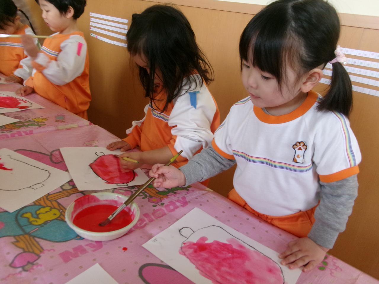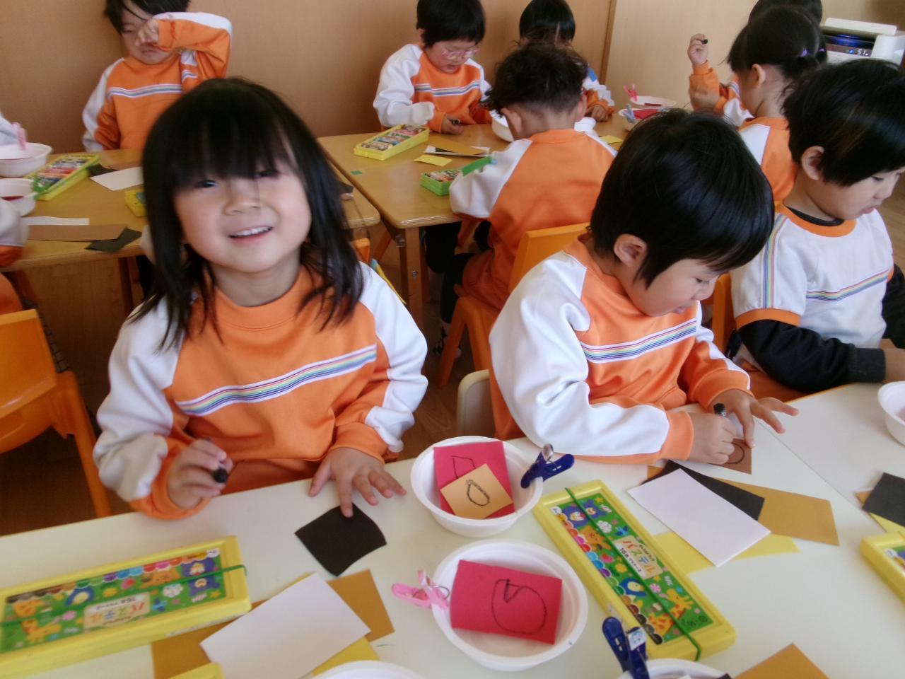 製作では、節分ということや、オペレッタで『だいくとおにろく』の練習をしていて鬼に親しみの気持ちをもっていたことから鬼の製作に取り組みました。