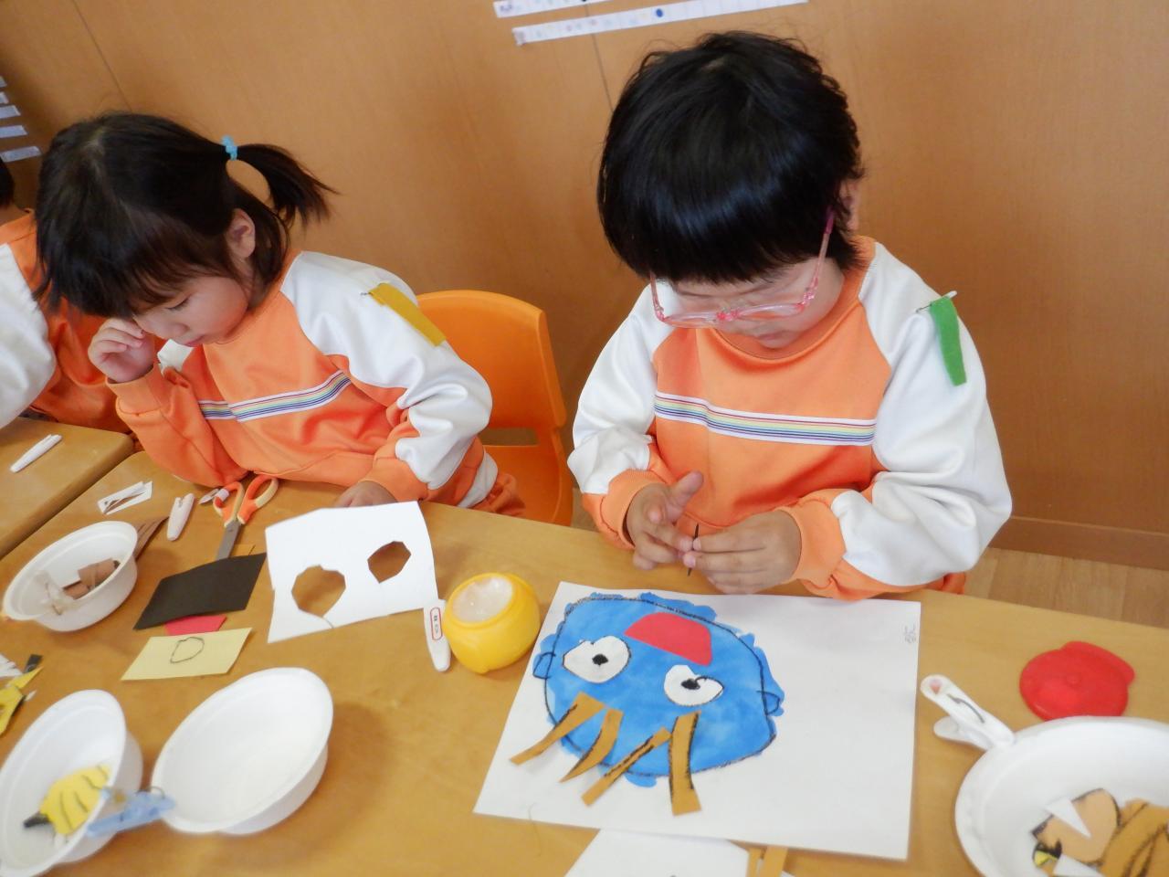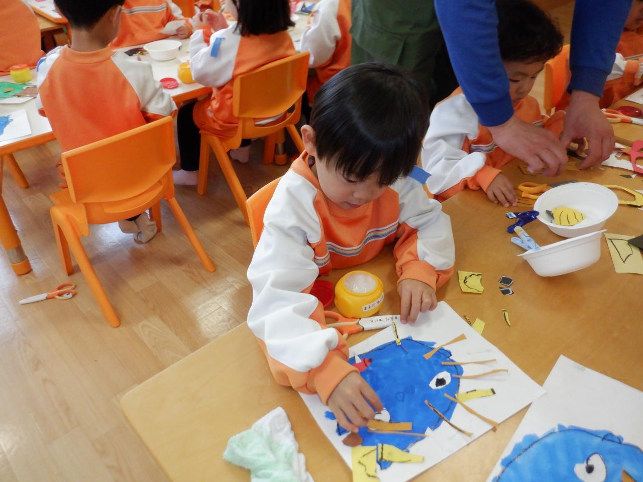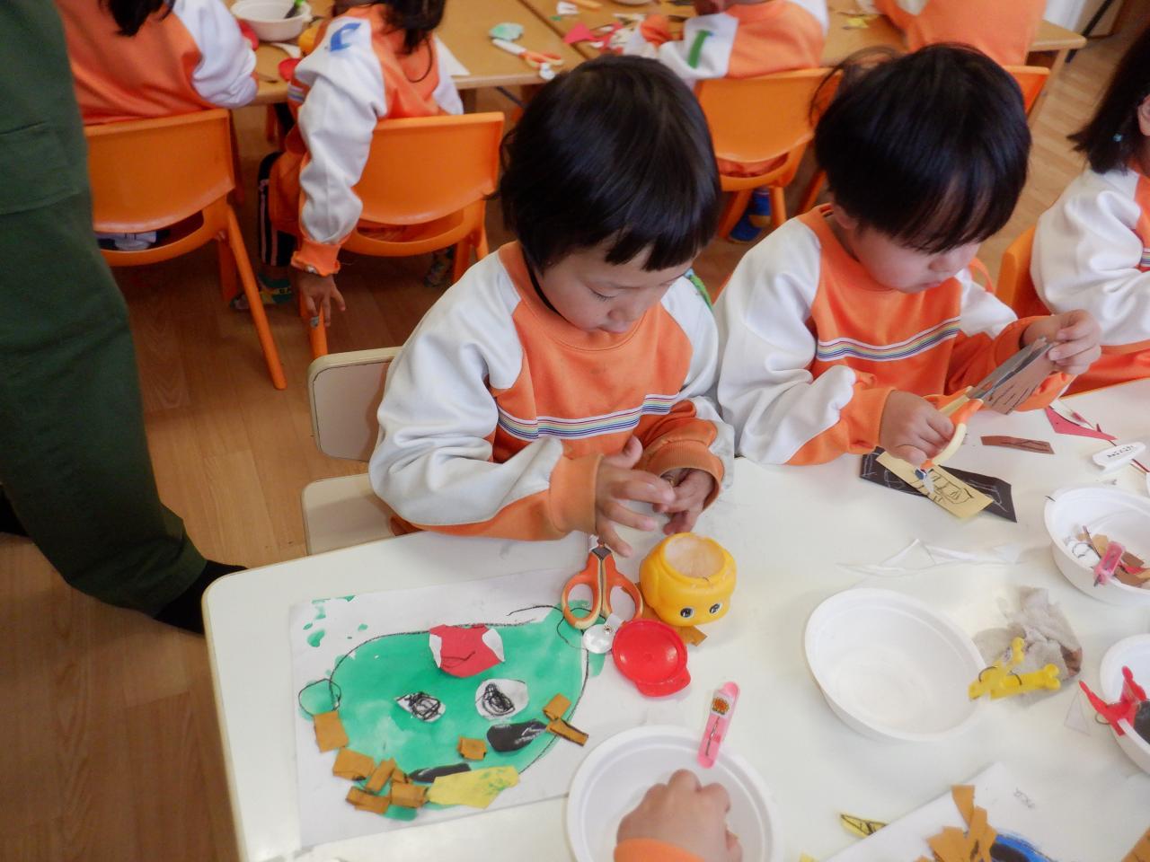 切ったパーツを貼っていくのでは、自分で貼る場所を決めながら楽しそうに貼り進めていく姿が見られ、個性豊かな作品が完成しました😄
