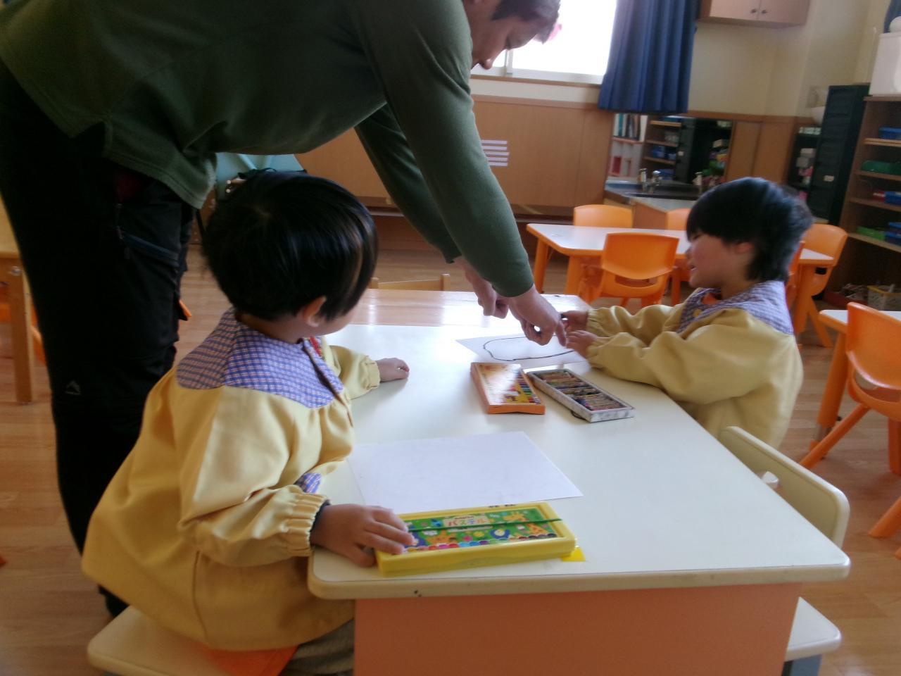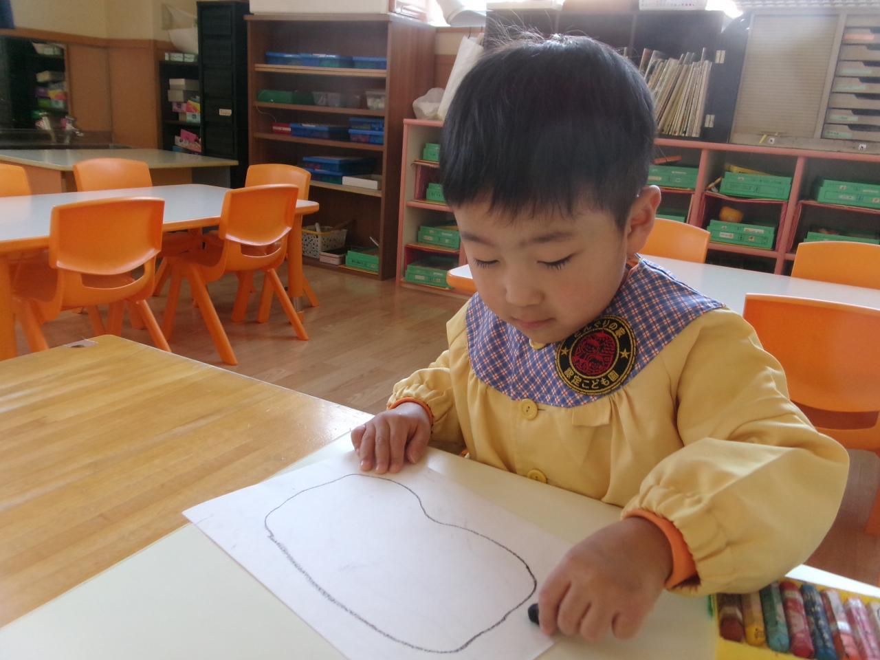 まずは、鬼を描いていきます🙂「大きな丸で顔を描くよ~」「耳もあるよね?」と保育者の話を聞きながら、まねをして顔を描いていきます。皆、話を聞きながら上手にできていました😄