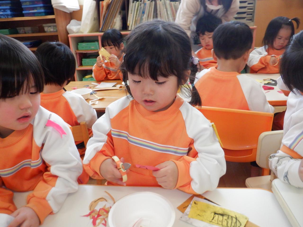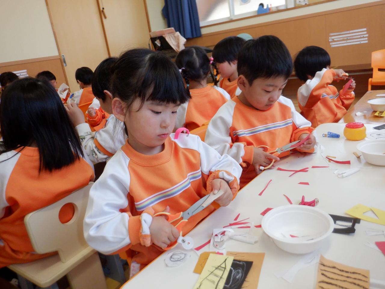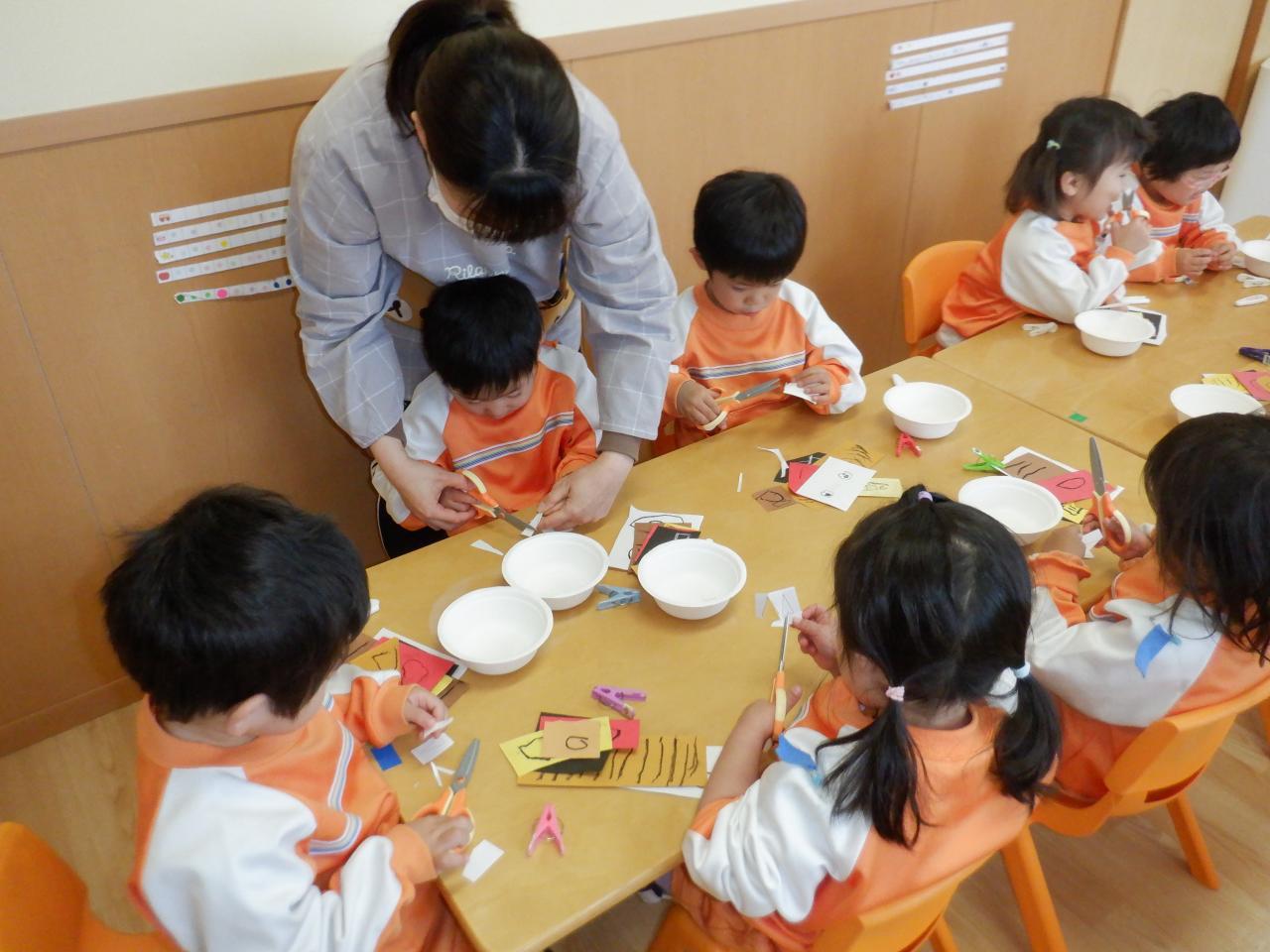また鬼の髪の毛では、保育者から「クルッとまるめてみてもいいよ」とアドバイスされると、さっそく取り組んでいる子の姿も見られました🤩