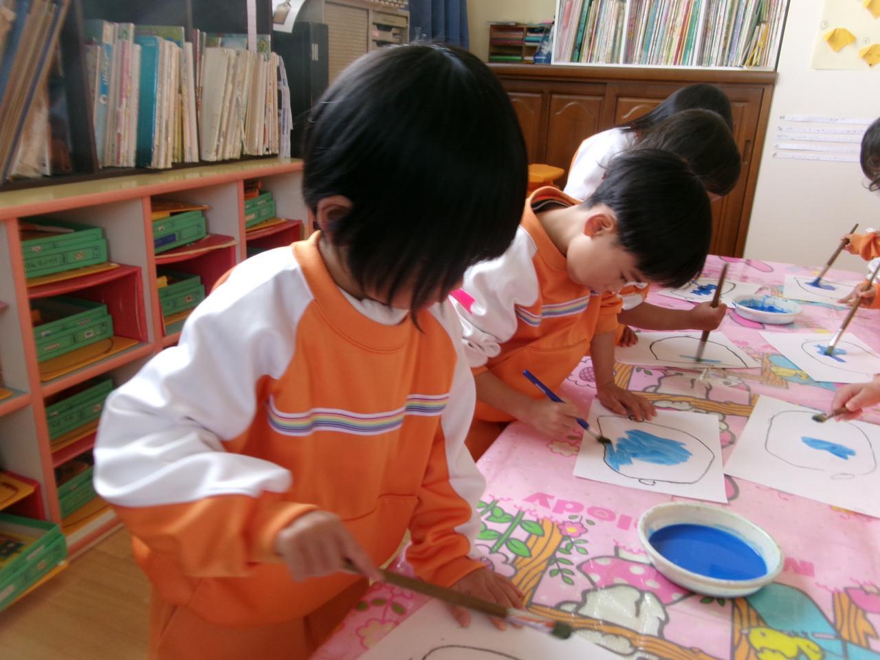 顔やパーツを描いた後は、顔の色を塗っていきます!事前にそれぞれ何色にするのか聞いて、子ども達の好きな色で塗り進めていきました😄