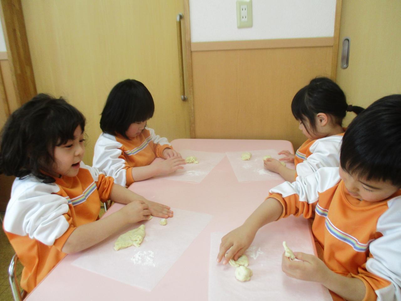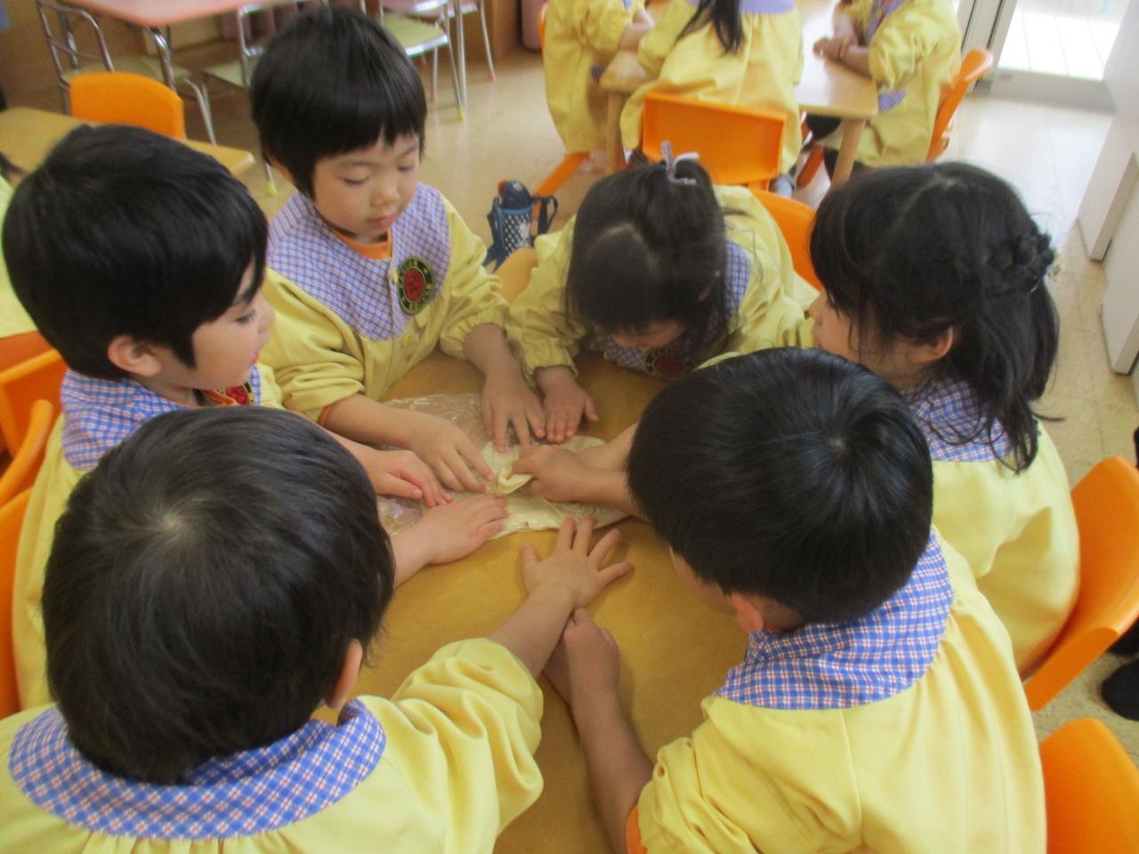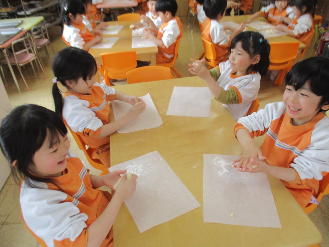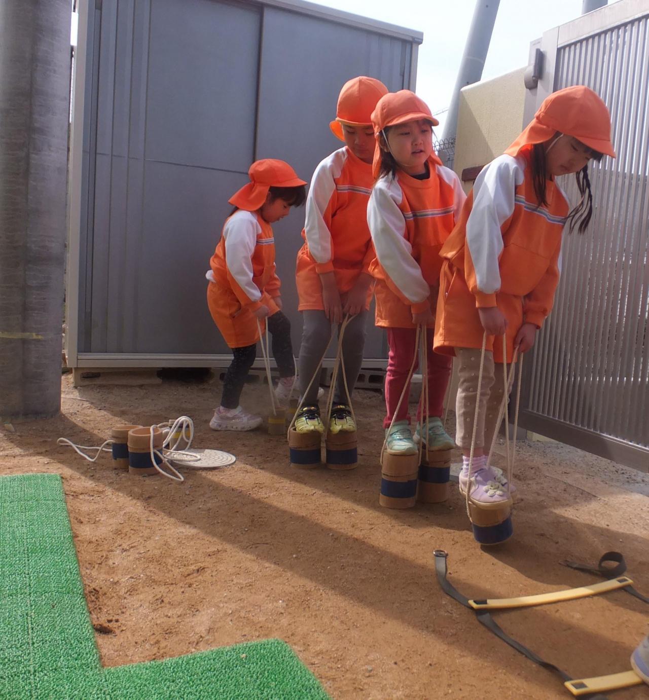 他にも、そら組さんの姿を見て、竹ぽっくりに挑戦する子もいて、ゴールを決めて最後まで足がつかないように歩くのを目標に頑張っています。