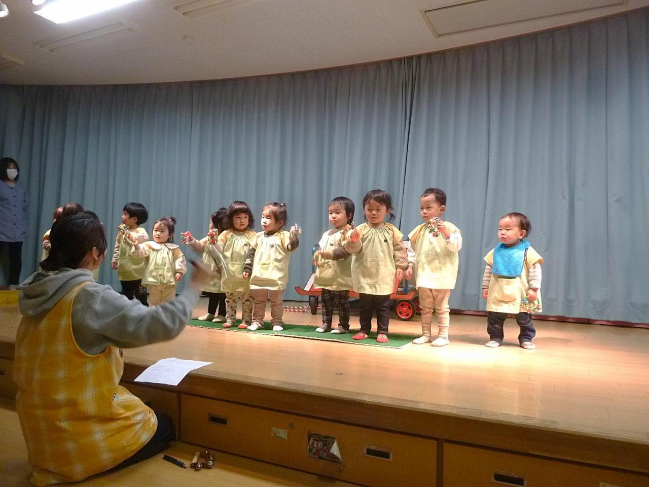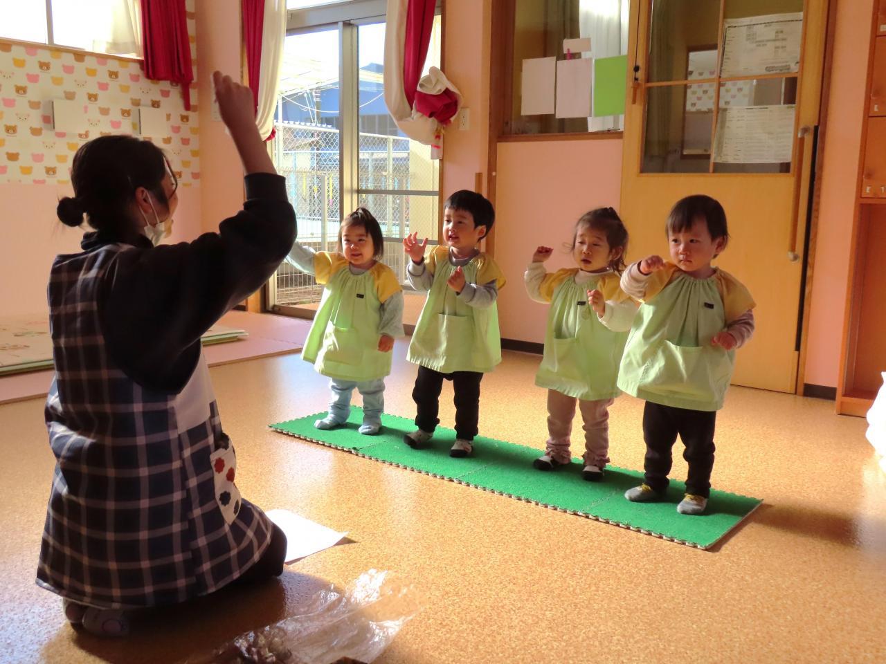 登場の「♪うんとこどっこいしょ、おもたいな~」から最後の「♪きらきら星」までの3つの歌。子ども達は練習をするにつれ歌や手遊びが大好きになり楽しみながら練習ができたので段々と大きな声が出るようになってきたり手遊びを大きく出来るようになりこちらも嬉しい気持ちになりました🌷