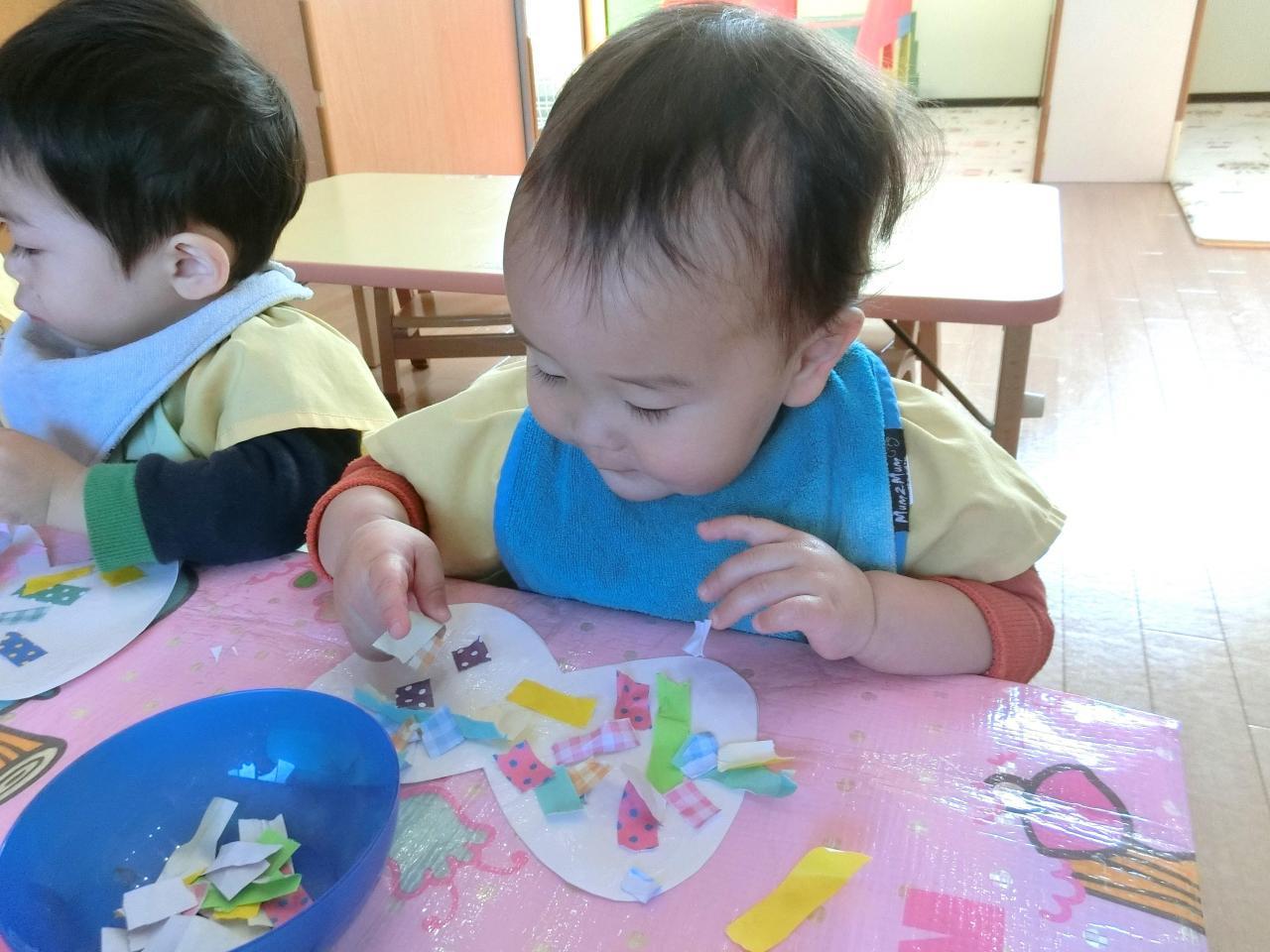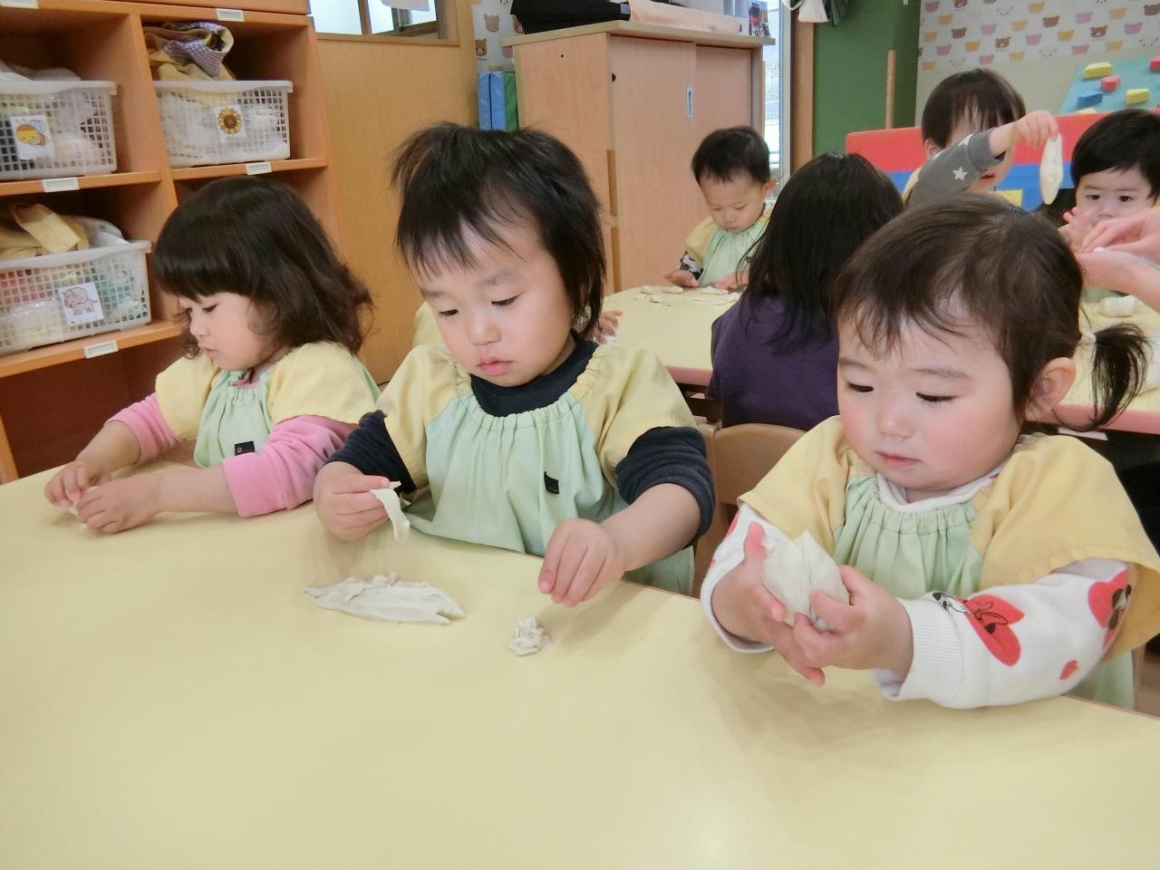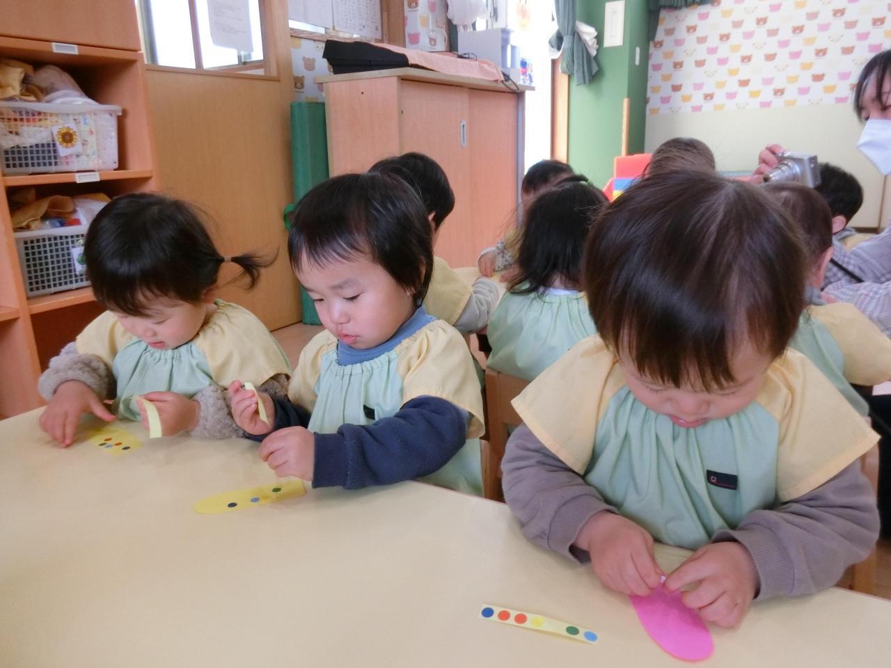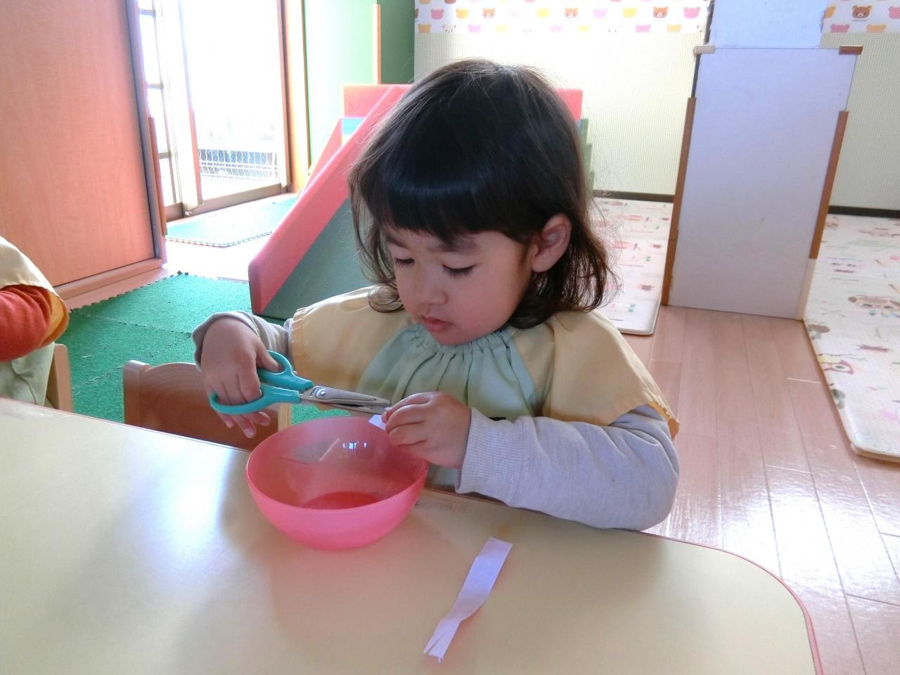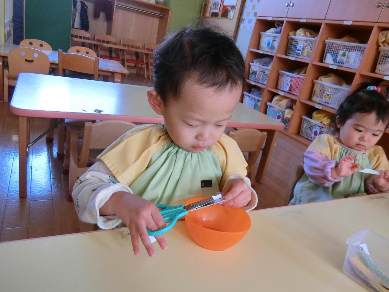 低月齢児は紙破りをし、高月齢児ははさみの一回切りに挑戦❗