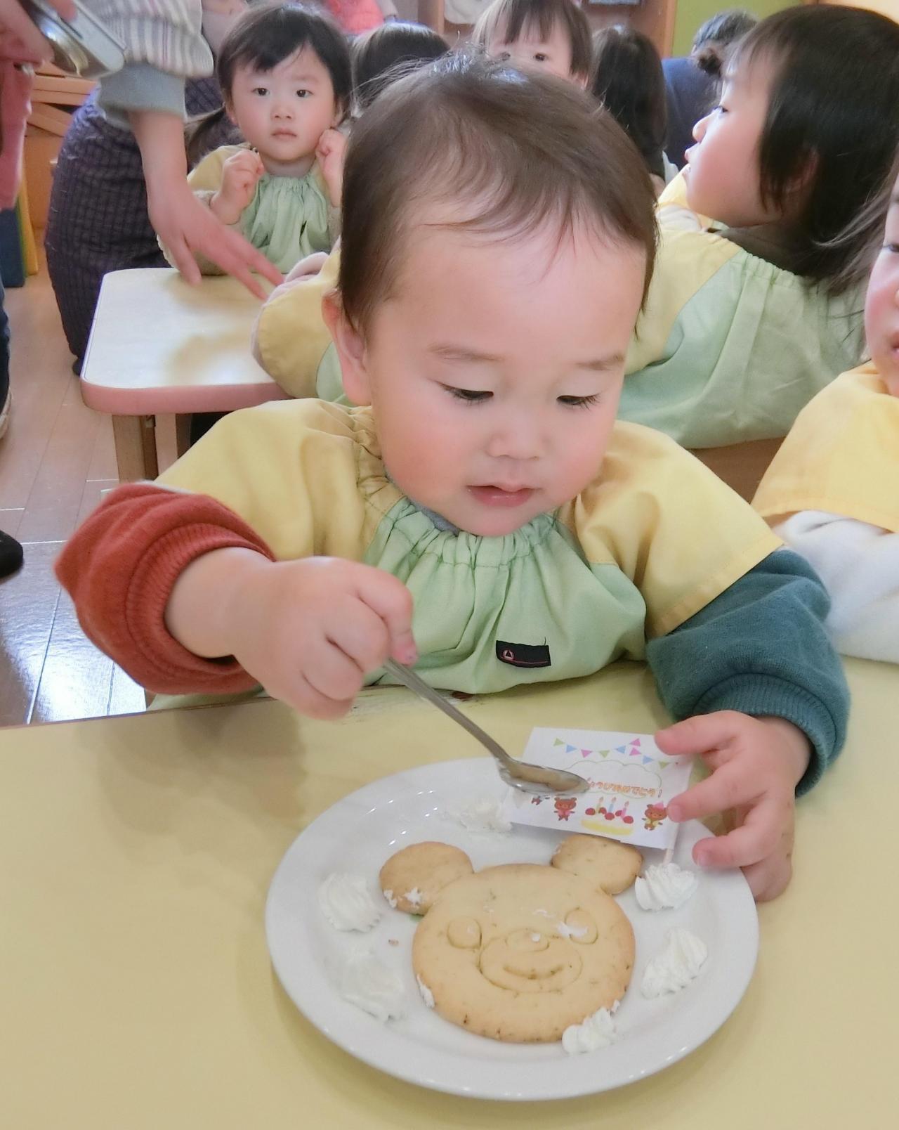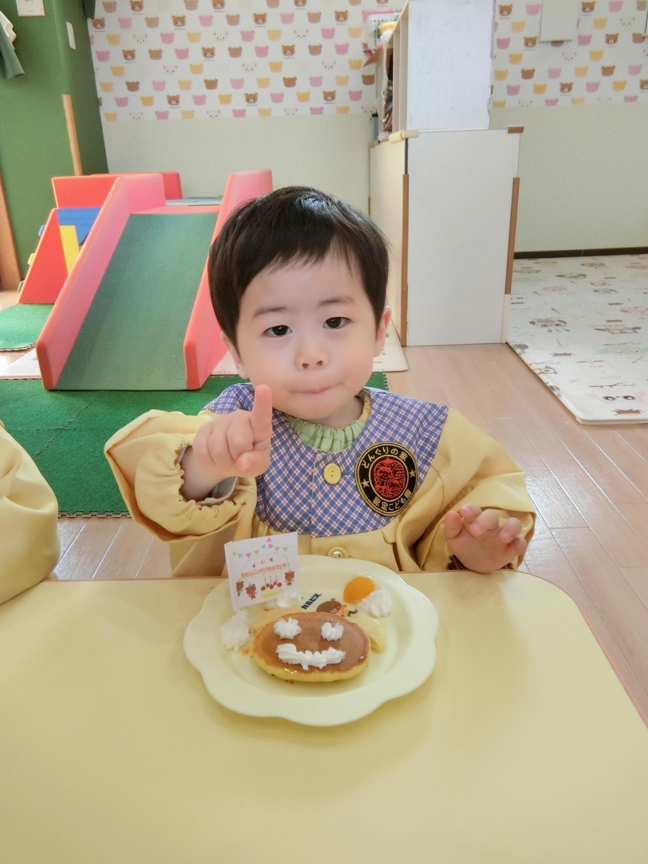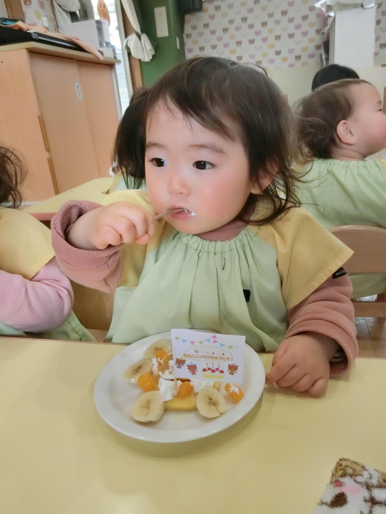 みんなにお祝いの歌を歌ってもらい恥ずかしそうにしながらも喜んでおやつを食べる姿がかわいらしいです💕