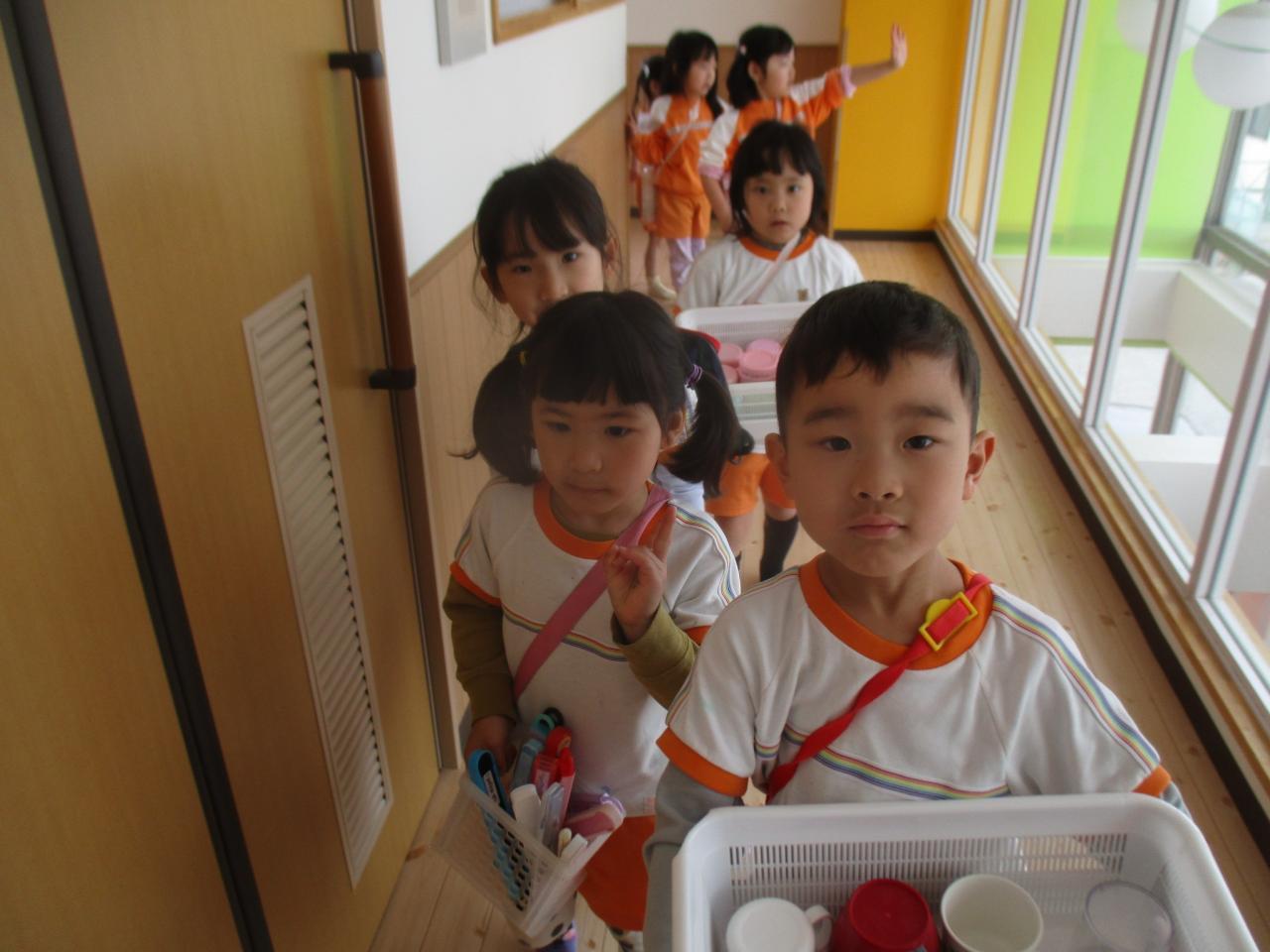 また、日々のお当番活動(お箸とコップ運び)も、お当番同士で声を掛け合い取り組もうとする姿が見られるようになり、協力する力が少しずつ身についており嬉しく思います😄💕