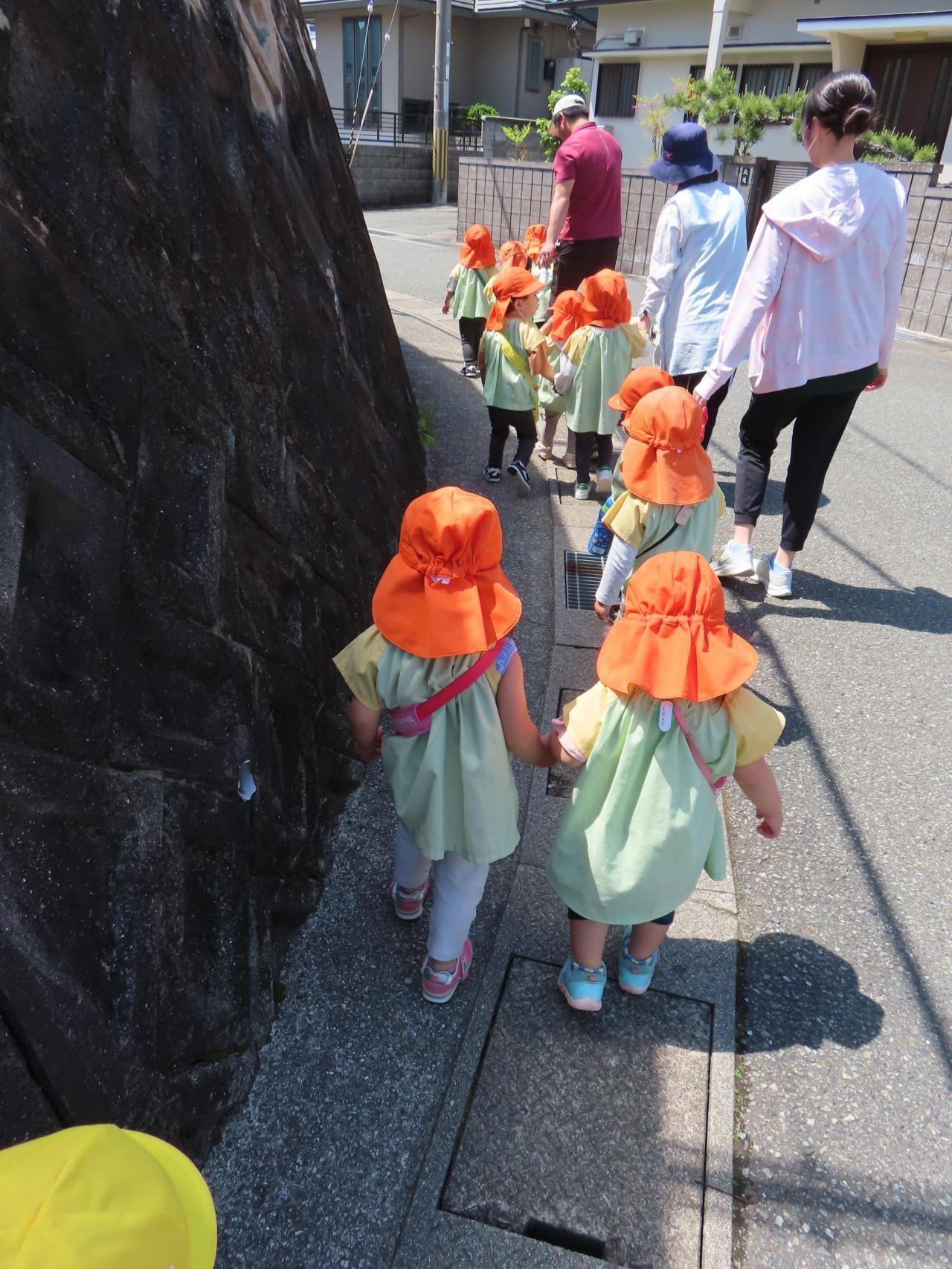 散歩中は、お友達や先生と手を繋いで、道の端を上手に歩くことができていました👏